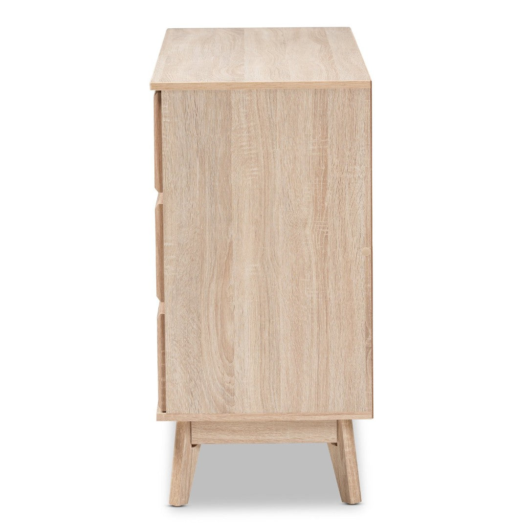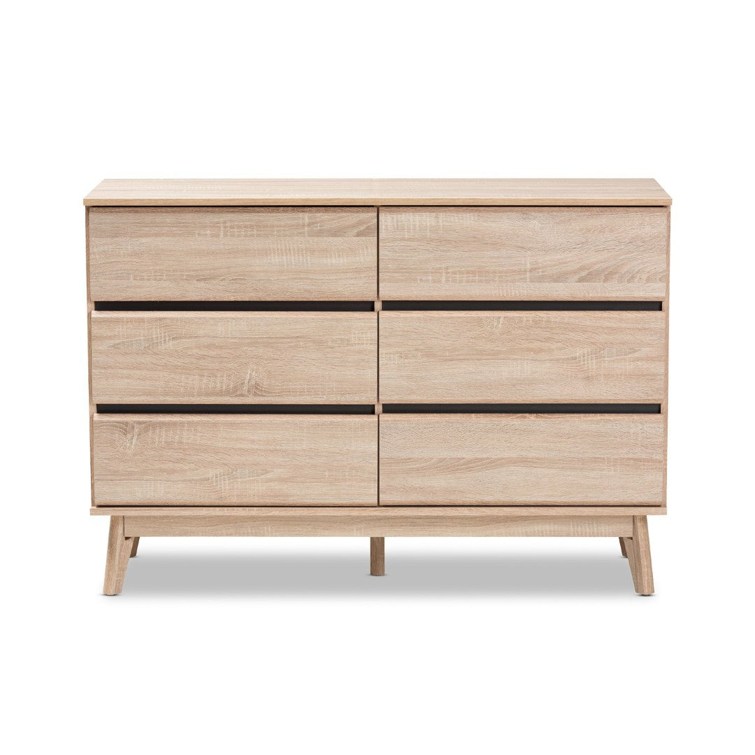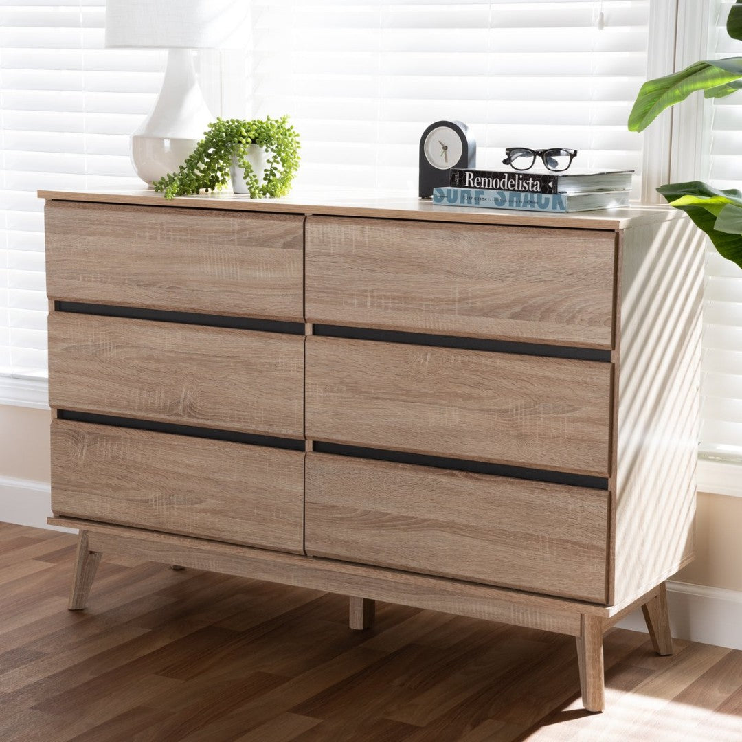 Bring mid-century modern elegance and practical storage to your bedroom with this streamlined 6-drawer dresser. The Miren dresser pairs a light oak finish with dark grey drawer accents for a subtle contrast, while tapered, angled legs and a clean silhouette keep the look airy and contemporary. Thoughtful details — from smooth sliding drawers to under-clearance for easy cleaning — make it both stylish and functional.