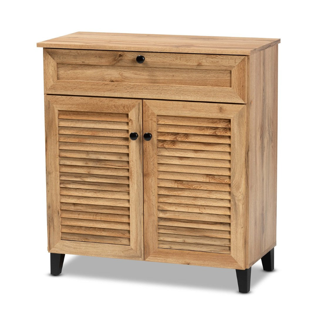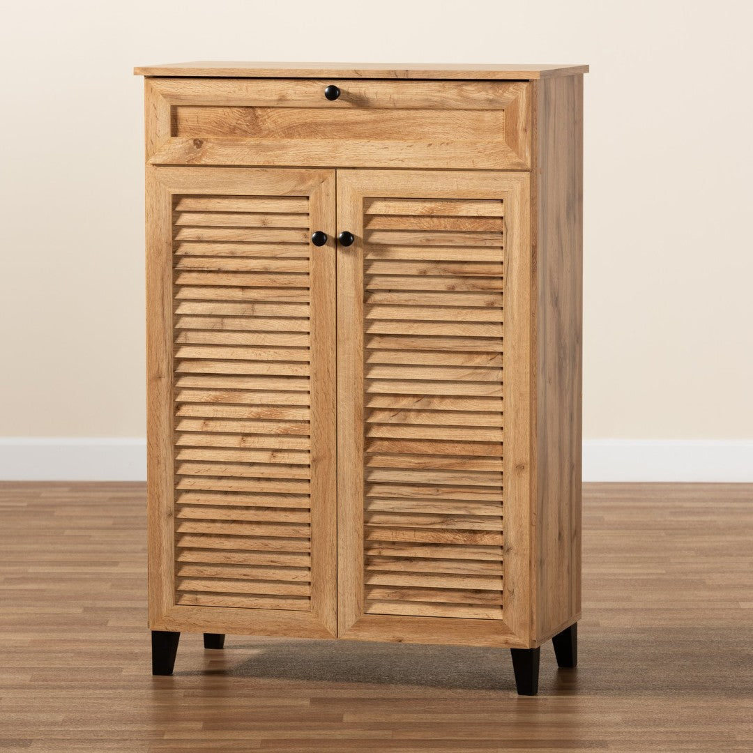 Bring order and style to your entryway with this modern wooden shoe cabinet. Designed with slatted doors and tapered legs for a contemporary silhouette, it combines concealed shoe storage with a roomy top drawer to keep everyday essentials neat and accessible. The neutral oak brown finish and clean lines make it a versatile piece for hallways, bedrooms, or living spaces seeking an uncluttered, sophisticated look.