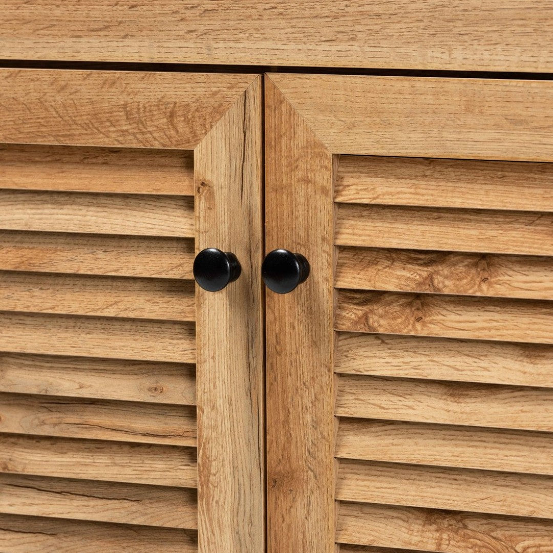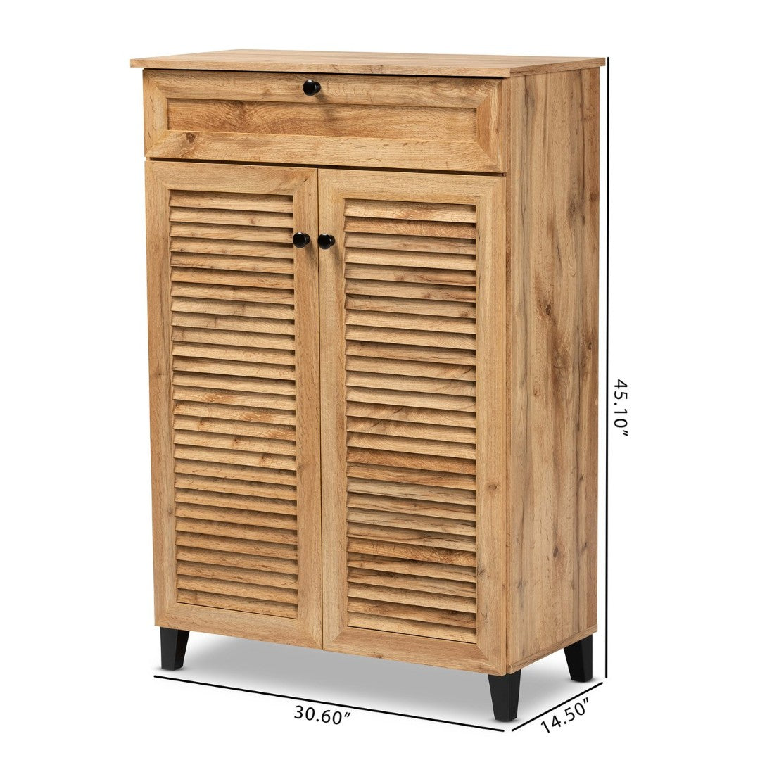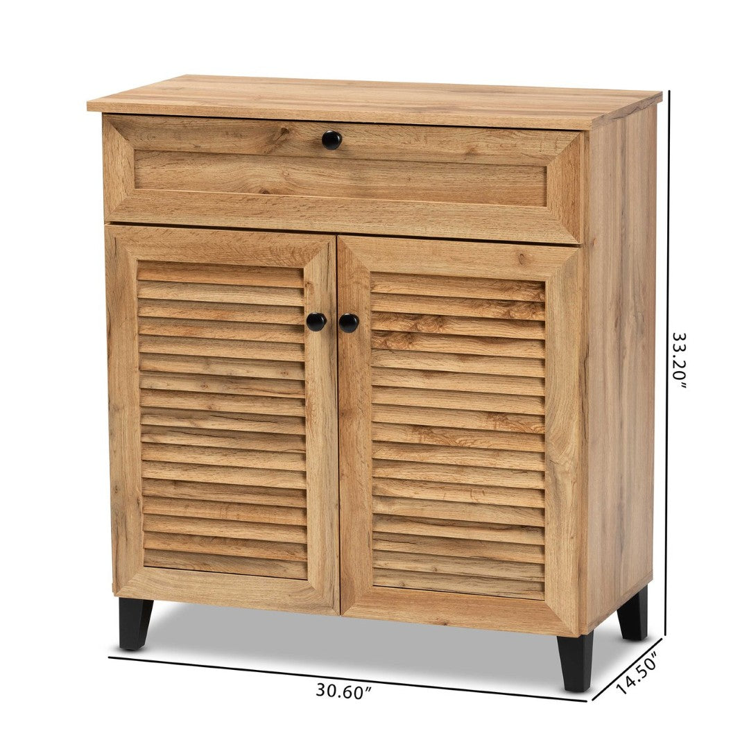 - Construction: Engineered wood with an oak brown finish for a durable, attractive surface; slatted doors allow ventilation to help keep footwear fresh.