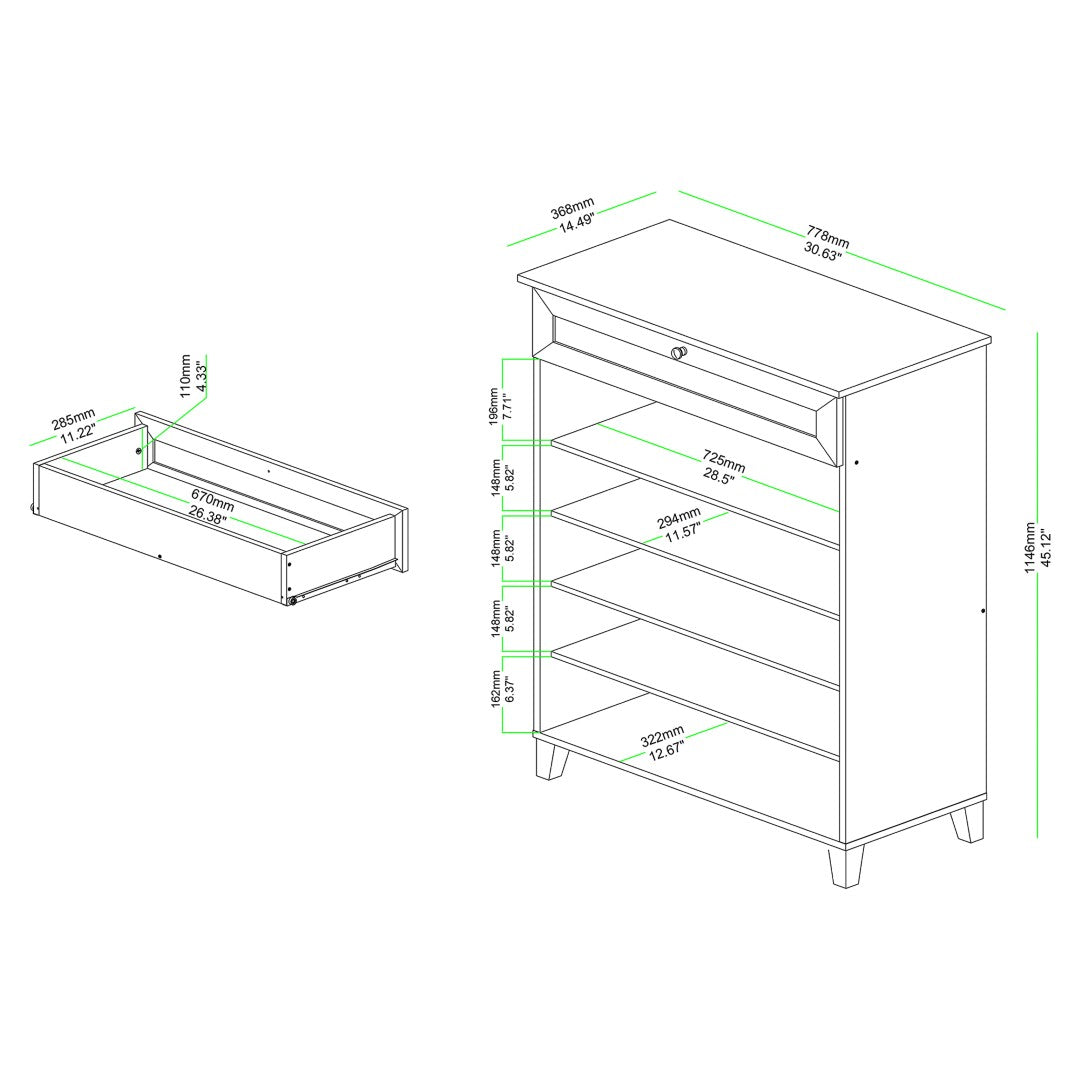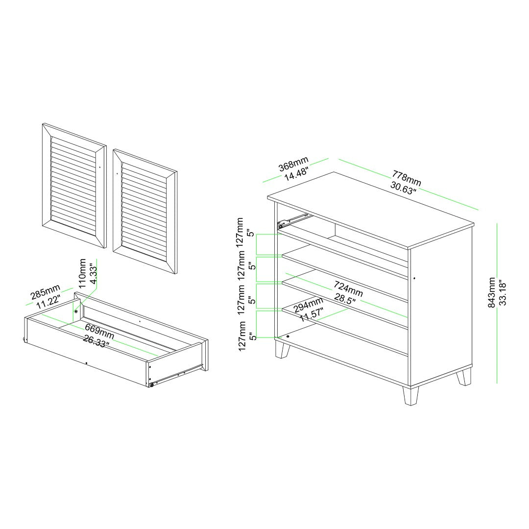 - Storage capacity: Four internal shelves behind slatted doors accommodate up to approximately 12 pairs of shoes (fits shoes under 12.75" in depth); plus one large top drawer for keys, socks, and small accessories.