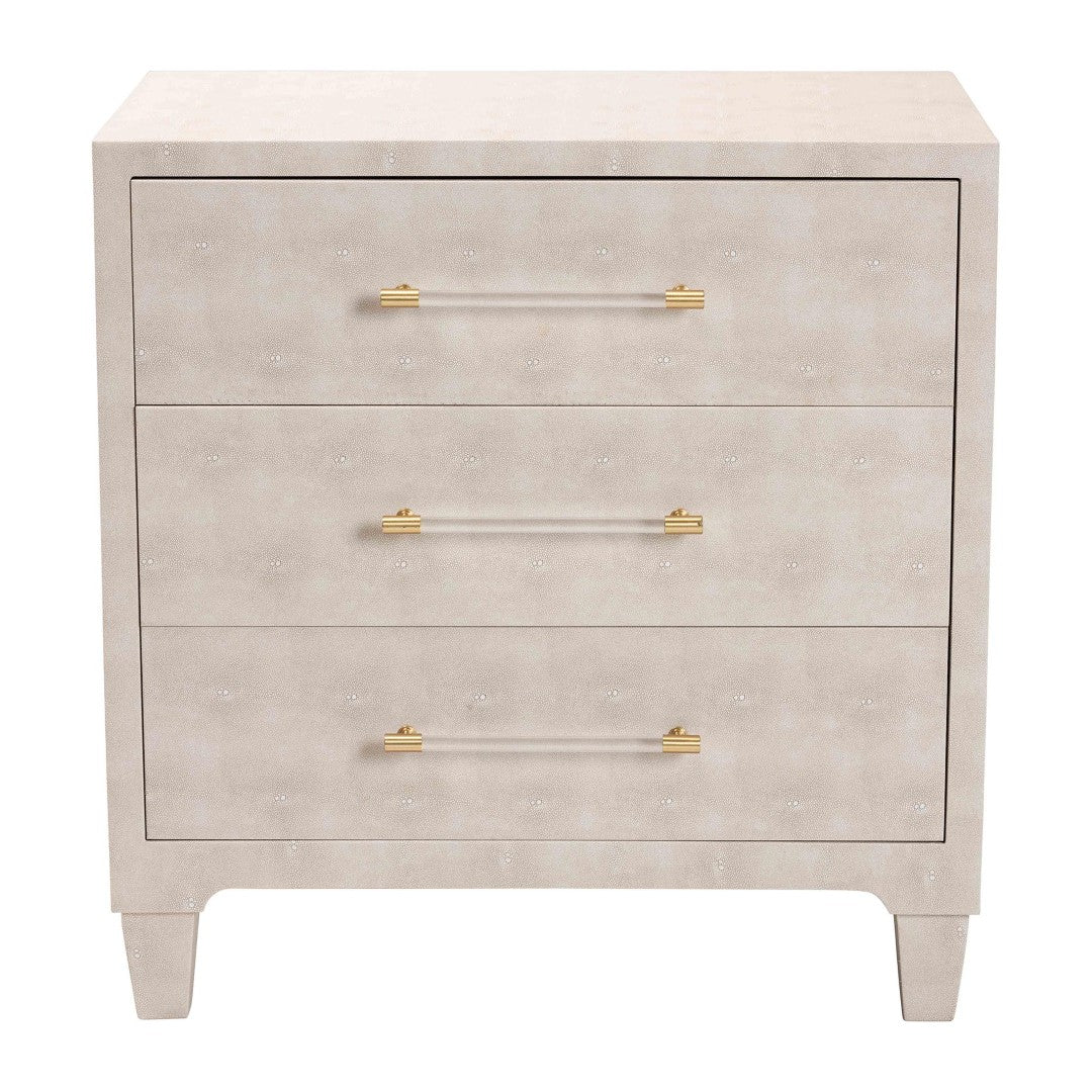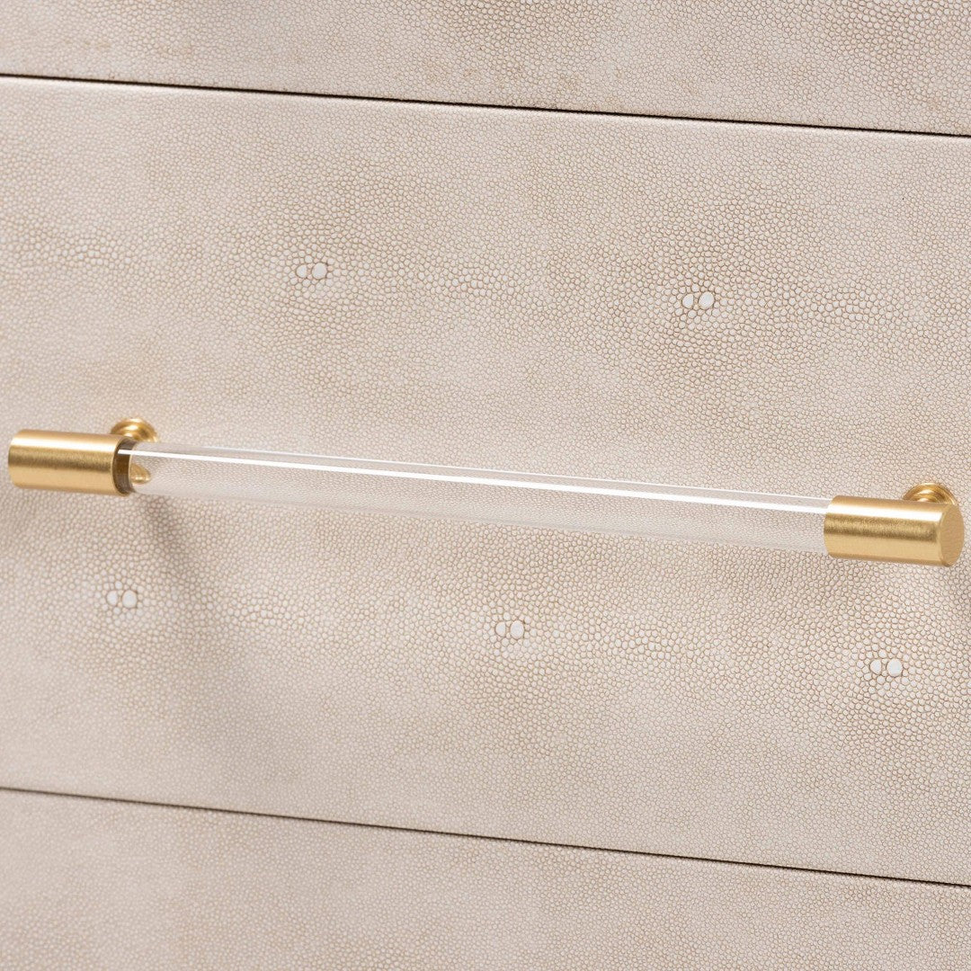 Elevate your living space with the Nira storage cabinet — a chic, modern piece that blends avant-garde texture with practical storage. Wrapped in luxe beige faux shagreen and detailed with sleek clear handles and tapered legs, this cabinet makes a stylish focal point while keeping everyday essentials neatly organized. It arrives fully assembled for immediate use and is designed to complement contemporary and transitional interiors.