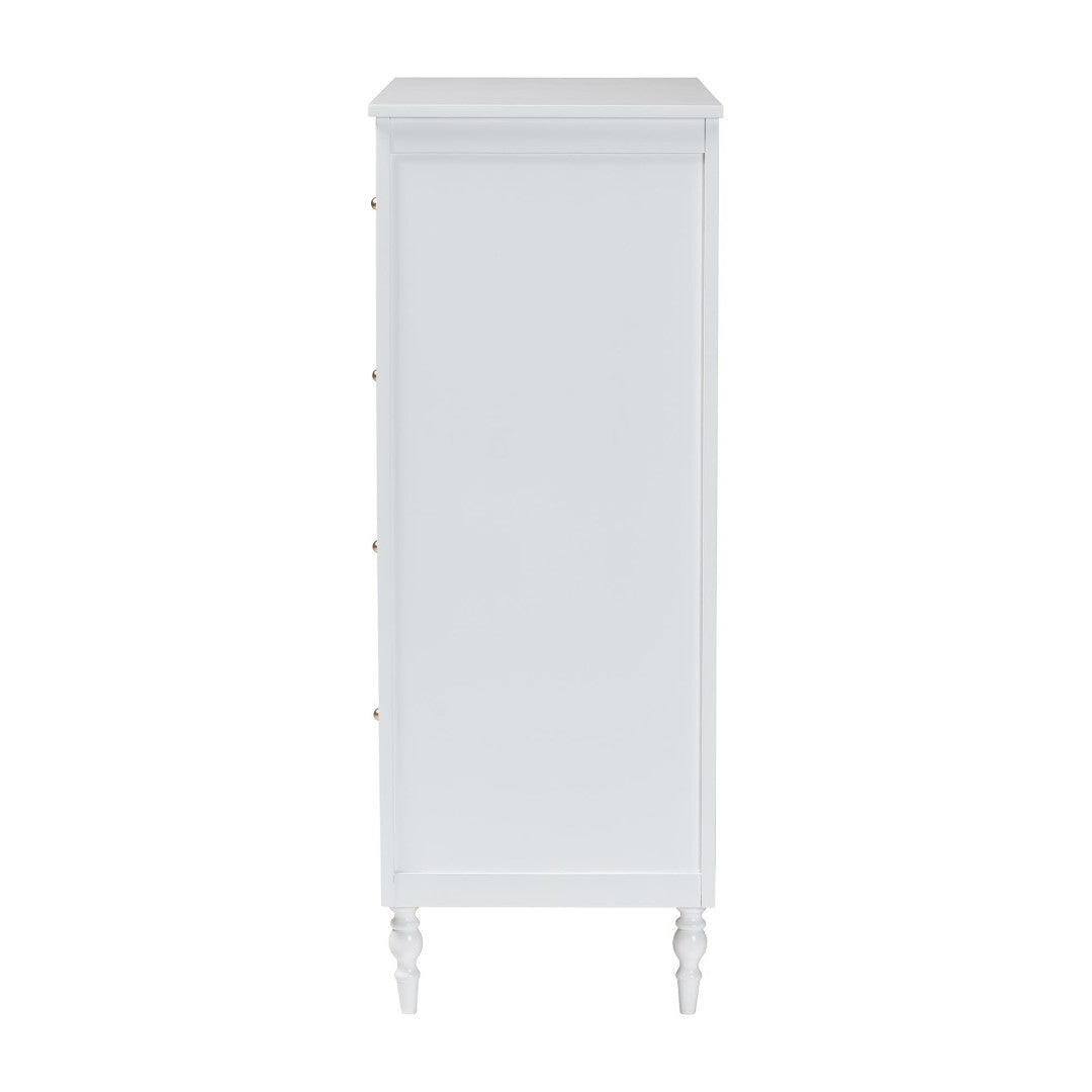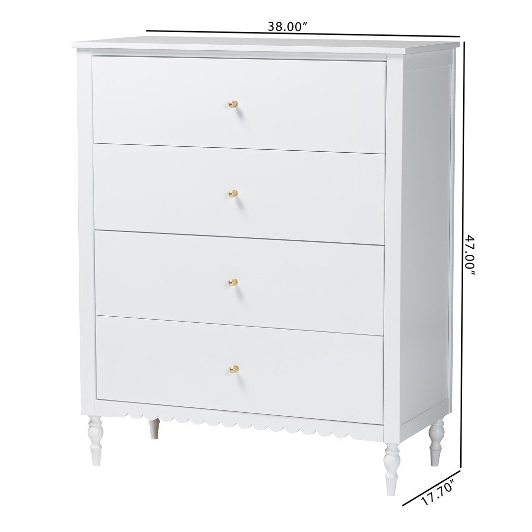 Bring a fresh, modern elegance to your bedroom with this bright white 4-drawer chest. Clean lines, scalloped trim and ring-turned legs combine contemporary artistry with traditional charm, while four wide drawers provide practical, organized storage for clothing, linens and accessories. The durable rubberwood and engineered wood construction ensures lasting stability, and tapered metal drawer pulls add a refined metallic accent against the crisp finish.