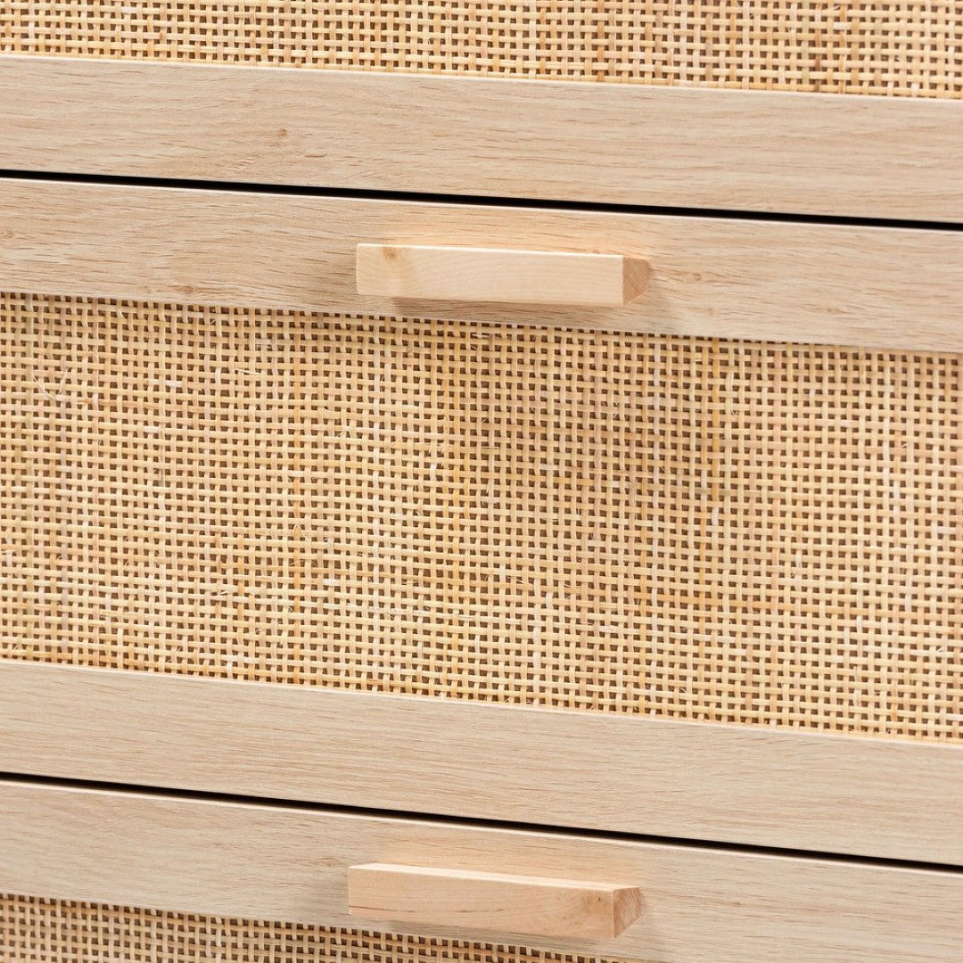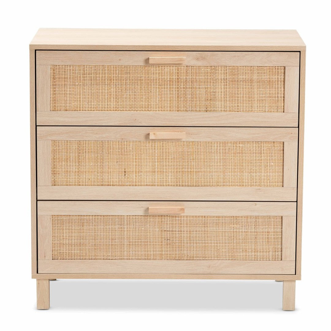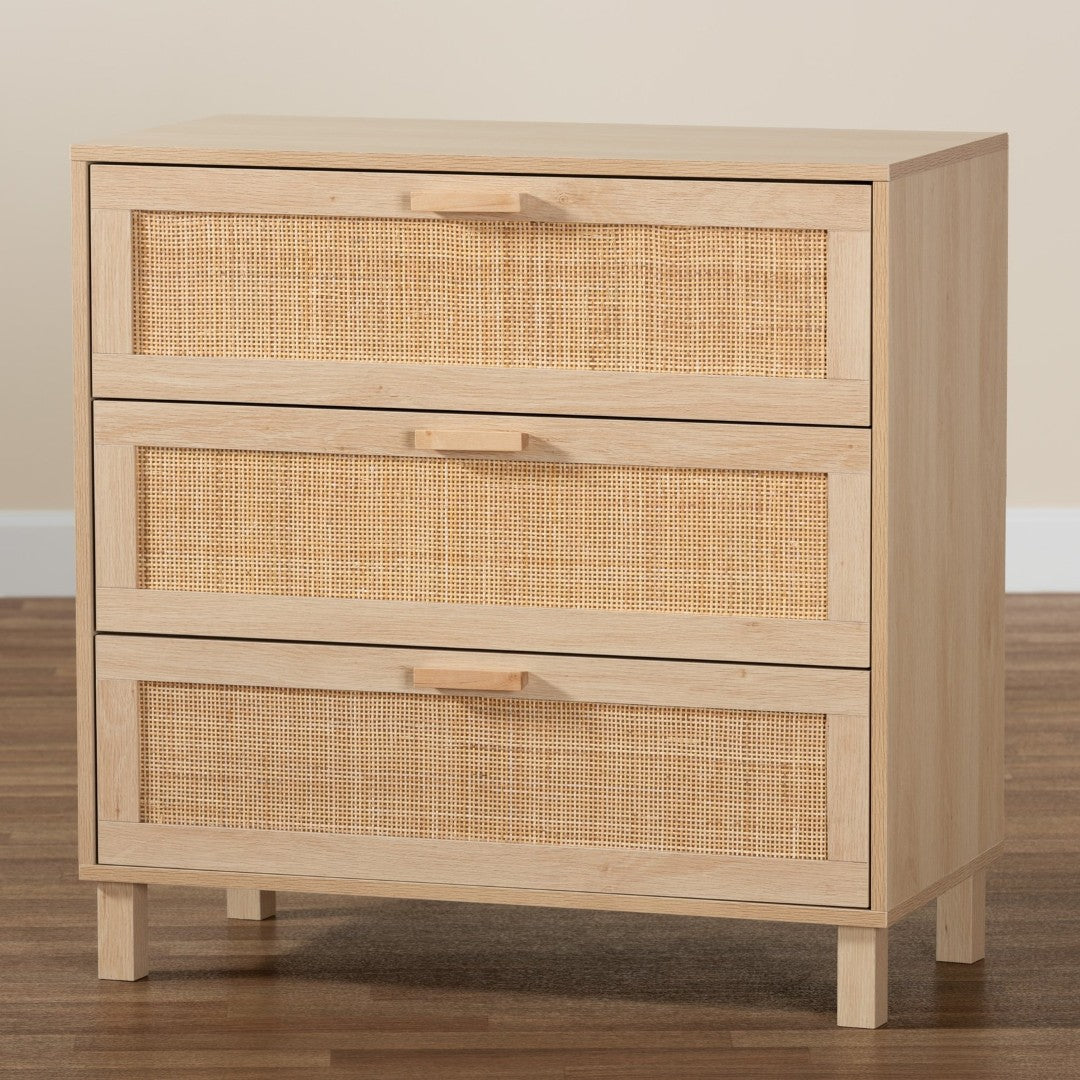 Bring mid-century warmth and practical storage to any room with this Sebille three-drawer cabinet. Clean lines, a light brown wood finish and natural rattan accents create a timeless look that complements modern, Scandinavian, or bohemian interiors. Built with thoughtful proportions and a sturdy frame, it offers organized storage for clothing, linens, or household items while the included anti-topple kit enhances safety in homes with children.