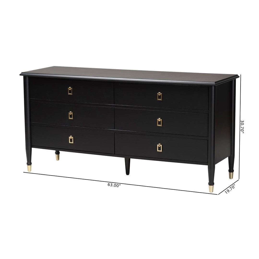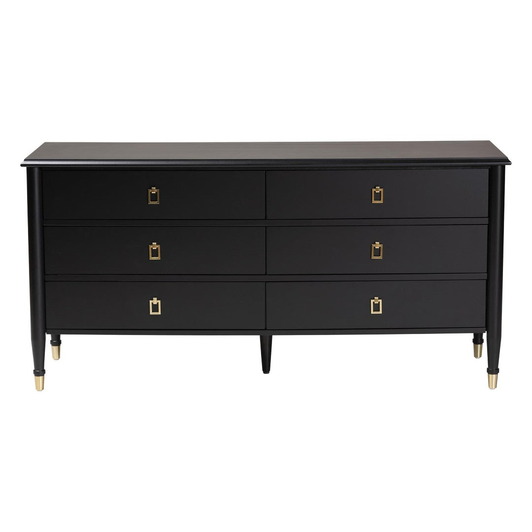 Elevate your bedroom with the Tamra dresser — a modern-transitional storage solution that pairs art-deco sophistication with everyday practicality. Crafted from durable rubberwood and engineered wood, this six-drawer dresser offers generous organized storage while its tapered legs, metallic accents, and rounded posts create a refined silhouette that complements a wide range of interior styles.