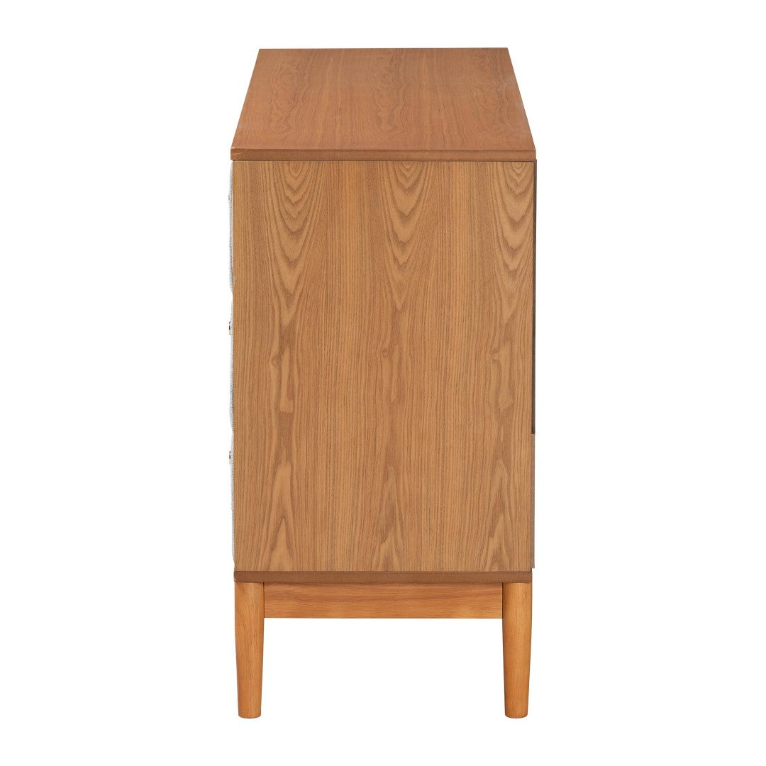 - Hardware & Finish: Minimalist metal drawer pulls and oak‑brown tapered legs for mid‑century flair and stability