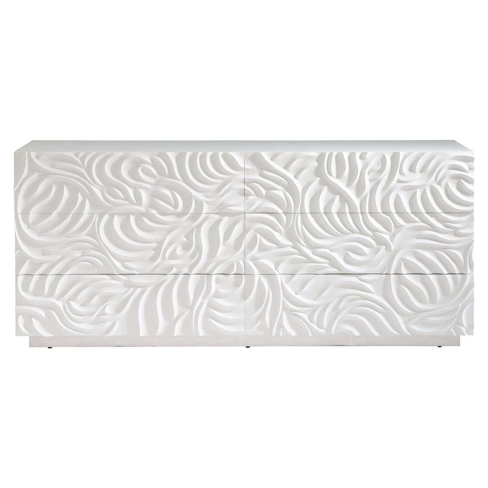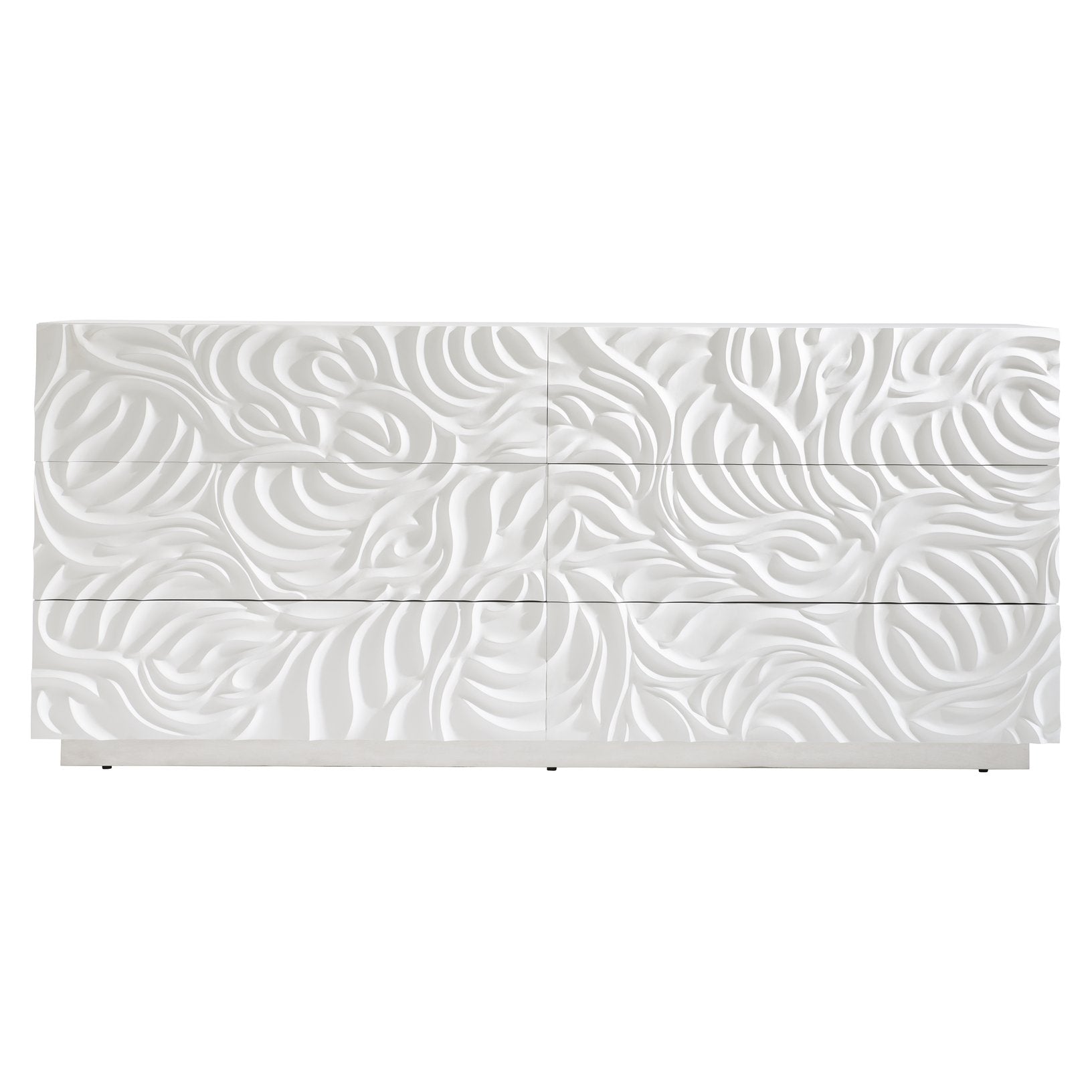 Make a bold, sculptural statement in your bedroom or living space with the Alia dresser. Its flowing, carved fronts and luminous White Plaster finish combine modern organic form with refined craftsmanship, creating a focal piece that reads as both furniture and art. Smooth, push-to-open drawers and a polished stainless steel plinth base keep the look clean and contemporary while providing practical storage.