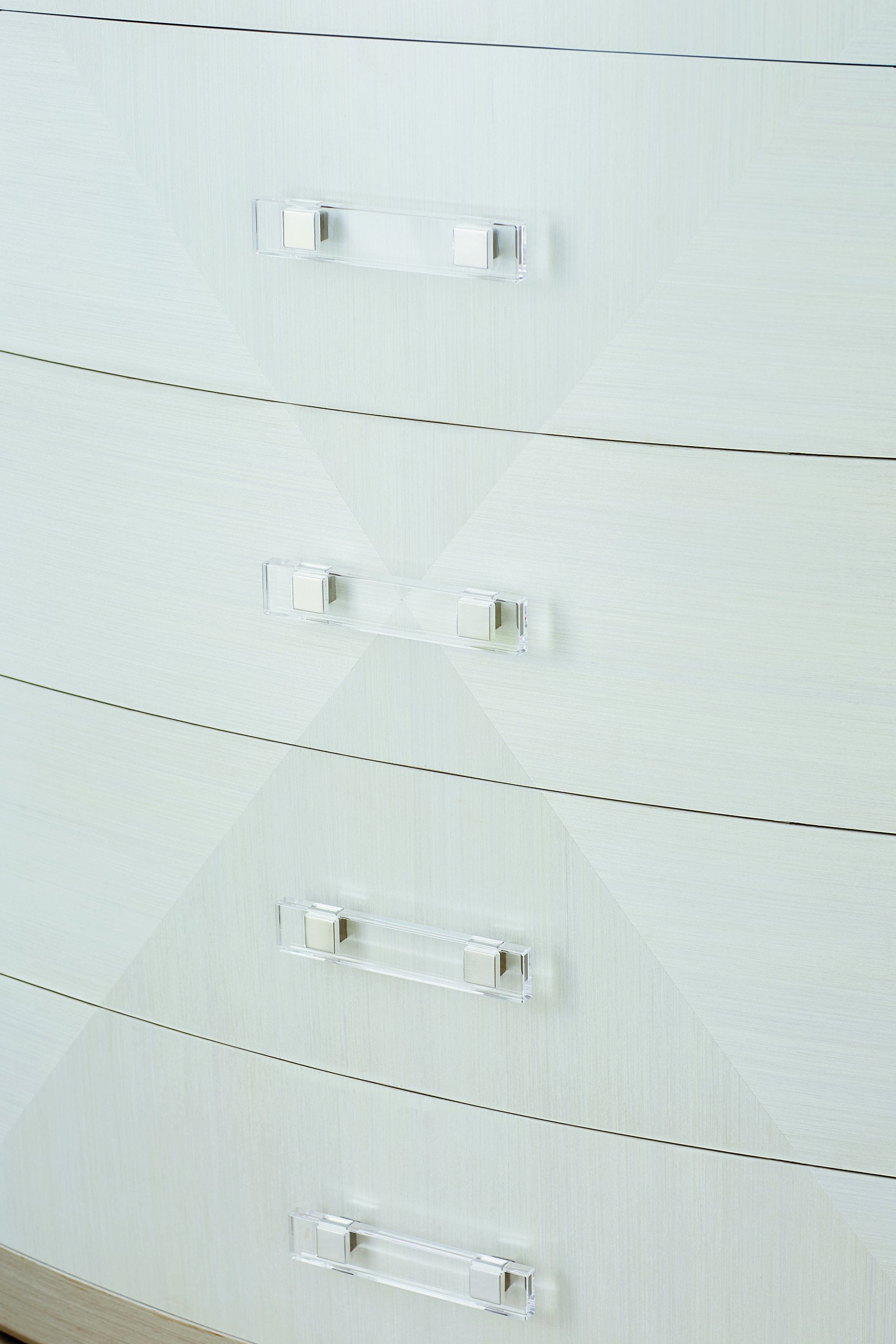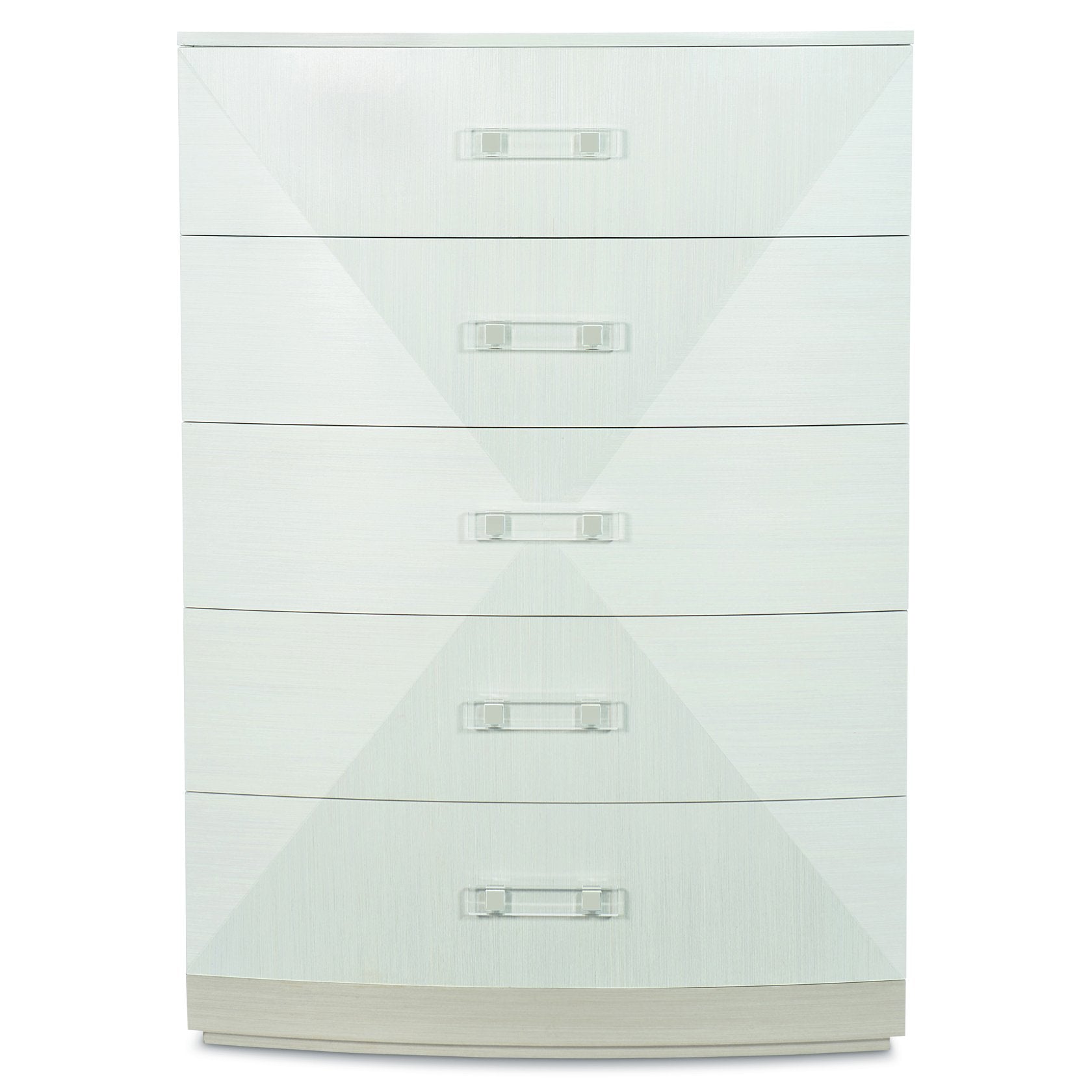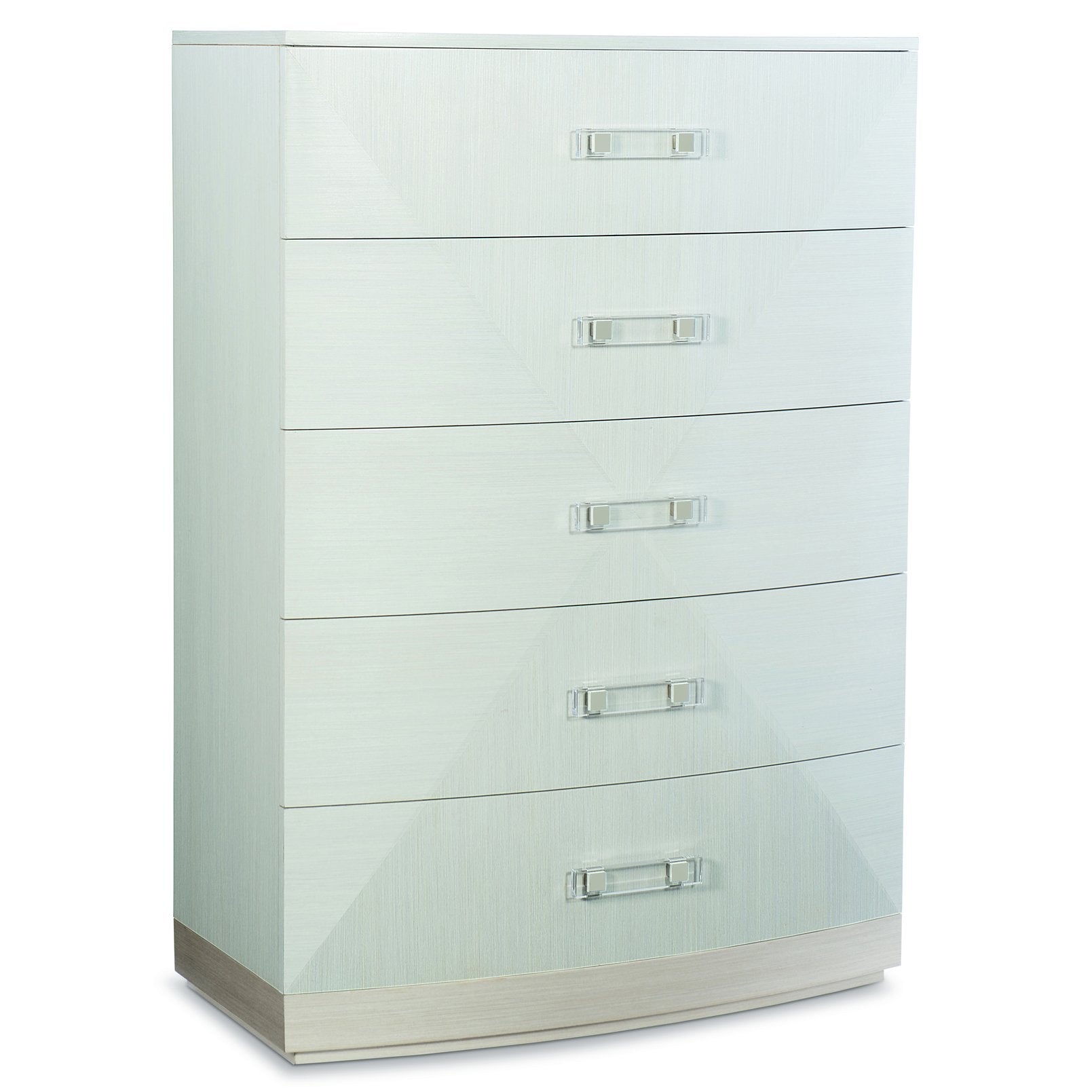 A refined statement piece for the bedroom, this tall chest blends glamorous transitional styling with modern details. Smooth, low-sheen finishes and a softly bowed front create subtle depth, while unique acrylic-and-metal hardware adds a fresh, contemporary accent. Practical and polished, the five-drawer design offers organized storage without sacrificing visual warmth.
