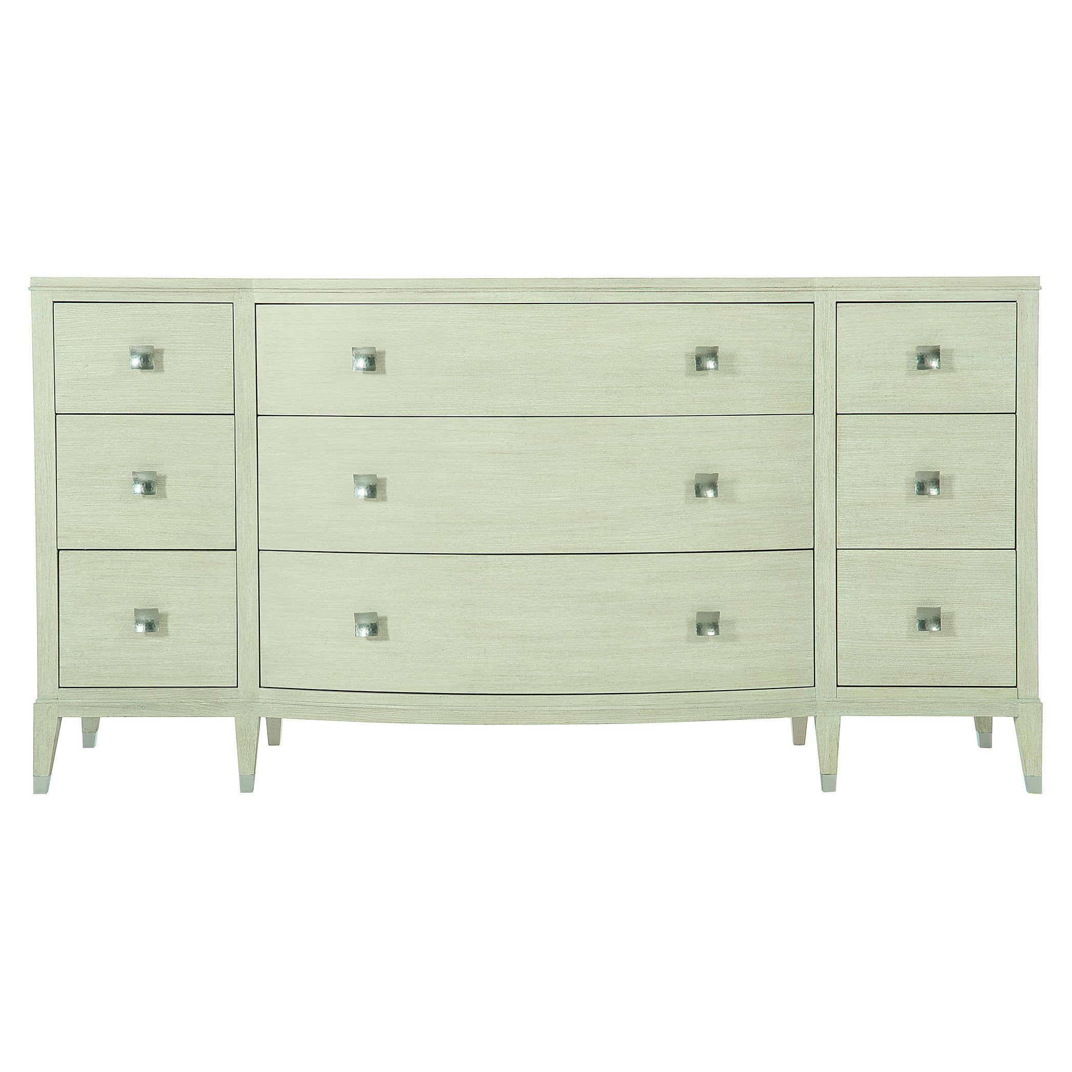 Refined yet understated, this dresser blends clean modern lines with traditional detailing to create a versatile centerpiece for a variety of bedroom styles. Meticulous craftsmanship and a Cerused Linen finish emphasize the quartered ash veneers, while sculpted drawer fronts and tasteful metal accents deliver a polished, neo‑traditional look that balances form and function.