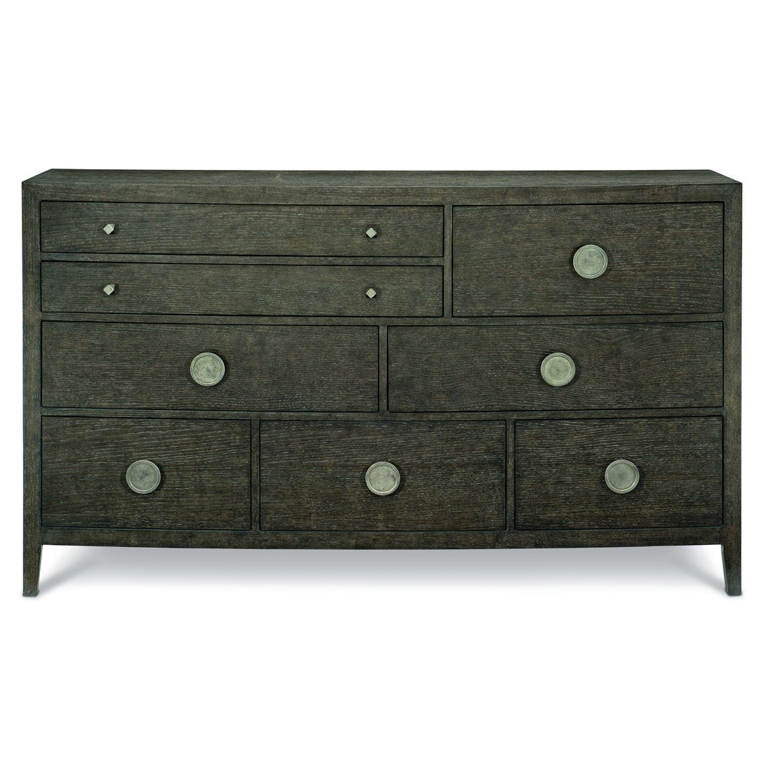 Elevate your bedroom with the Linea dresser—an artful blend of rustic warmth and modern refinement. Its bow-front silhouette, subtle wood texture, and jewelry-like metal hardware create a sophisticated focal point that balances form and function. Carefully crafted details and a versatile Cerused Charcoal finish make this dresser as much a statement piece as a practical storage solution.