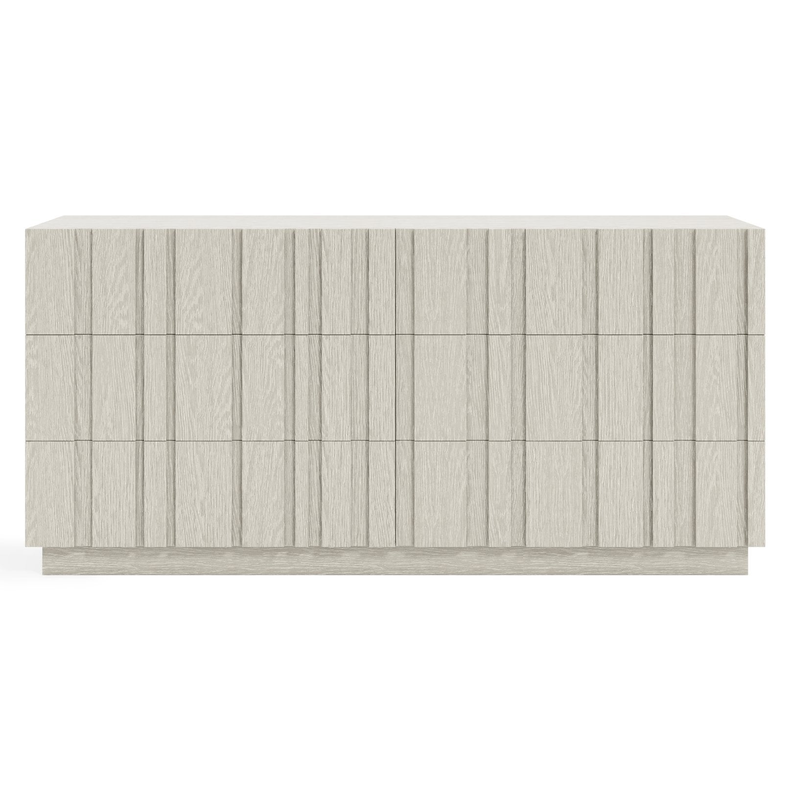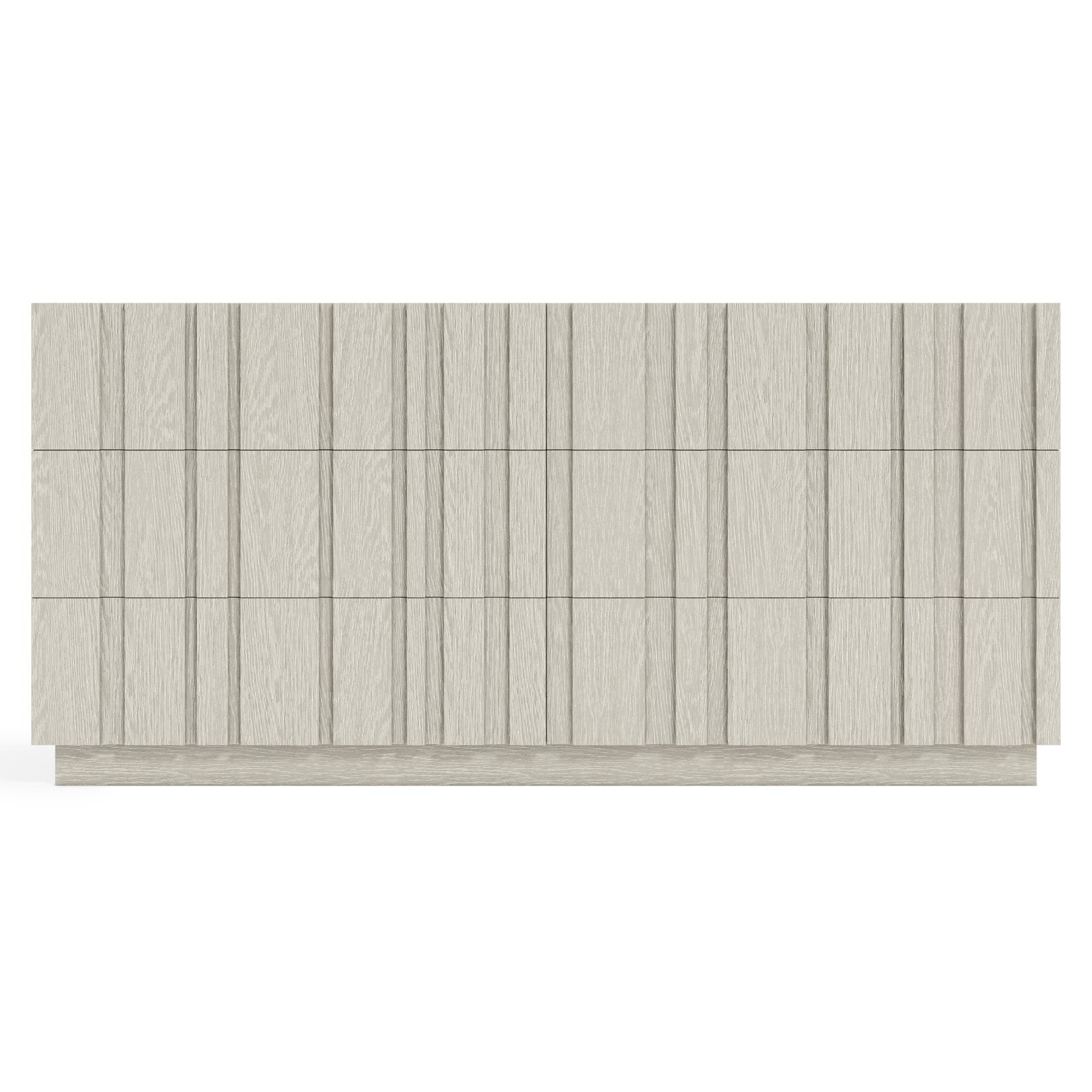 The Tempo dresser blends rustic warmth with modern refinement, using rhythmic vertical wood panels and a wirebrushed oak finish to create striking depth and texture. Its clean lines, raised panel drawer fronts, and push-to-open hardware deliver a relaxed yet elevated presence ideal for contemporary or transitional bedrooms.
