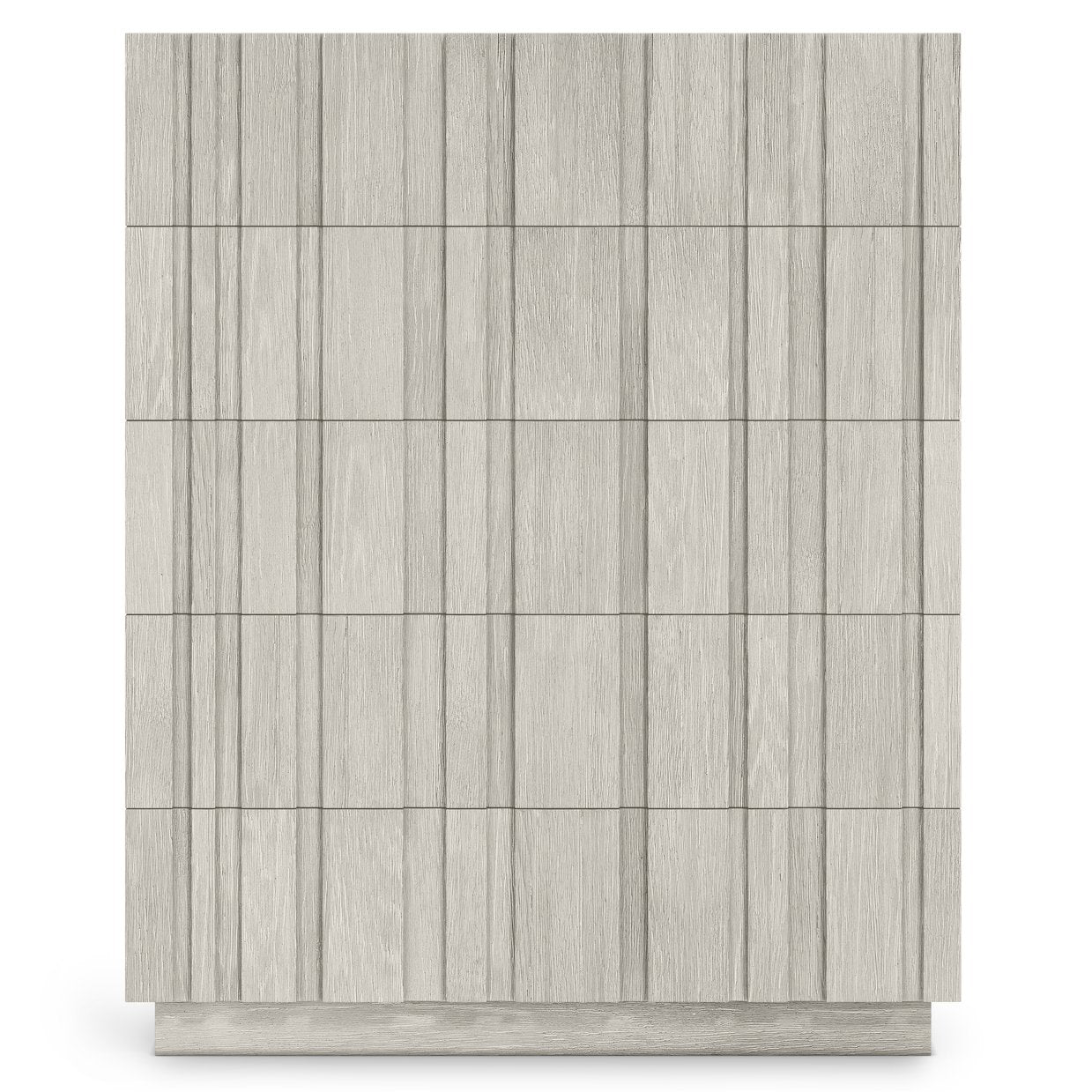 Elevate your bedroom or living space with the Bernhardt Tempo tall drawer chest — a refined blend of rustic warmth and modern simplicity. The chest’s rhythmic vertical wood panels and wire-brushed oak finish create visual depth and texture, while the clean silhouette and plinth base deliver an understated, contemporary presence. Five smooth push-to-open drawers provide generous, organized storage without visible hardware, making this piece both striking and practical.