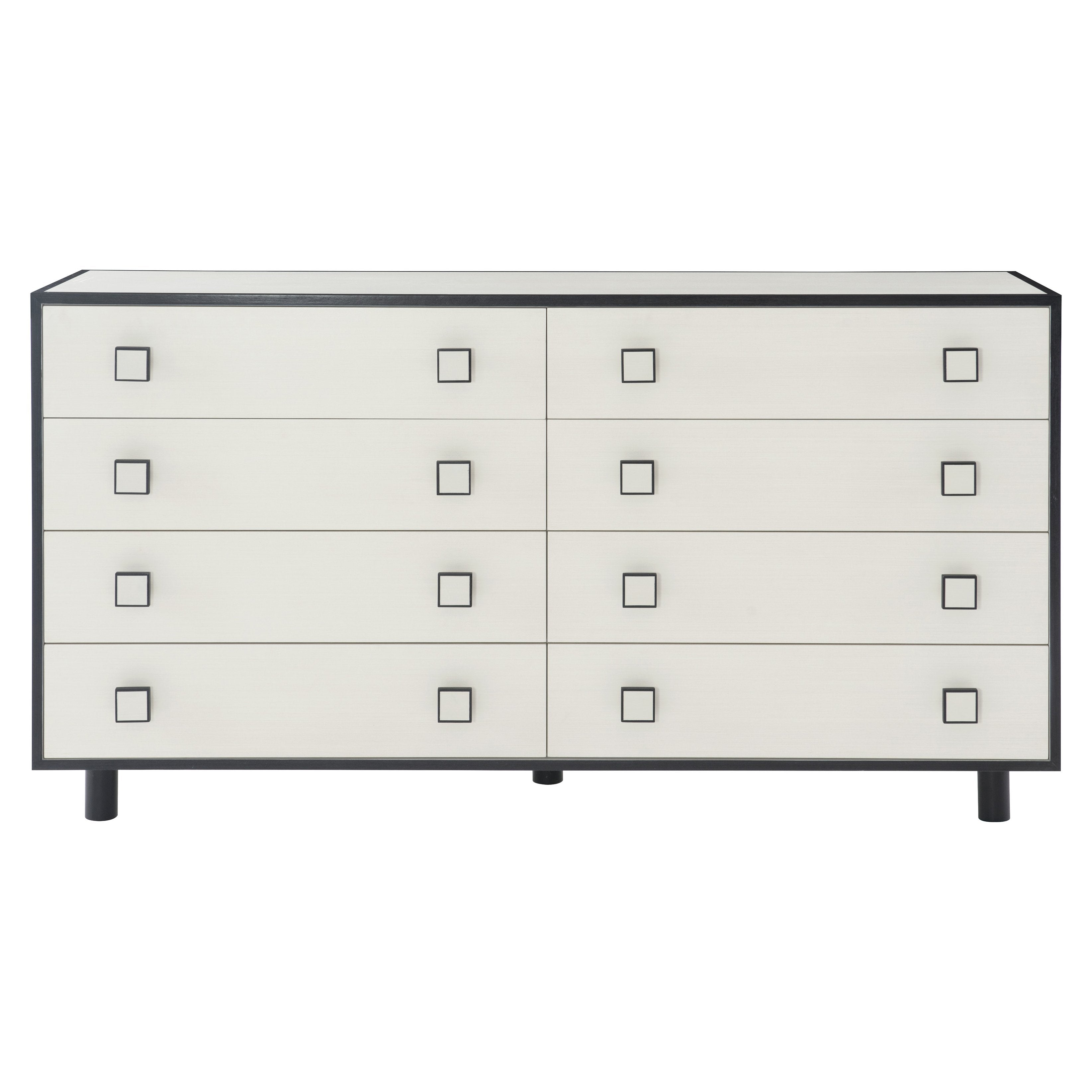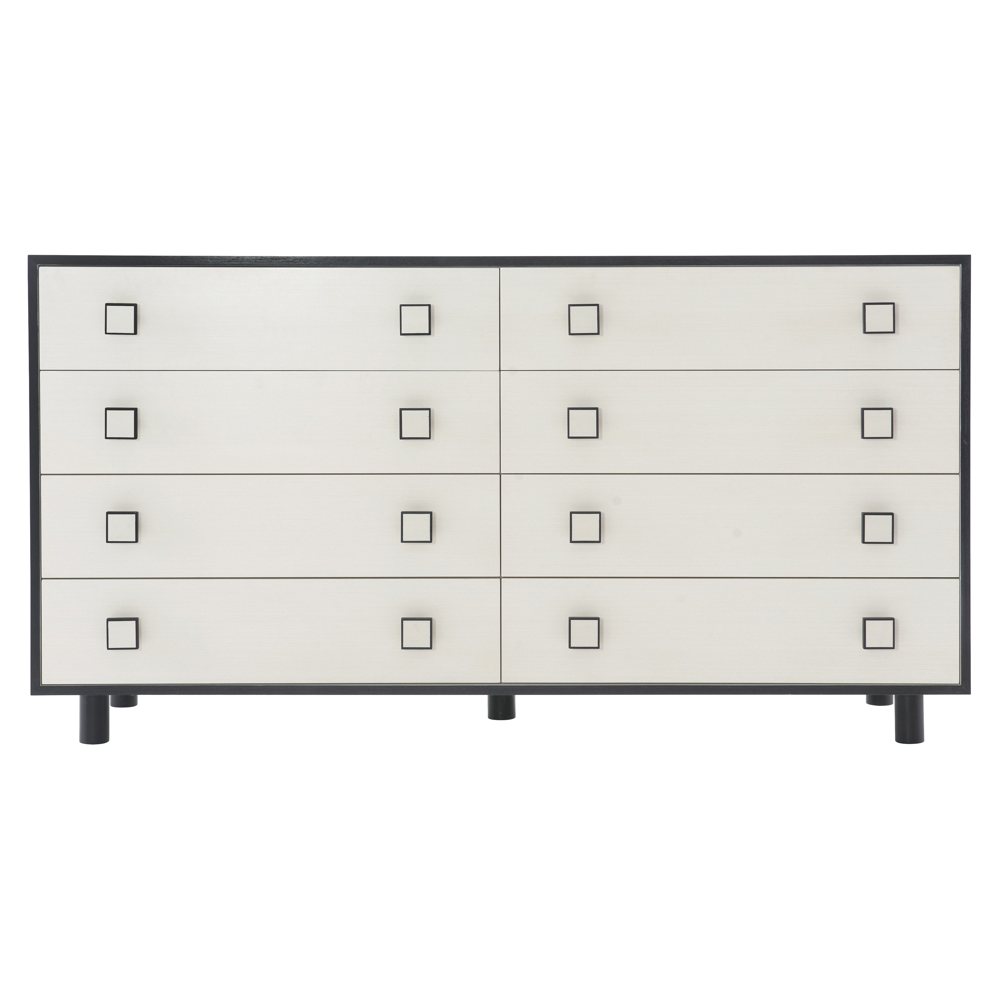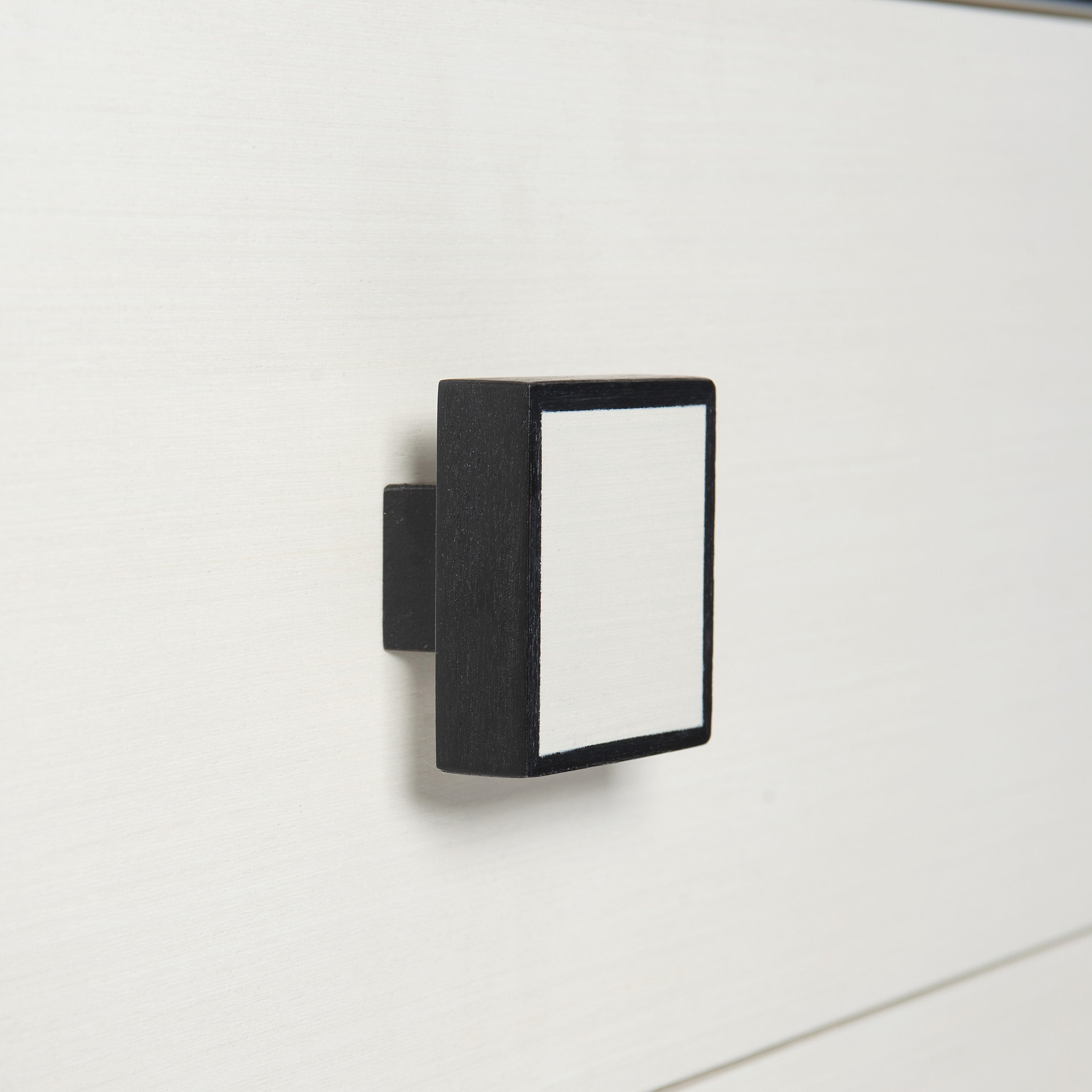 Elevate your bedroom with a striking blend of minimalist form and Hollywood Regency glamour. This two-tone dresser pairs a crisp eggshell case with onyx borders and cylindrical feet for a bold, sculptural presence that anchors contemporary and transitional interiors alike. Thoughtful details—like square wood pulls, soft-closing drawers, and an adjustable base—combine style with everyday convenience to create a centerpiece that’s as functional as it is fashionable.