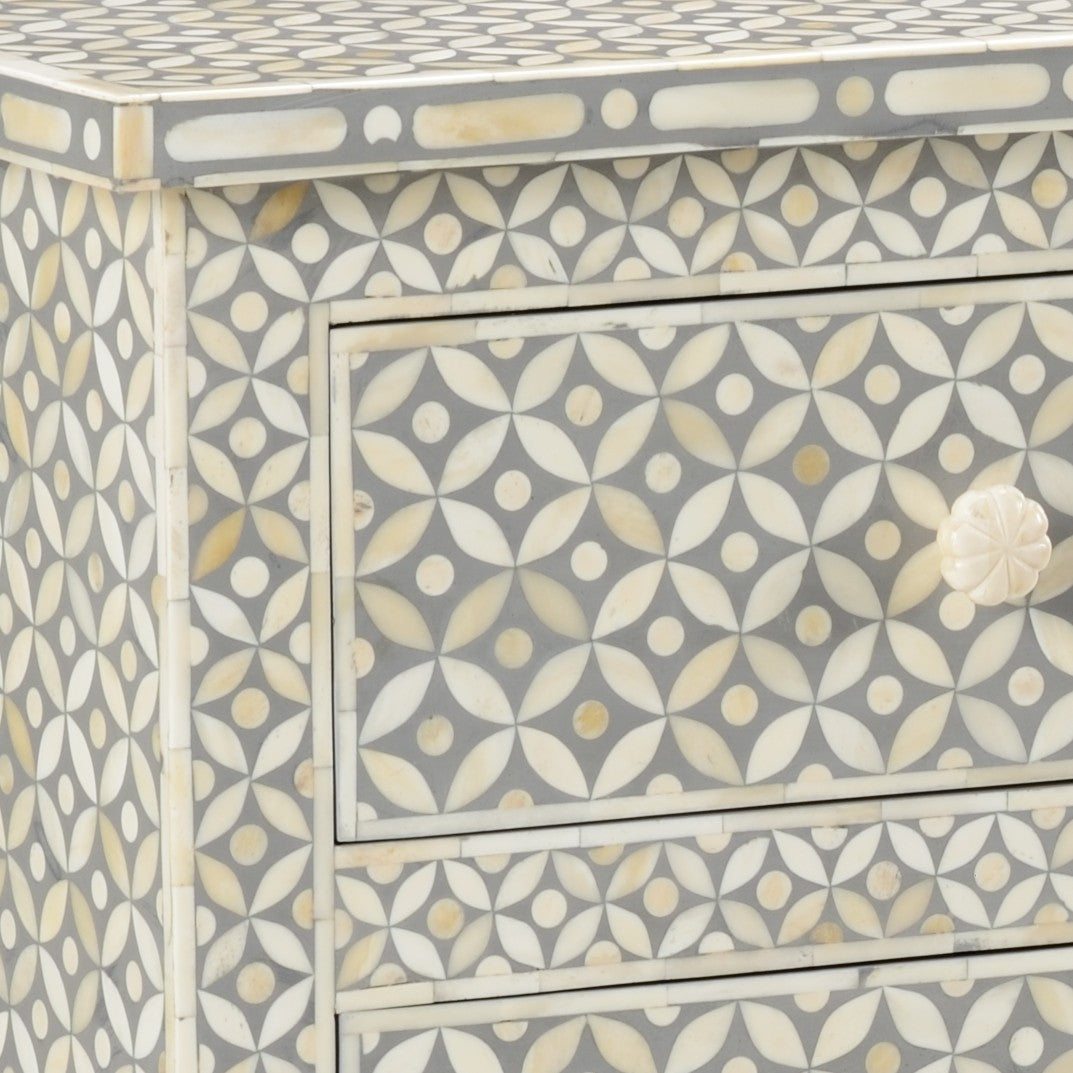 Bring modern structure and subtle texture to your room with this Milford Chest in gray. Its geometric pattern adds visual interest while the compact four-drawer design provides organized storage for linens, accessories, and small household items. Ideal for entryways, living rooms, or bedrooms where space is limited but style matters.