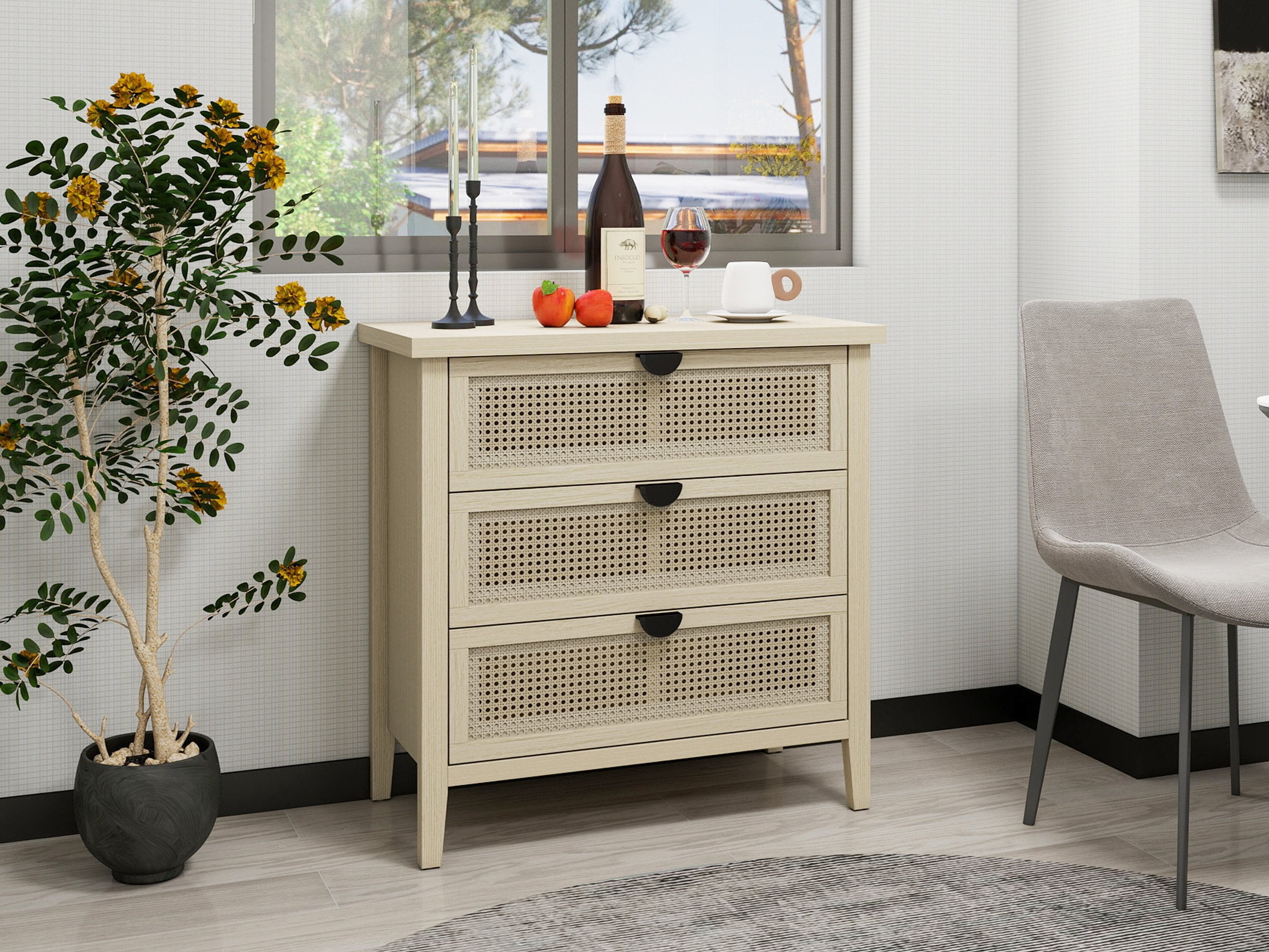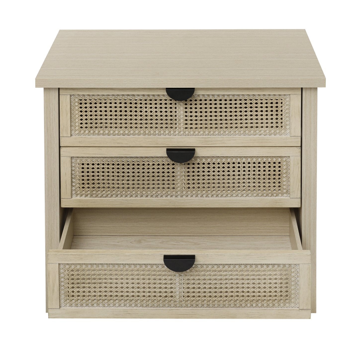 Add a touch of casual American style to any room with this 3-drawer cabinet — a compact, practical storage solution that blends natural textures with functional design. Its rattan-accented drawer faces and wood-grain finish create a warm, inviting look suitable for bedroom, living room, or study while offering durable everyday performance.