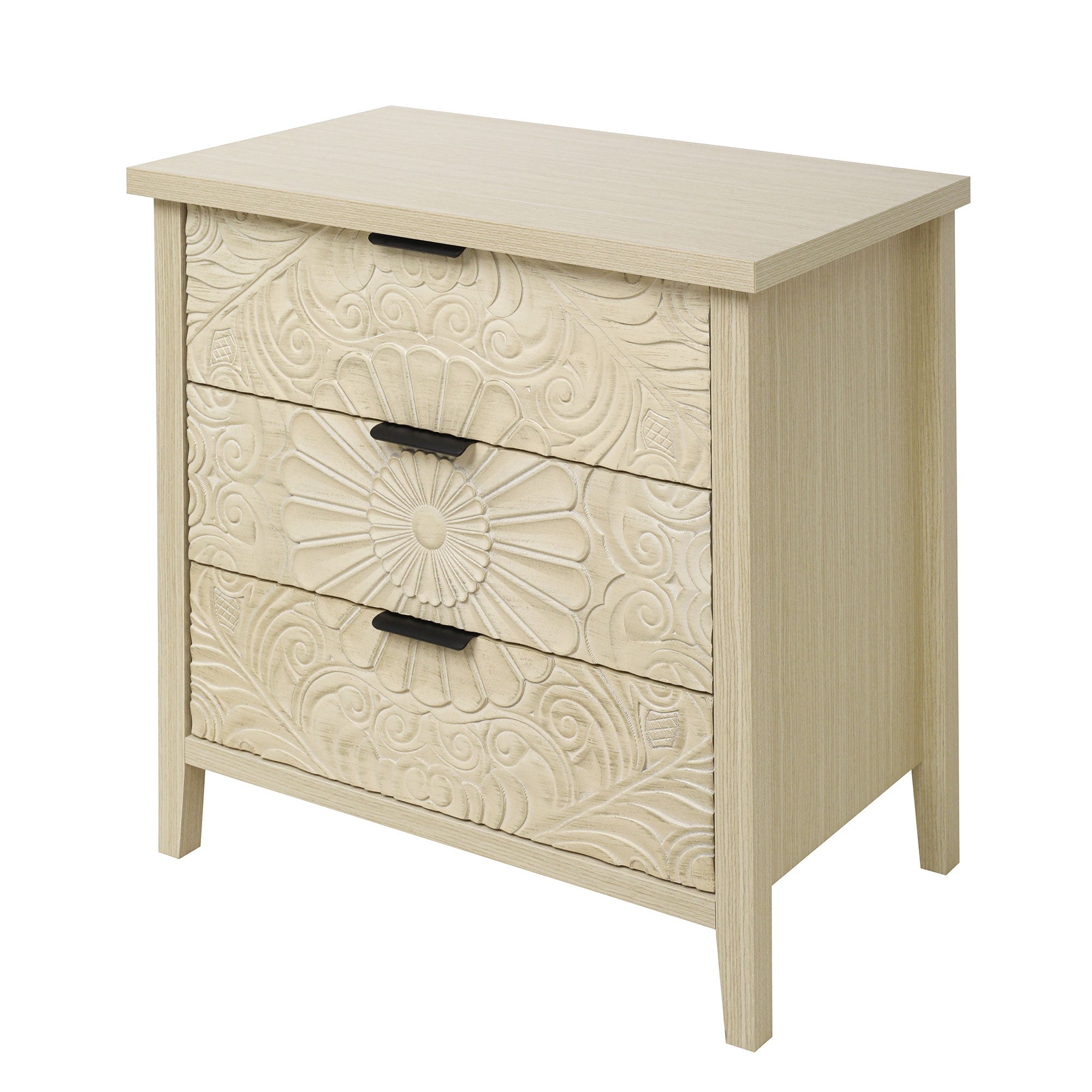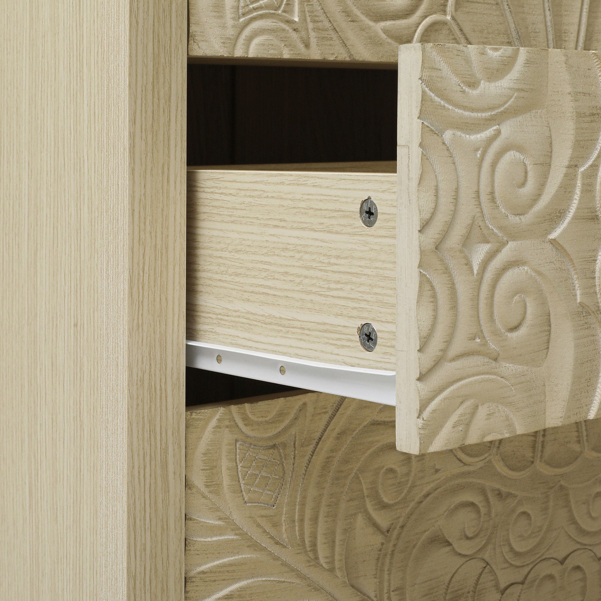 - Hardware & Style: Black patterned handles and embossed drawer panels highlight the wood texture and add visual interest.