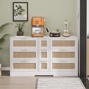 - Materials & construction: Handwoven rattan panels with a reinforced frame for lightweight durability; metal handles for a modern touch and easy drawer access.