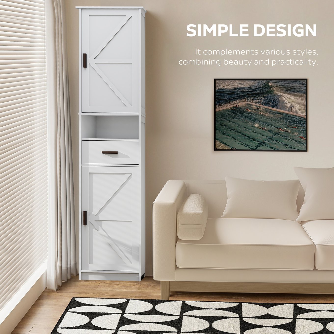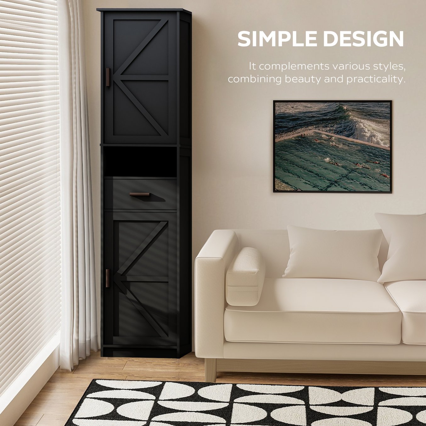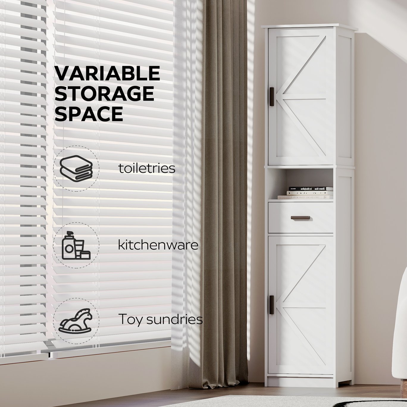 Bring organization and style to tight spaces with this slim, versatile storage cabinet. Designed for narrow corners and small apartments, it blends a modern barn-door aesthetic with practical shelving and a convenient drawer to keep toiletries, kitchen items, or office supplies tidy and accessible.