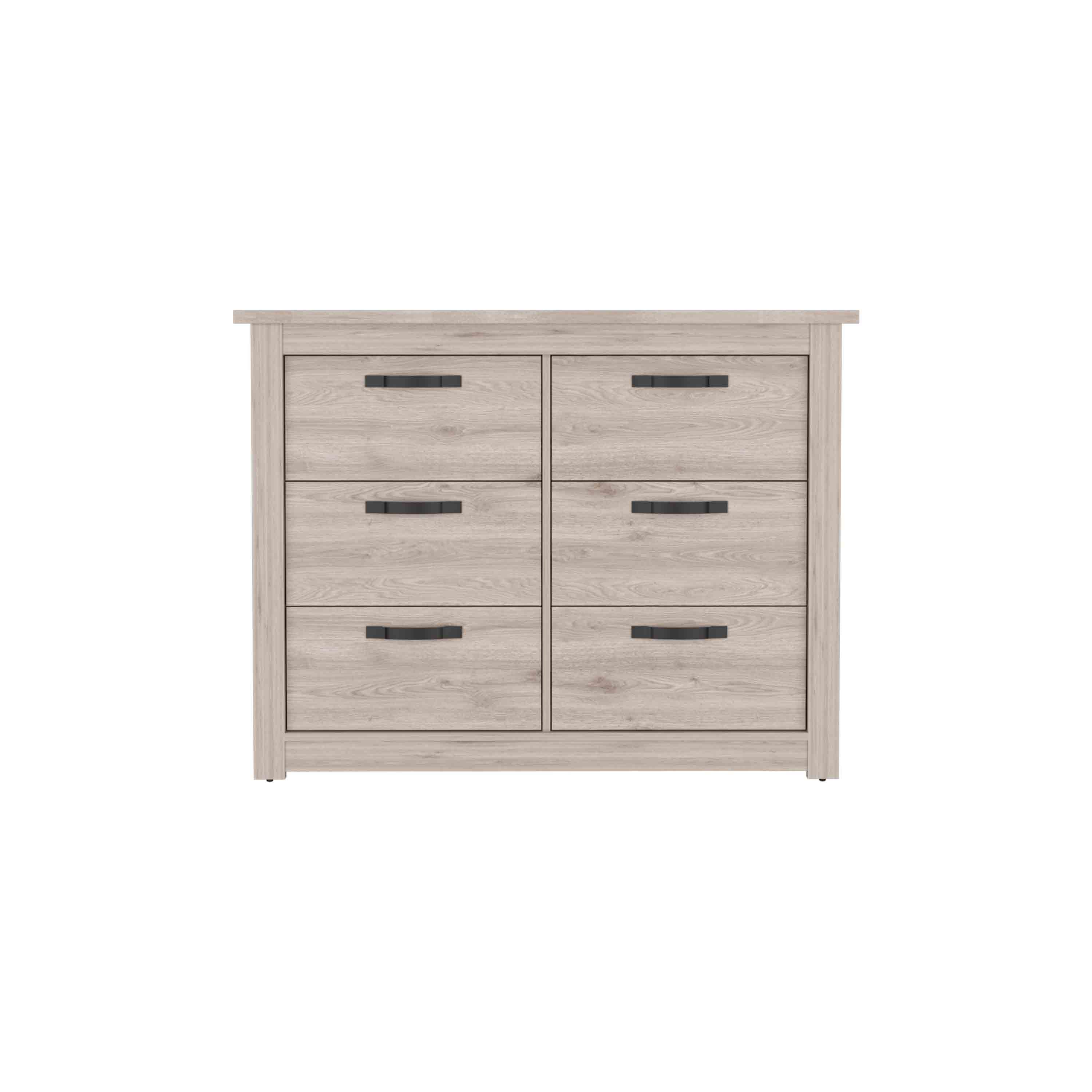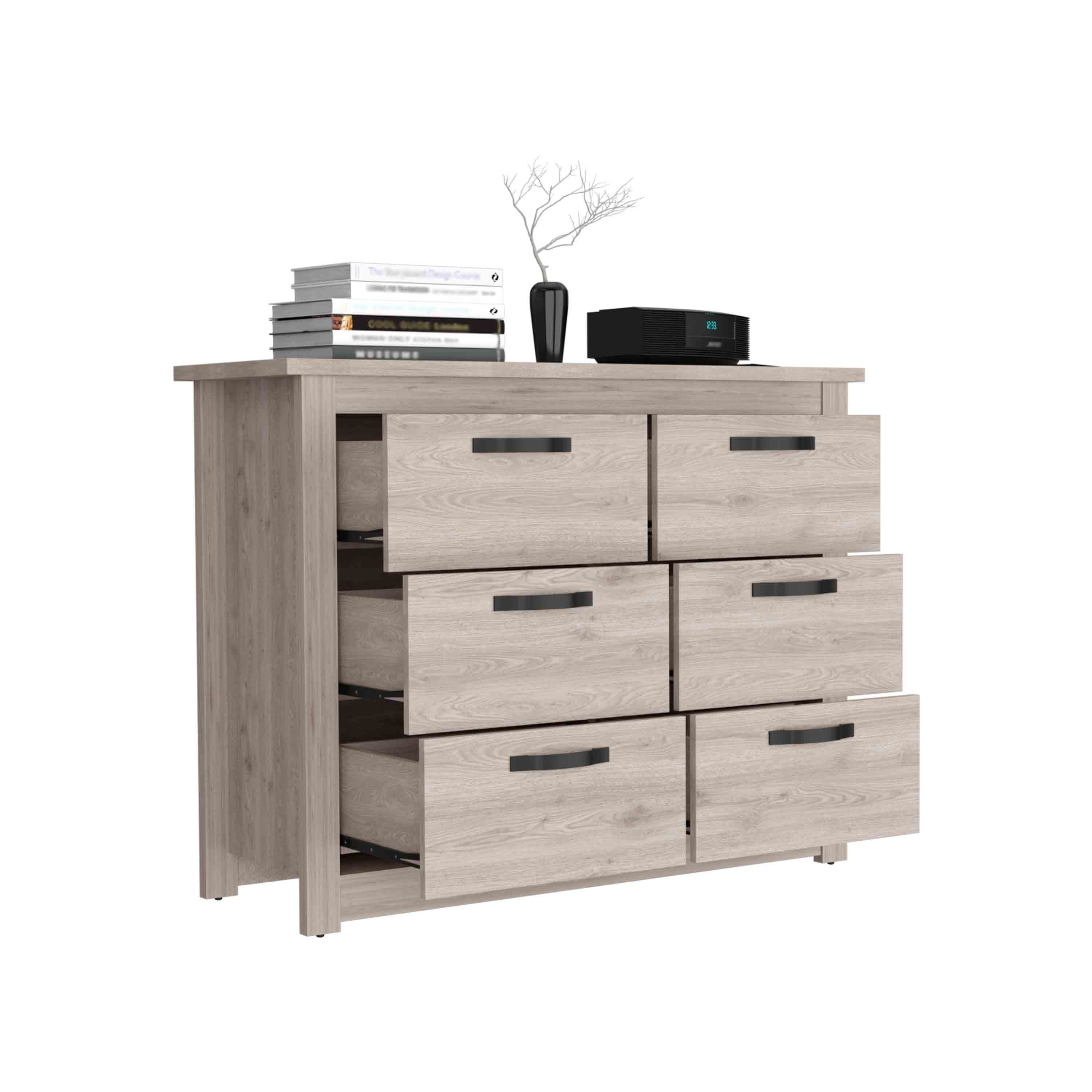 A versatile and contemporary dresser that blends clean lines with practical storage—perfect for modern bedrooms, guest rooms, or transitional spaces. The light gray finish and metal hardware create a subtle, refined look while the six spacious drawers keep clothing and linens neatly organized. Built on four sturdy legs, this piece offers both stability and a lifted profile that makes cleaning underneath easy.