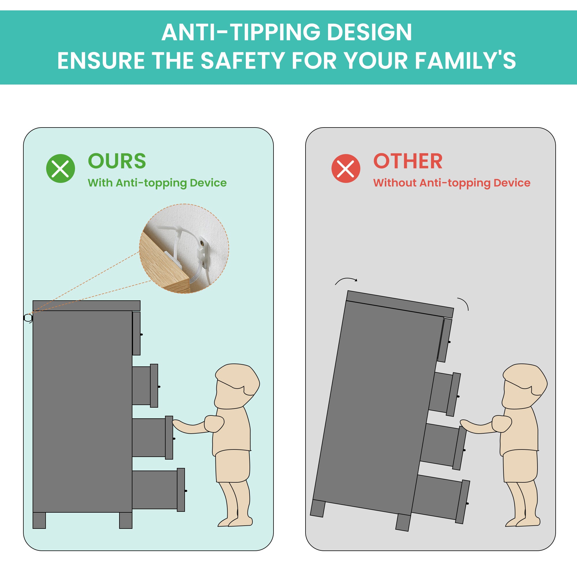 - Safety: Includes an anti-tipping device to secure the dresser to the wall and prevent accidents.