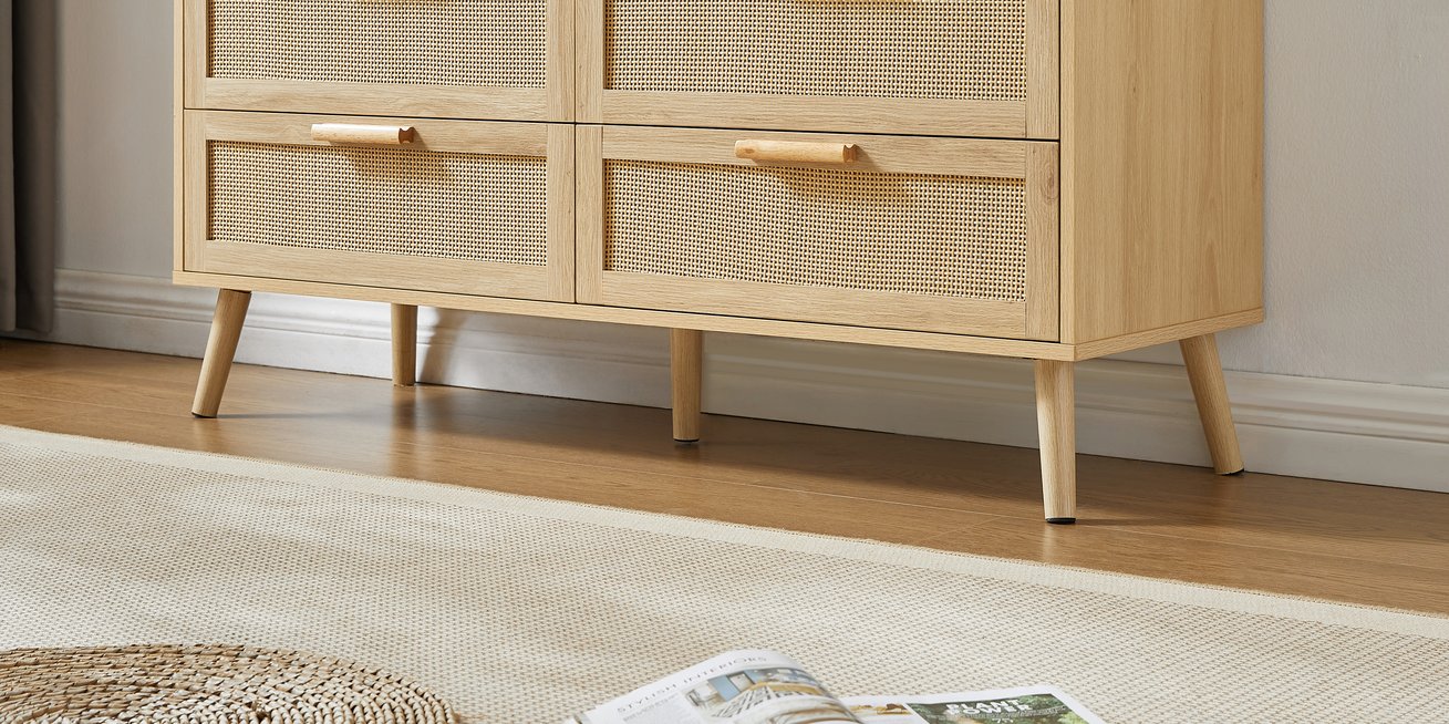 - Materials: Durable particleboard frame combined with natural rattan drawer fronts and wooden pulls for an organic, textured look.