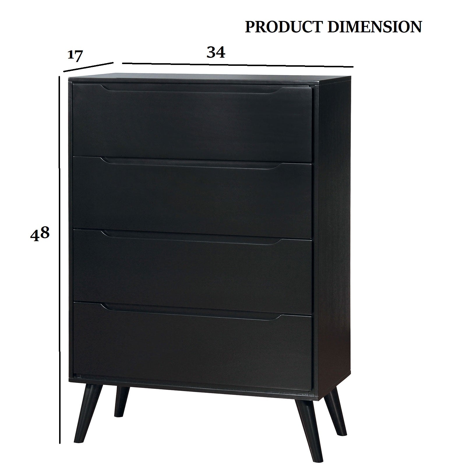 Give your bedroom a sleek mid-century makeover with this modern 4-drawer chest in a versatile black finish. Clean lines, recessed handles, and tapered round legs deliver a timeless silhouette that blends contemporary minimalism with classic retro character. Built for everyday use, it offers generous storage while maintaining a light, elegant profile.