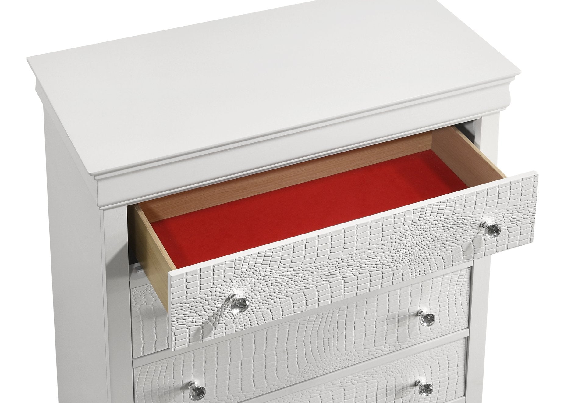 Add refined storage and modern sophistication to your bedroom with this five-drawer chest. Clean lines, a textured finish, and crystal-like knobs create a contemporary look while thoughtful details—like a velvet-lined top drawer and smooth metal runners—ensure everyday functionality. Available in white or gray gunmetal, this chest works equally well in modern, transitional, or classic settings.
