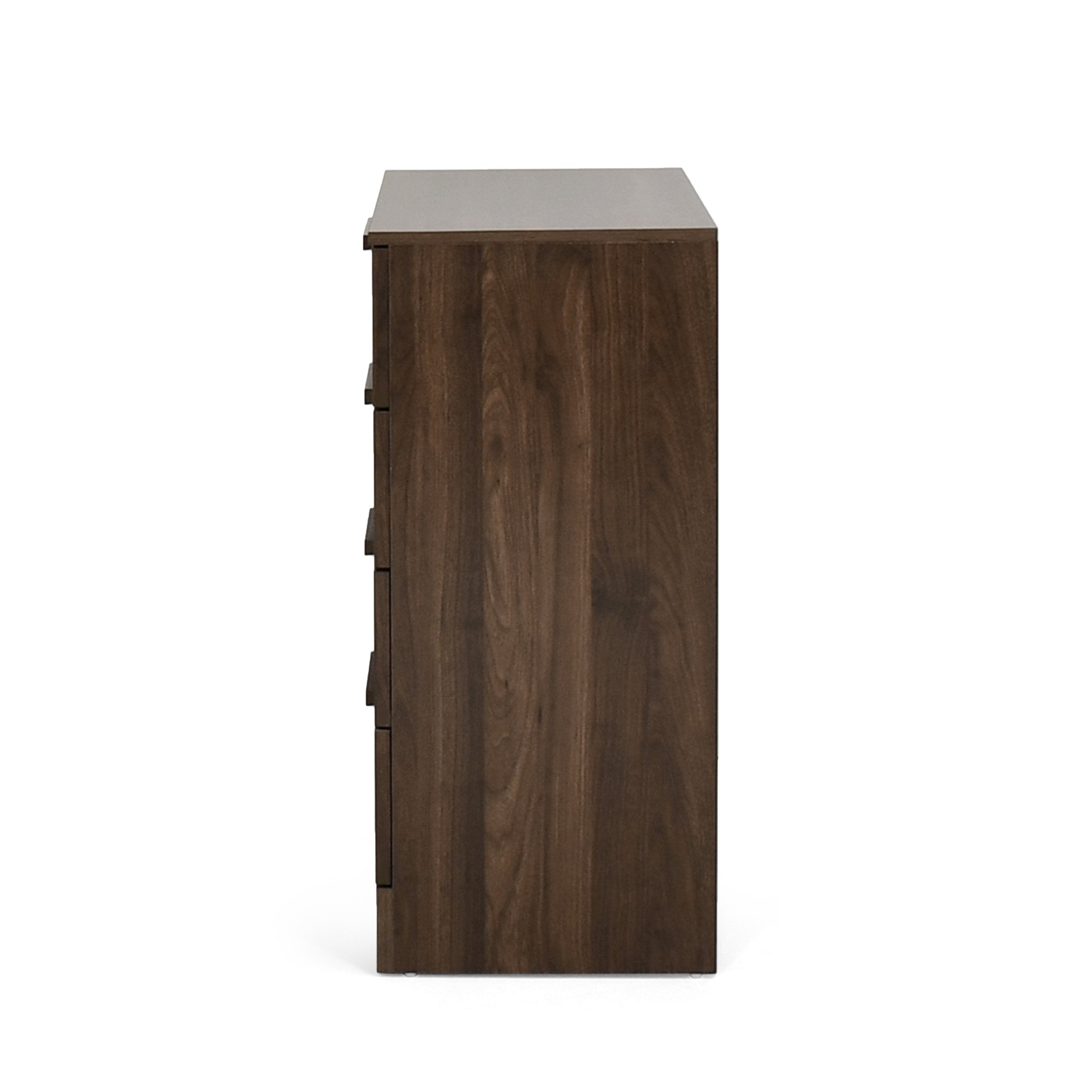 Add classic warmth and practical storage to any bedroom, hallway, or guest room with the DELANEY 4-drawer dresser. Its walnut faux-wood finish pairs a refined woodgrain look with durable construction, while four thoughtfully sized drawers keep clothing and essentials neatly organized. Clean lines and simple block-pull handles create a versatile silhouette that complements both modern and traditional decor.