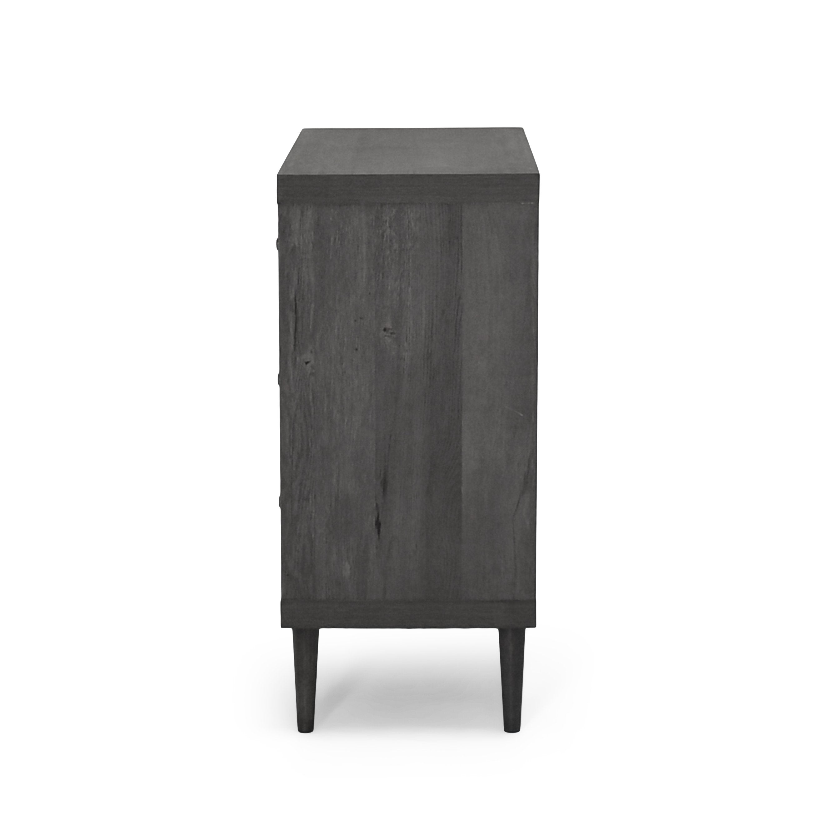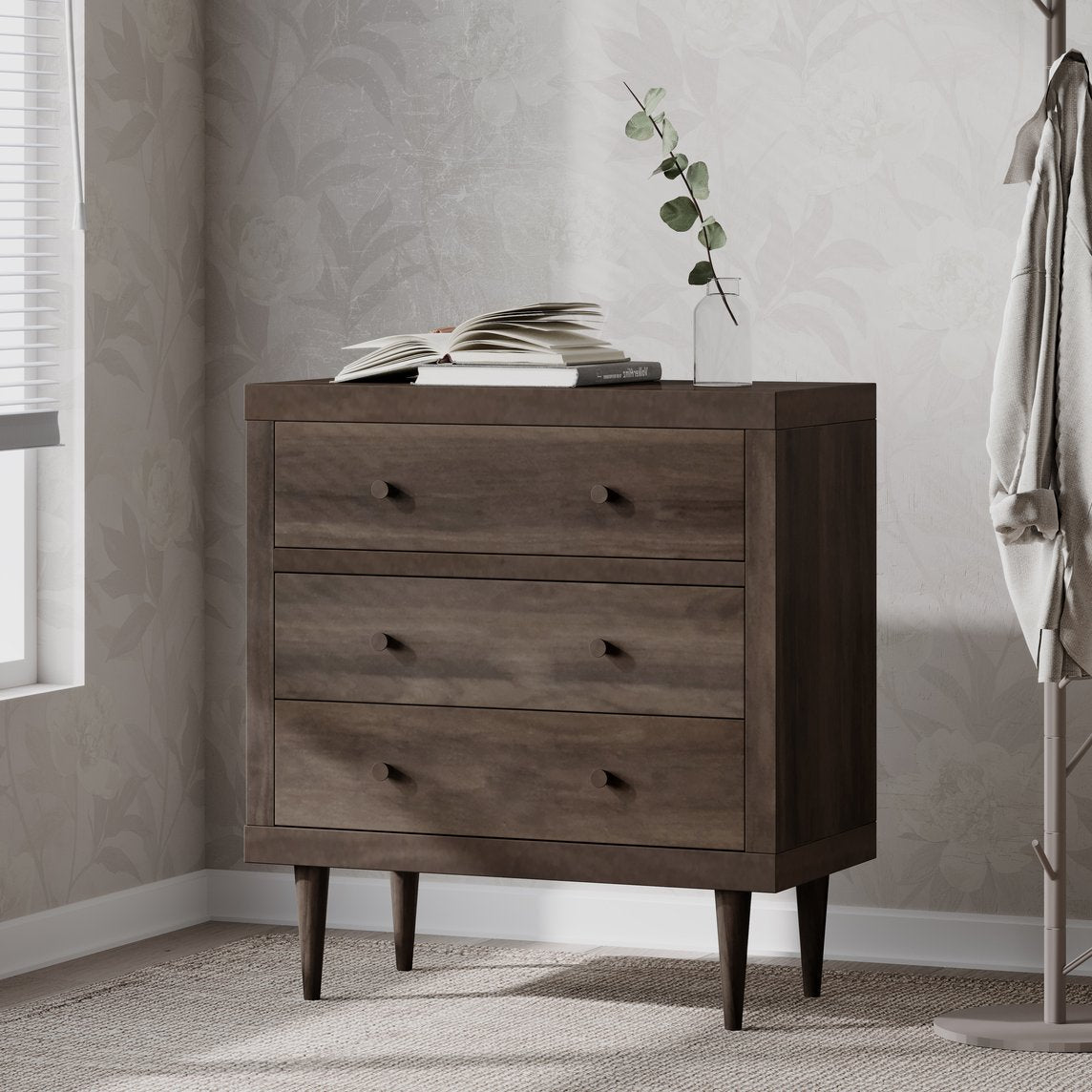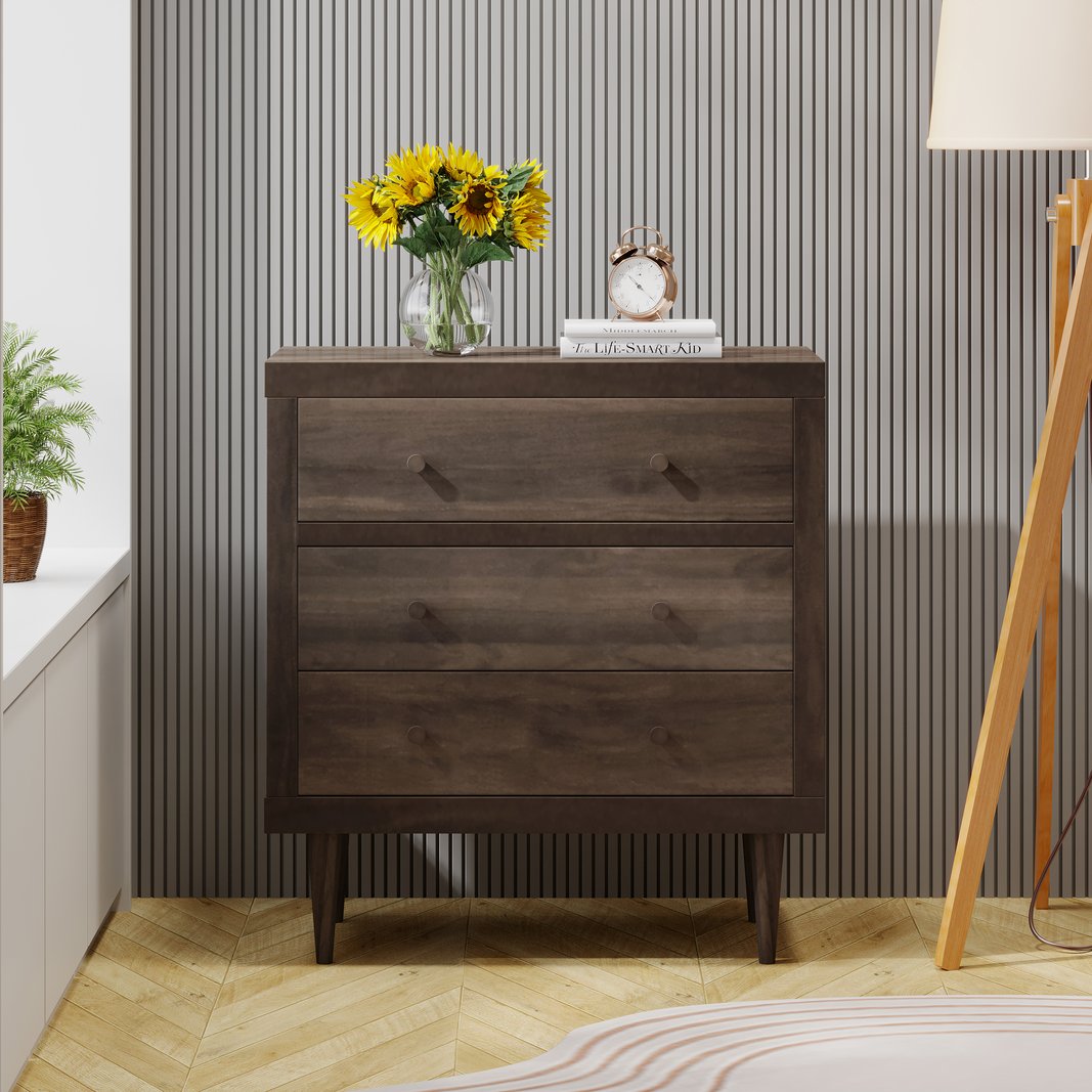 Bring mid-century modern elegance and practical storage to your bedroom or living space with this compact three-drawer chest. Its clean silhouette, tapered rubberwood legs, and realistic faux-wood finish deliver a timeless look while the three roomy drawers keep clothing and essentials neatly organized. Durable materials and thoughtful details make it an easy match for both coordinated and eclectic interiors.