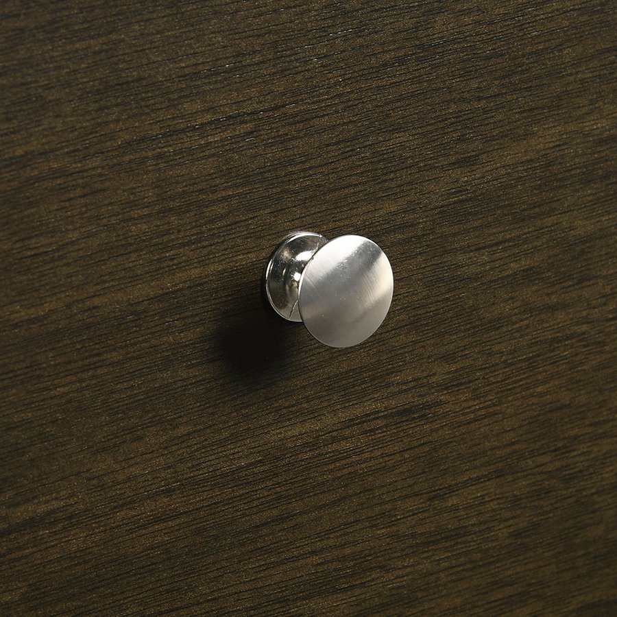 - Brushed nickel drawer pulls add a bright, modern contrast to the dark cocoa finish