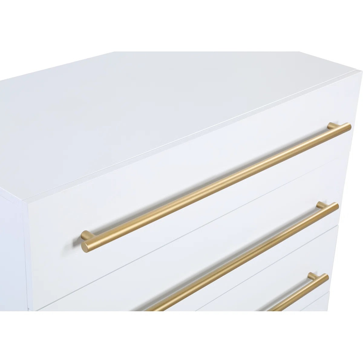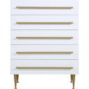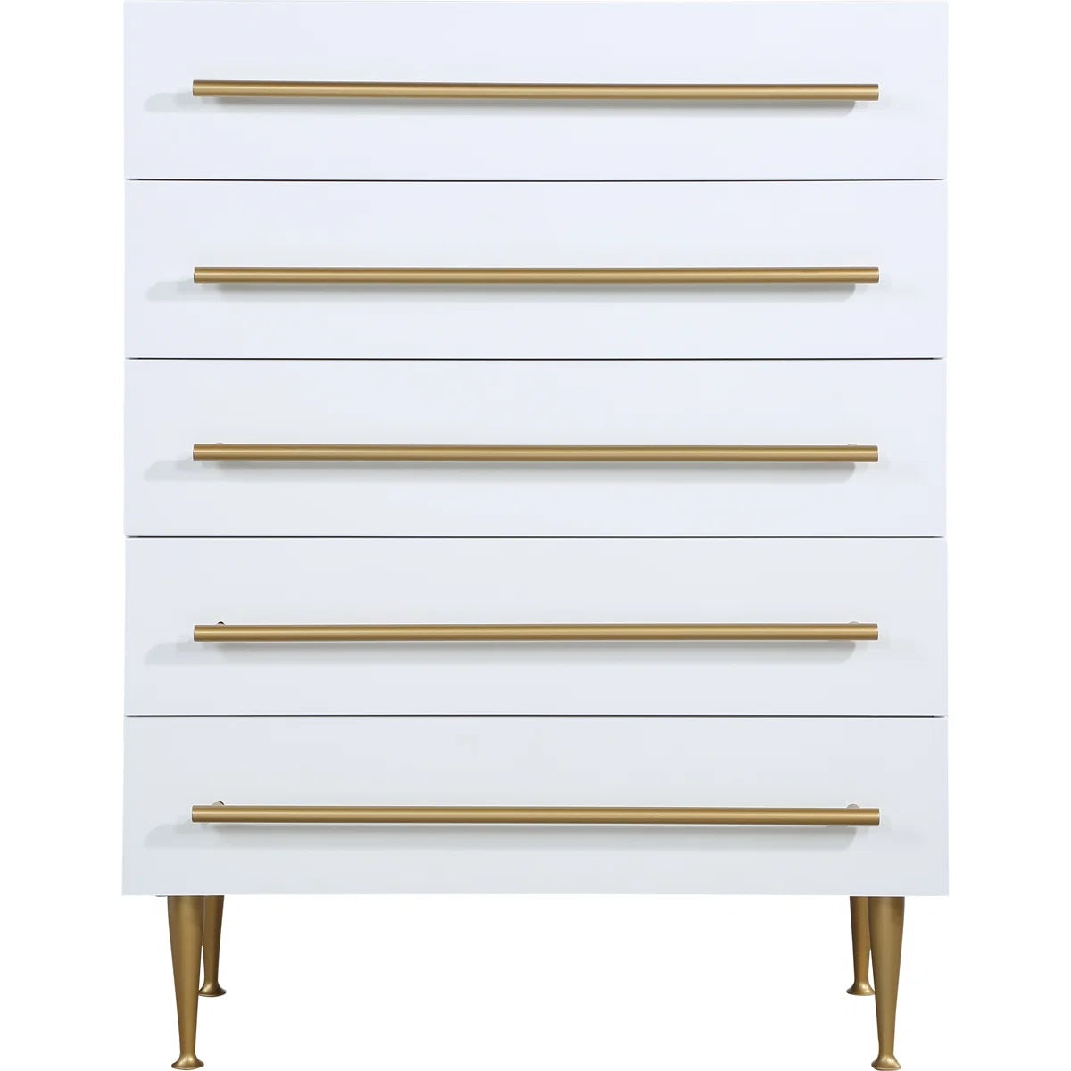 Elevate your bedroom with this contemporary 5-drawer chest that blends modern elegance and practical storage. Clean lines, a crisp white finish, and brushed gold metal legs and drawer handle create a sophisticated focal point while the durable wood construction and minimalist hardware ensure everyday functionality. Ideal as a standalone piece or paired with coordinating furniture to complete a serene, up-to-the-moment bedroom sanctuary.