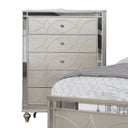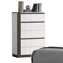 This contemporary chest brings bold, modern styling and practical storage to your bedroom. Its high-gloss white surfaces contrasted with metallic gray accents create a striking two-tone look, while concealed drawer pulls and asymmetrical gap detailing deliver a clean, minimalist silhouette. Smooth ball-bearing glides and durable construction make it as functional as it is fashionable.