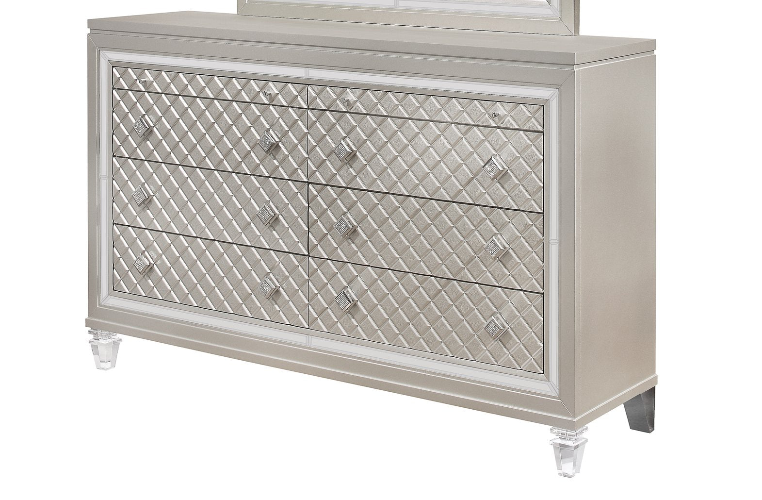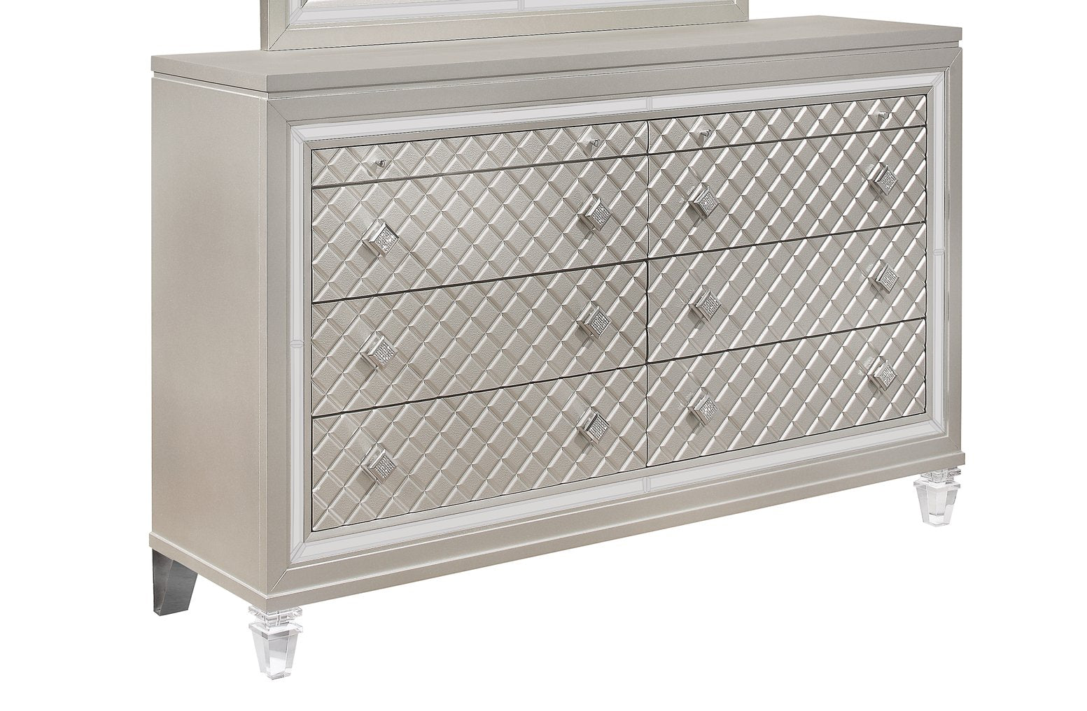 Elevate your bedroom with the Cross Glam Champagne Dresser — a striking blend of solid craftsmanship and glamorous detailing. Finished in a soft champagne hue, this dresser pairs durable construction with jewel-like accents and mirrored elements to create a focal piece that is both functional and luxurious. Ideal for those who appreciate refined storage solutions with a touch of sparkle.