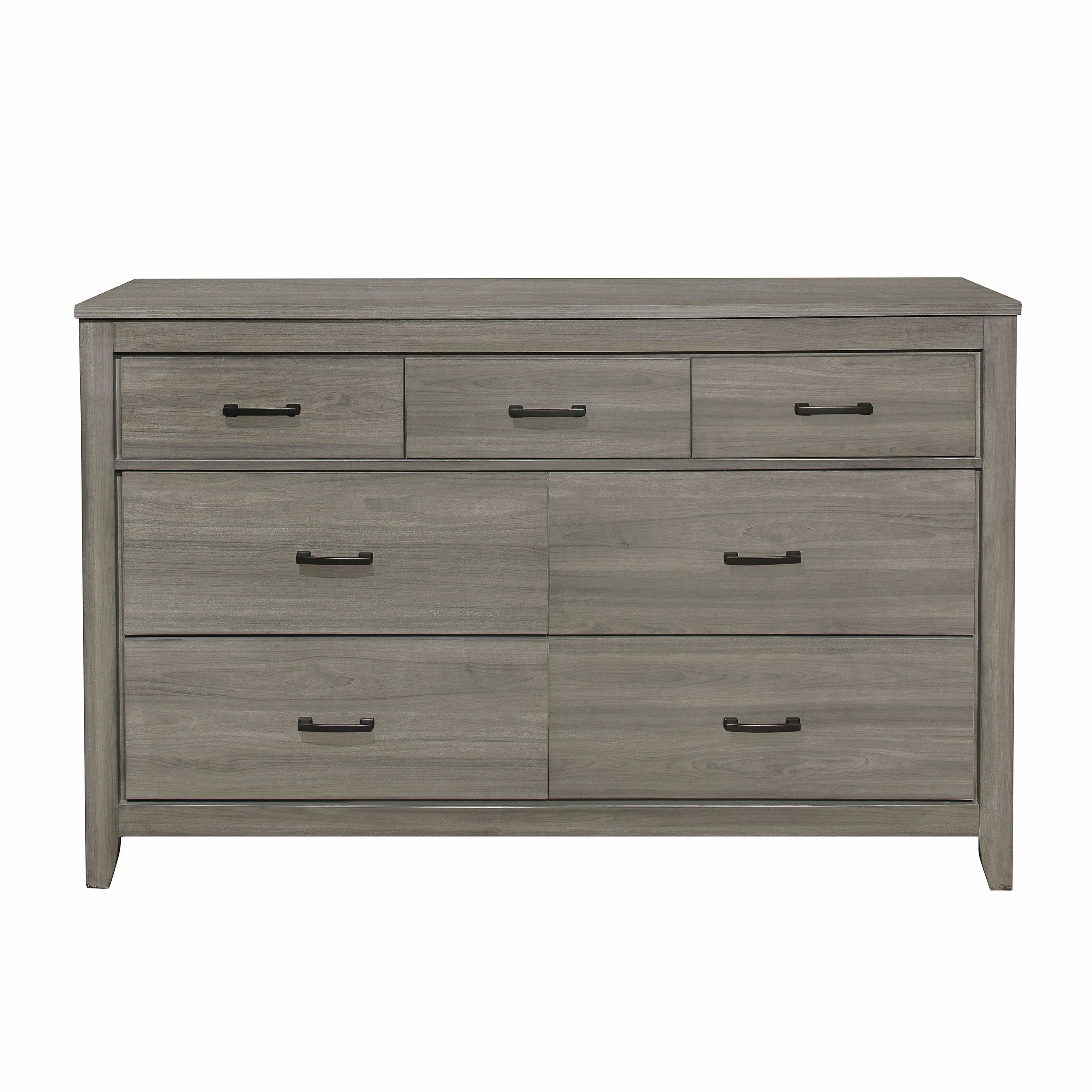 Bring industrial, rustic, and modern elements together with this versatile 7-drawer dresser from the Waldorf Collection. Its dark gray printed wood-grain laminate and horizontally mounted dark hardware deliver striking contrast and a neutral palette that complements a wide range of bedroom styles. Built for both everyday use and visual appeal, this dresser provides generous organized storage while maintaining a streamlined silhouette.