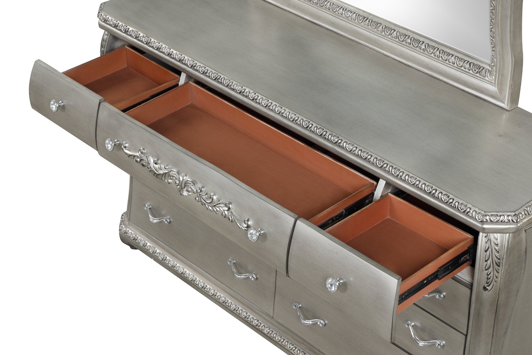 Elevate your bedroom with the Destiny 9-Drawer Dresser — a refined, versatile storage piece that combines classic craftsmanship with a contemporary silver finish. Built from a blend of solid and manufactured wood and fitted with metal drawer pulls, this dresser offers durable construction, generous organization, and a polished silhouette that suits traditional, transitional, and modern interiors.