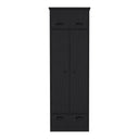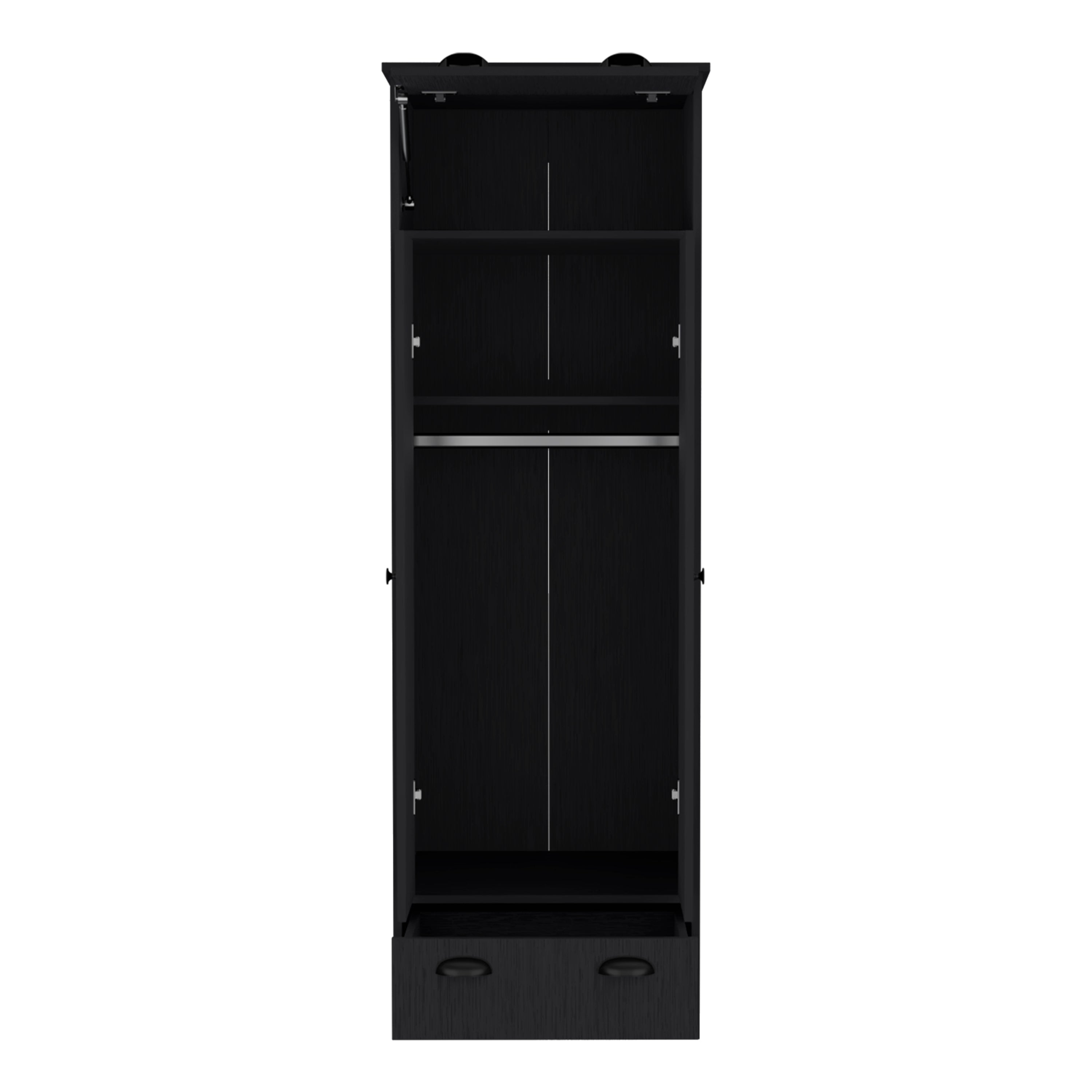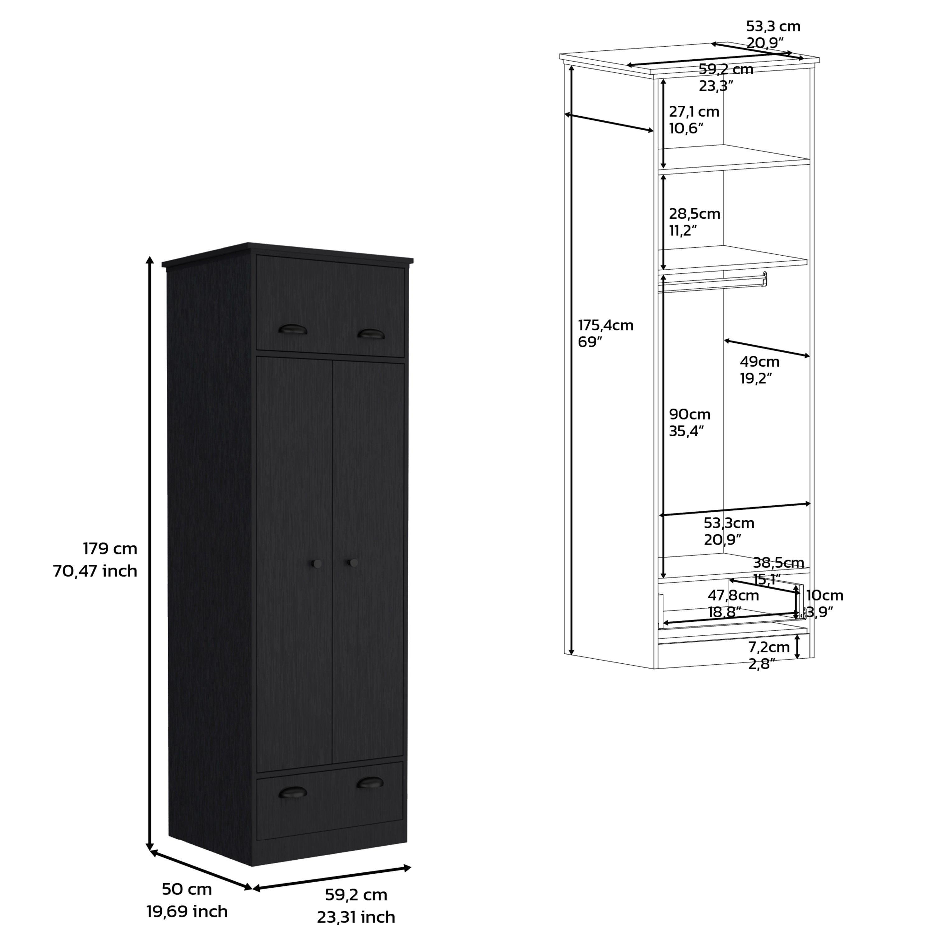 - Storage layout: Upper enclosed compartment with one door, two central open shelves for folded items or décor, dual-door section with a hanging tube for garments, and a full-width bottom drawer for accessories or linens.