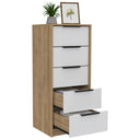 Elevate your bedroom or hallway with this sleek vertical dresser that blends contemporary style with smart storage. Its compact footprint and five deep drawers provide generous organization for clothing and linens while the white and light oak finishes create a bright, modern look that complements a variety of decor styles.