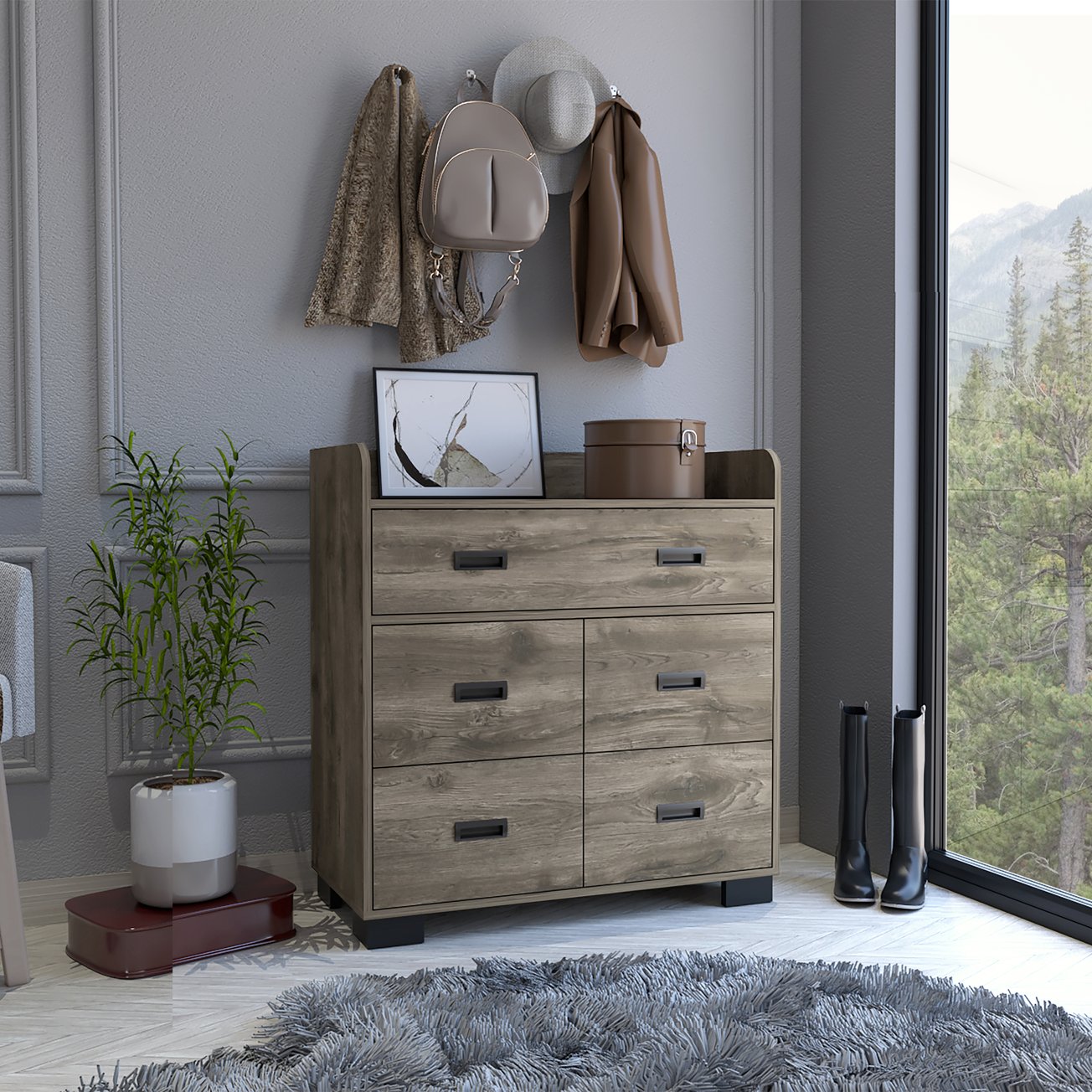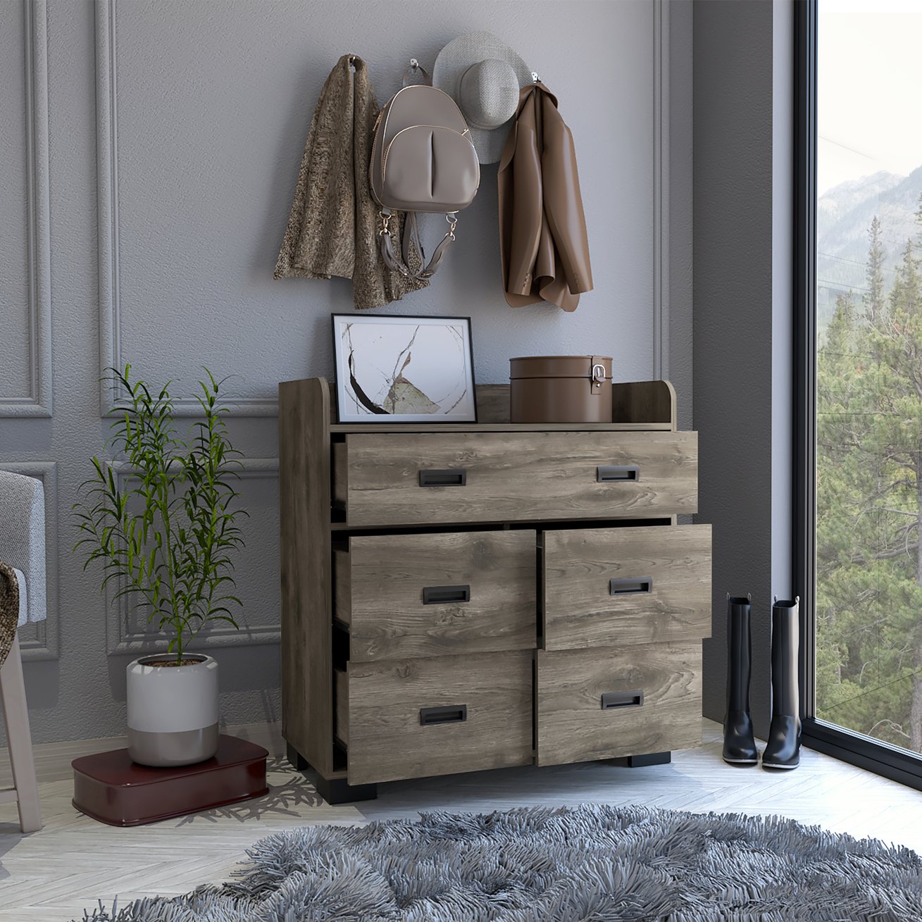 - Storage Layout: One double-width drawer plus four single drawers provide versatile organization for clothing, accessories, and small items