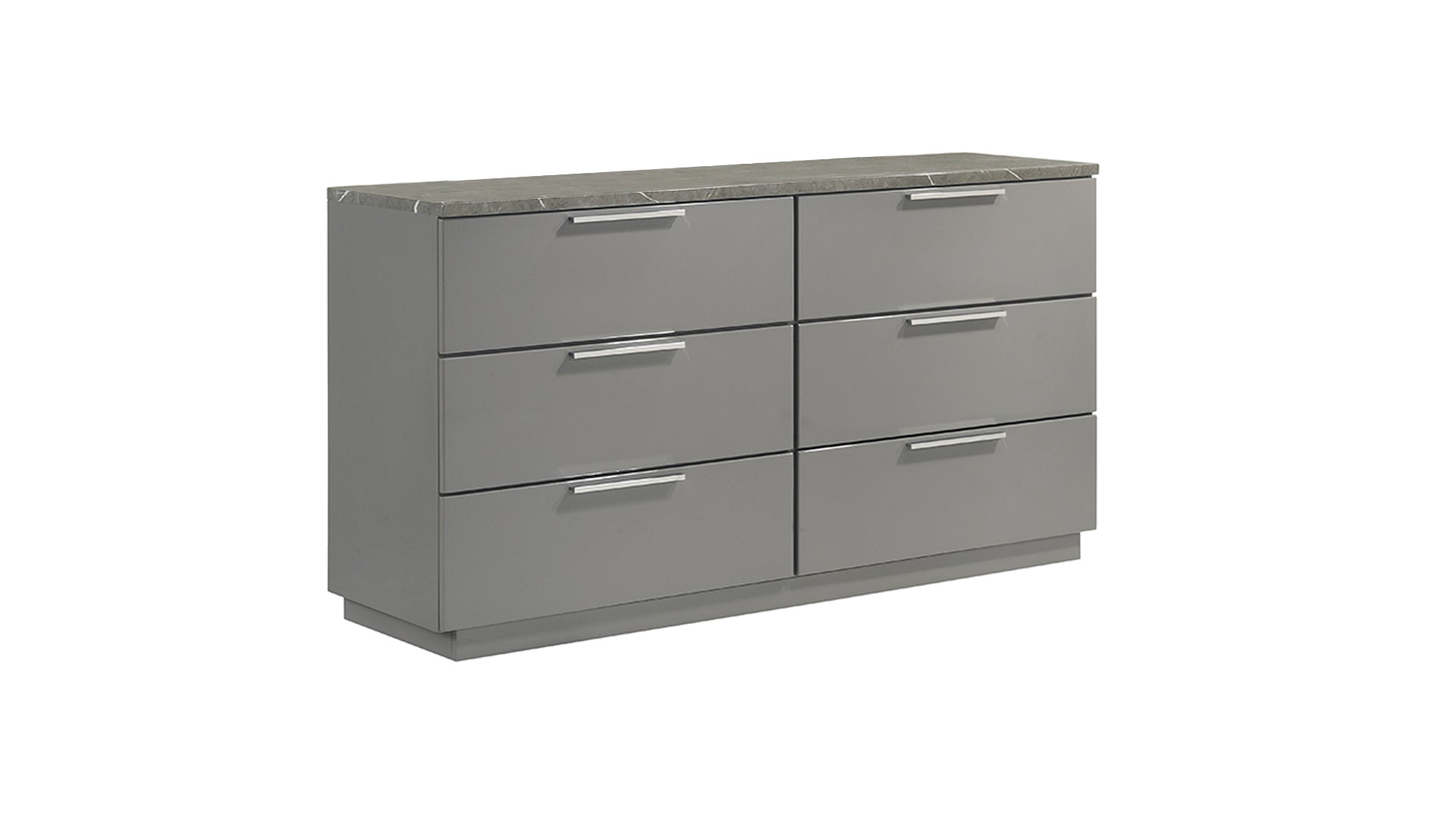 Transform your bedroom into a sleek, contemporary retreat with this refined dresser. Blending a luxe two-tone high-gloss marble and lacquer finish with clean lines and metal-finished legs, it delivers both striking visual appeal and everyday practicality. Thoughtful details—like full-extension drawer glides and velvet-lined top drawers—make organization effortless while protecting delicate items, so the piece looks as good as it functions.