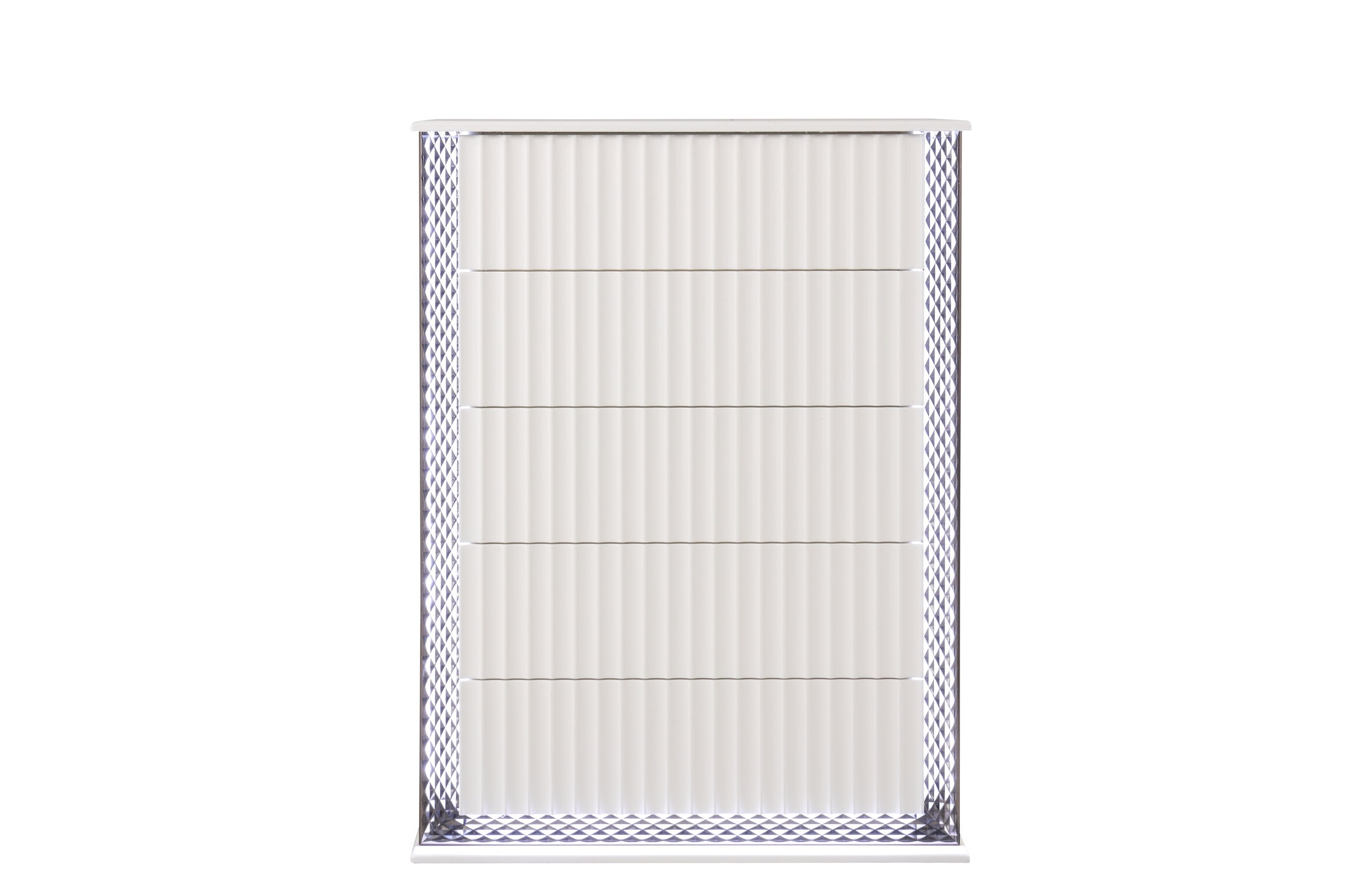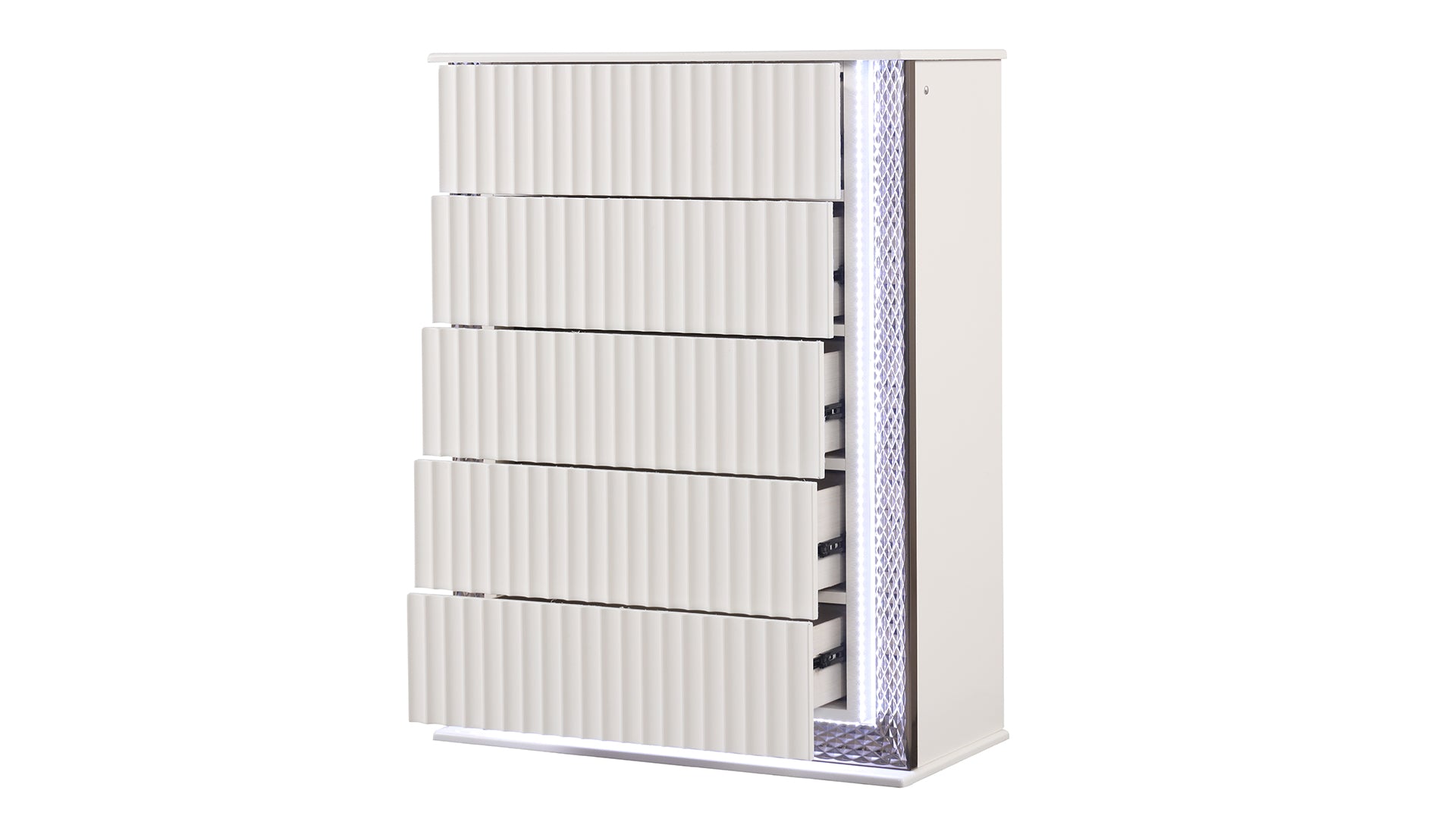 Elevate your bedroom with a striking blend of contemporary design and practical storage. This 5-drawer chest features textured fronts and refined diamond-patterned side accents, complemented by integrated LED side lighting that creates a warm, ambient glow—an ideal statement piece for modern interiors that also keeps essentials neatly organized.