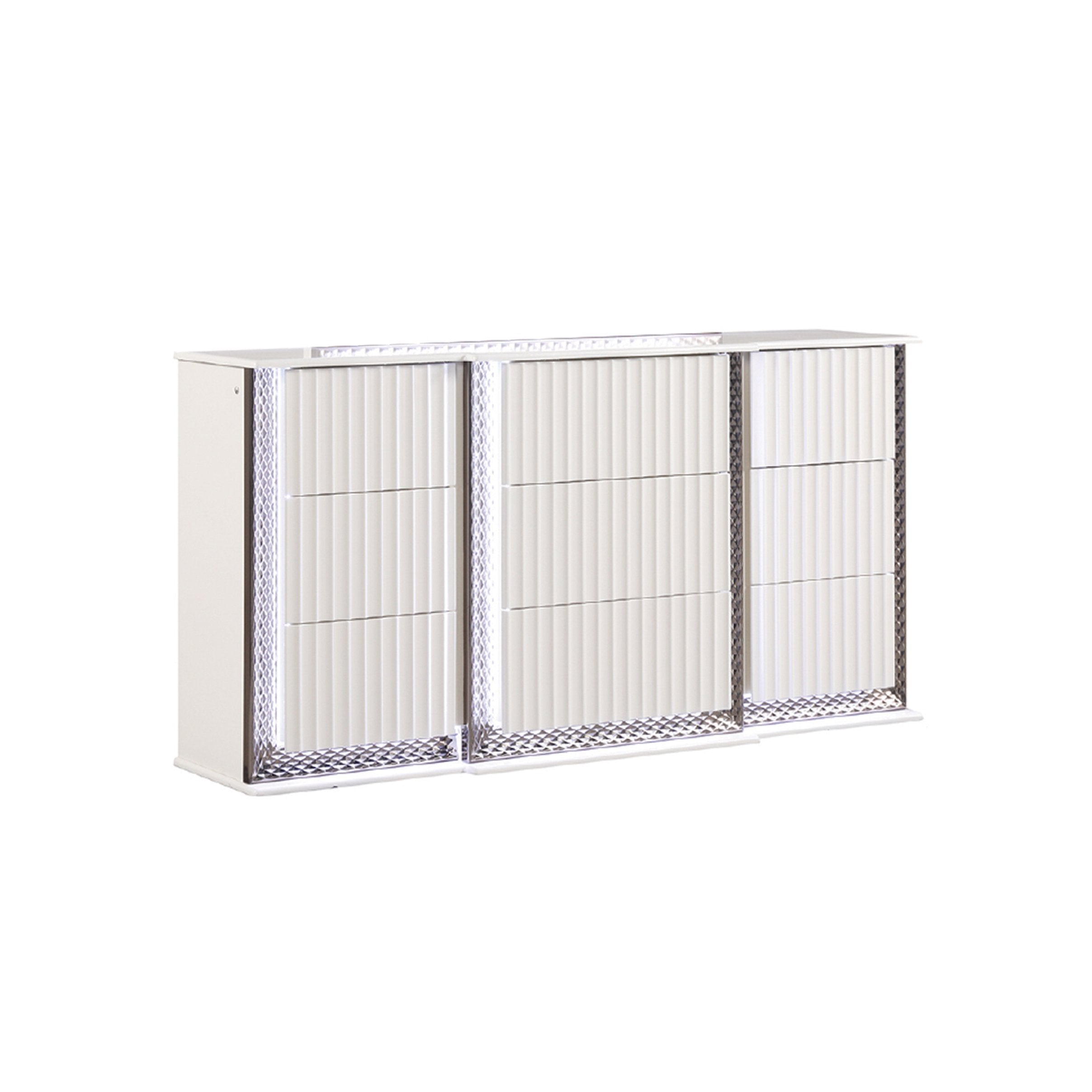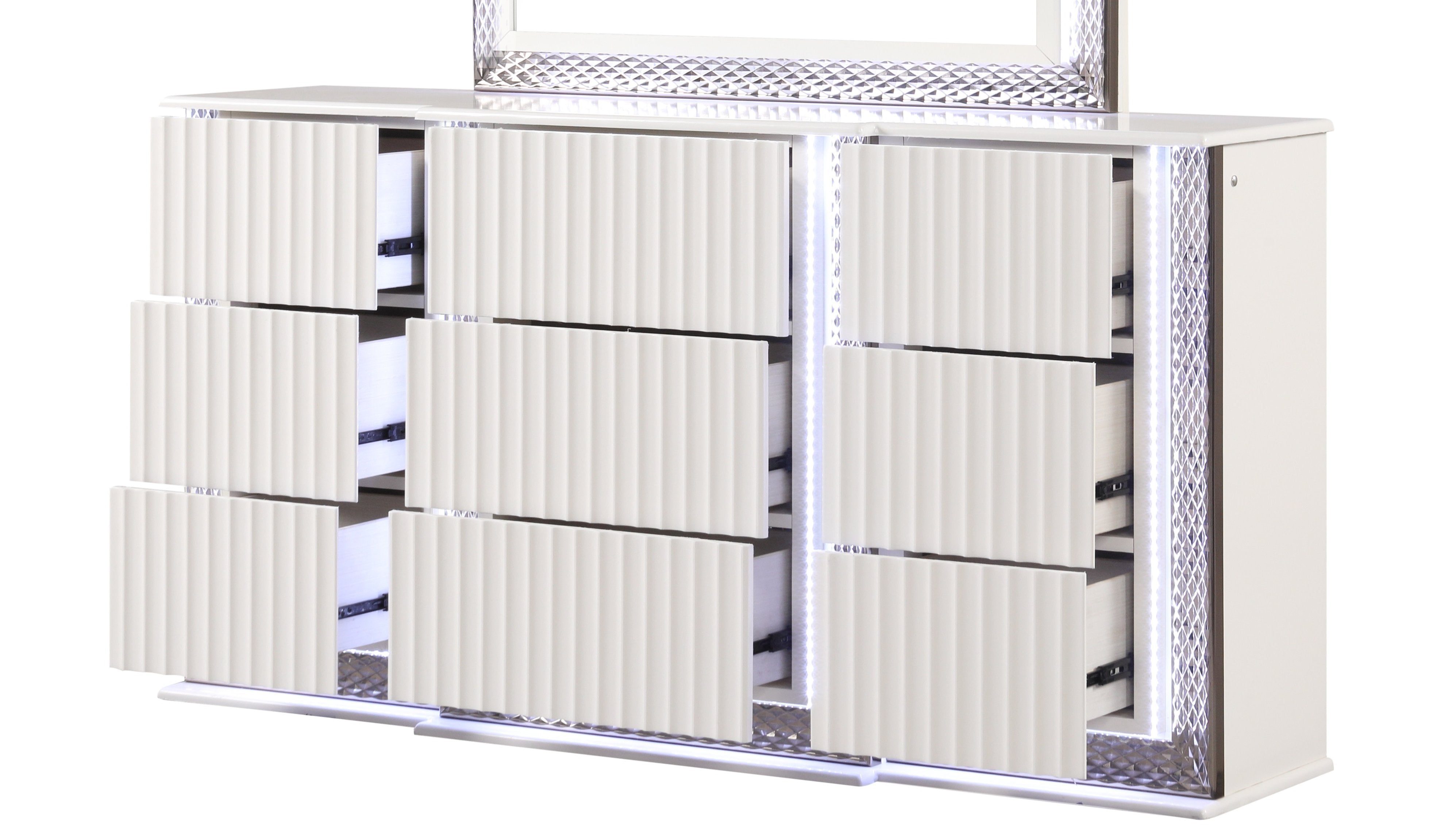 - Overall Design: Contemporary silhouette with textured drawer fronts and diamond-patterned side accents that incorporate integrated LED lighting for soft, ambient illumination.