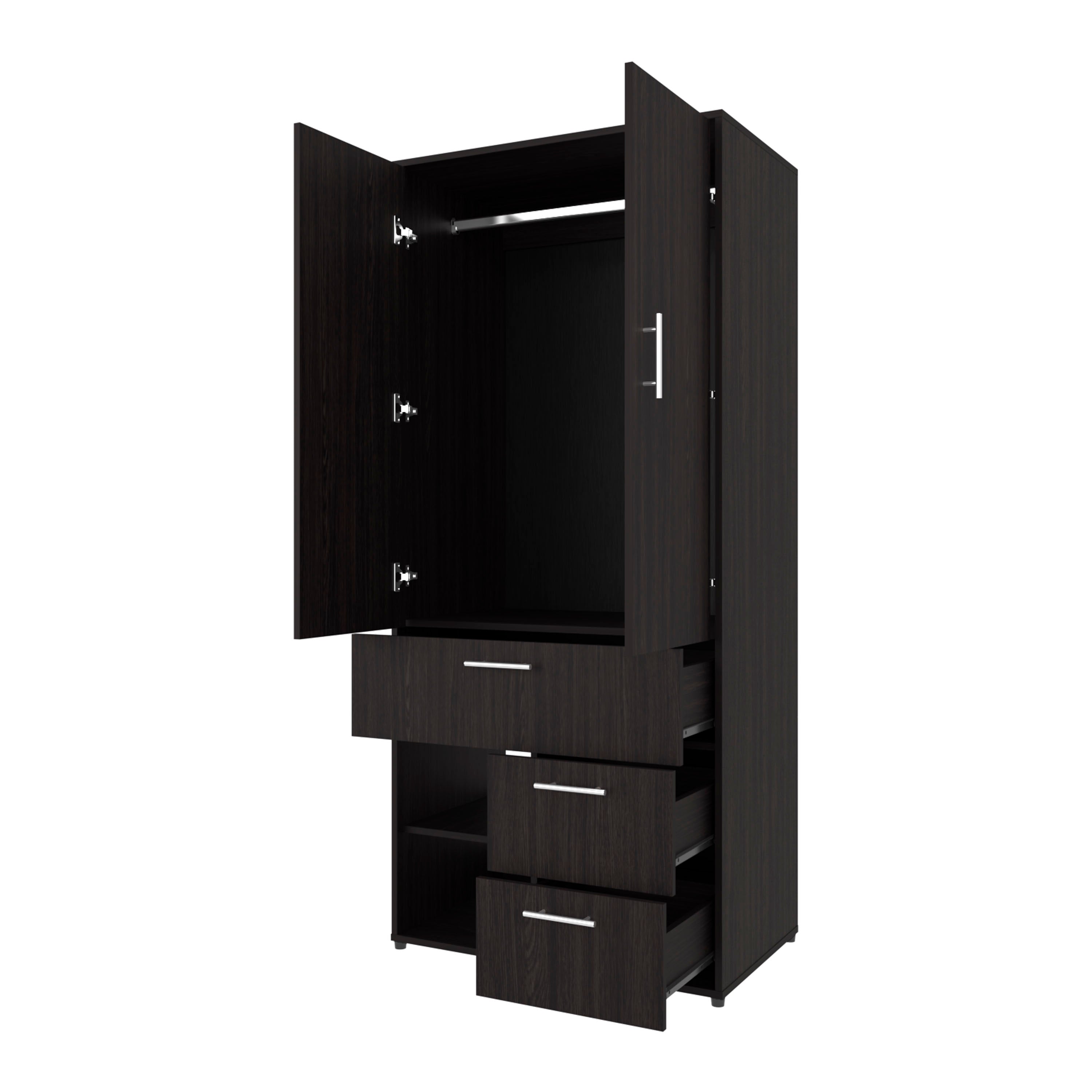 - Storage layout: Upper double-door cabinet with a sturdy hanging rod for shirts, jackets, and dresses; three smooth-glide drawers for folded items, accessories, or linens; open side shelves for shoes, baskets, or decorative pieces.