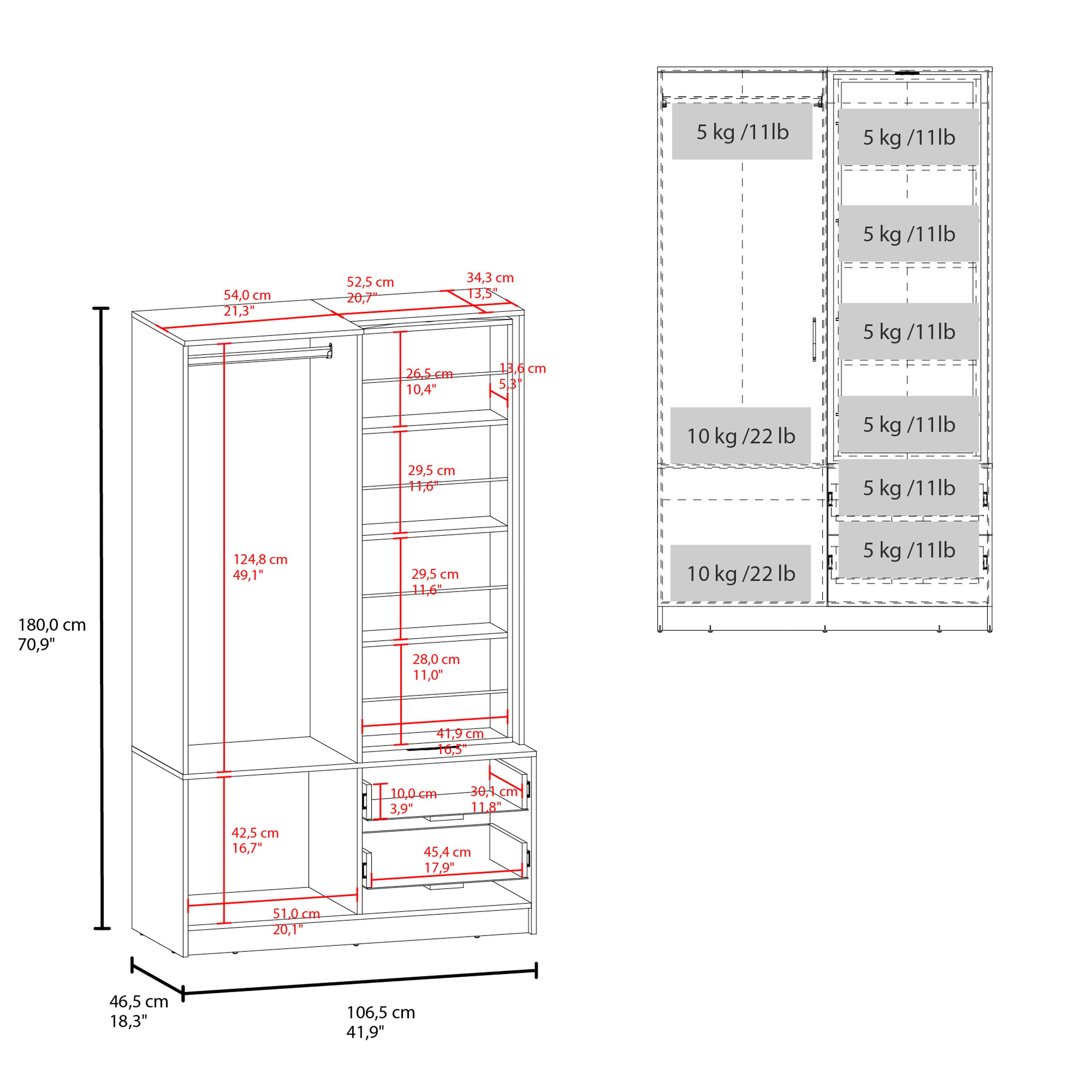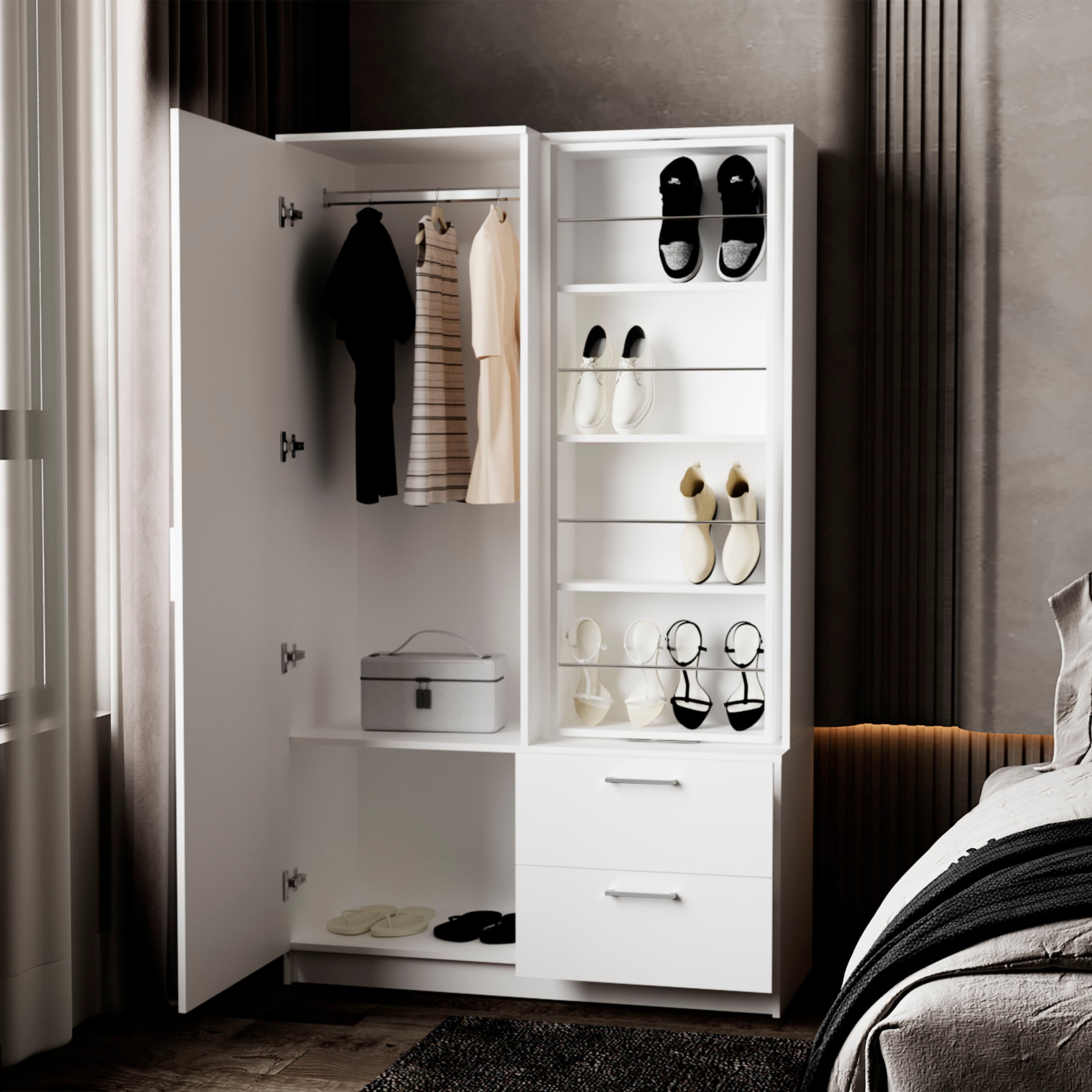- Functionality: Easy-access drawers with smooth operation and open shelving for visible storage and quick retrieval; double doors keep hanging items dust-free.