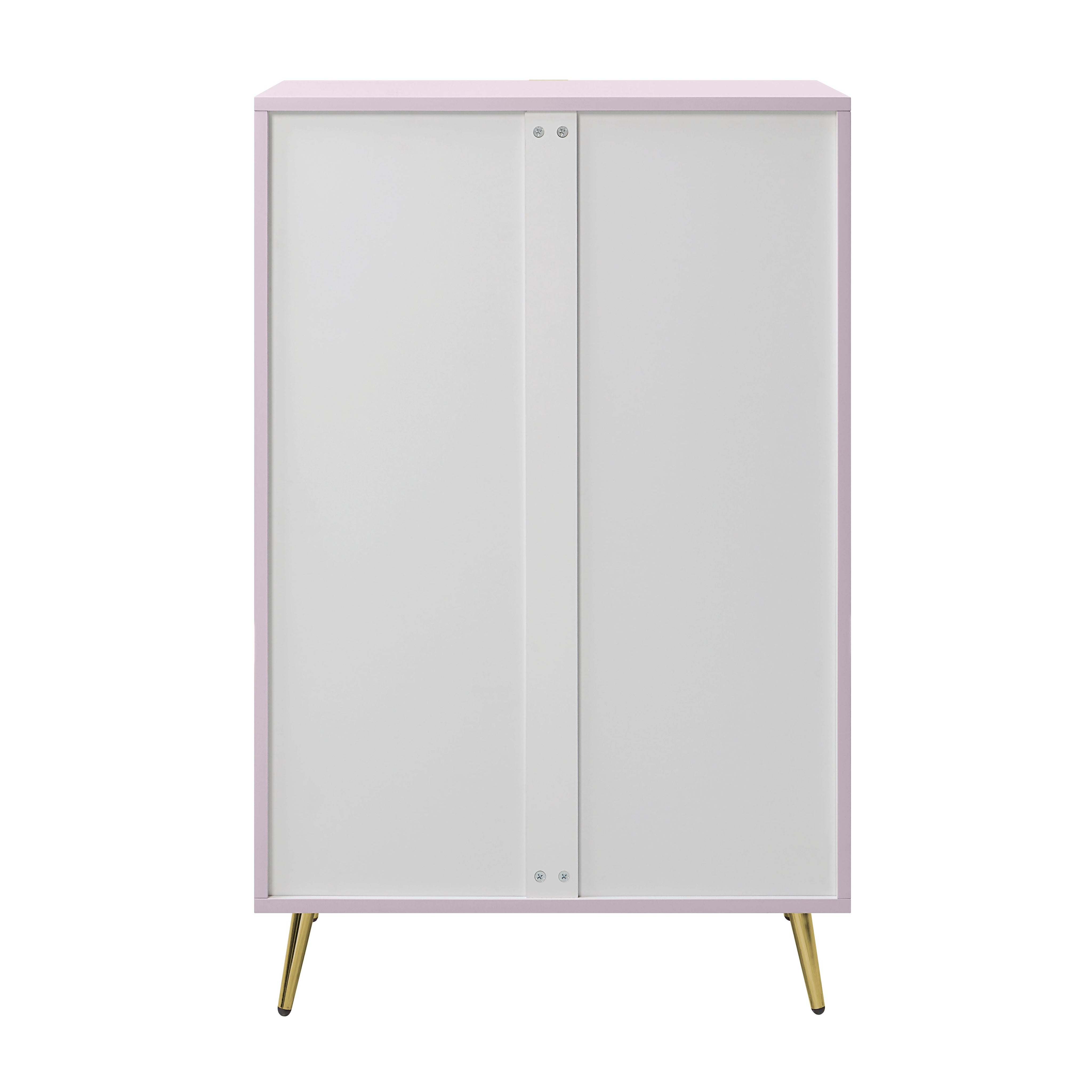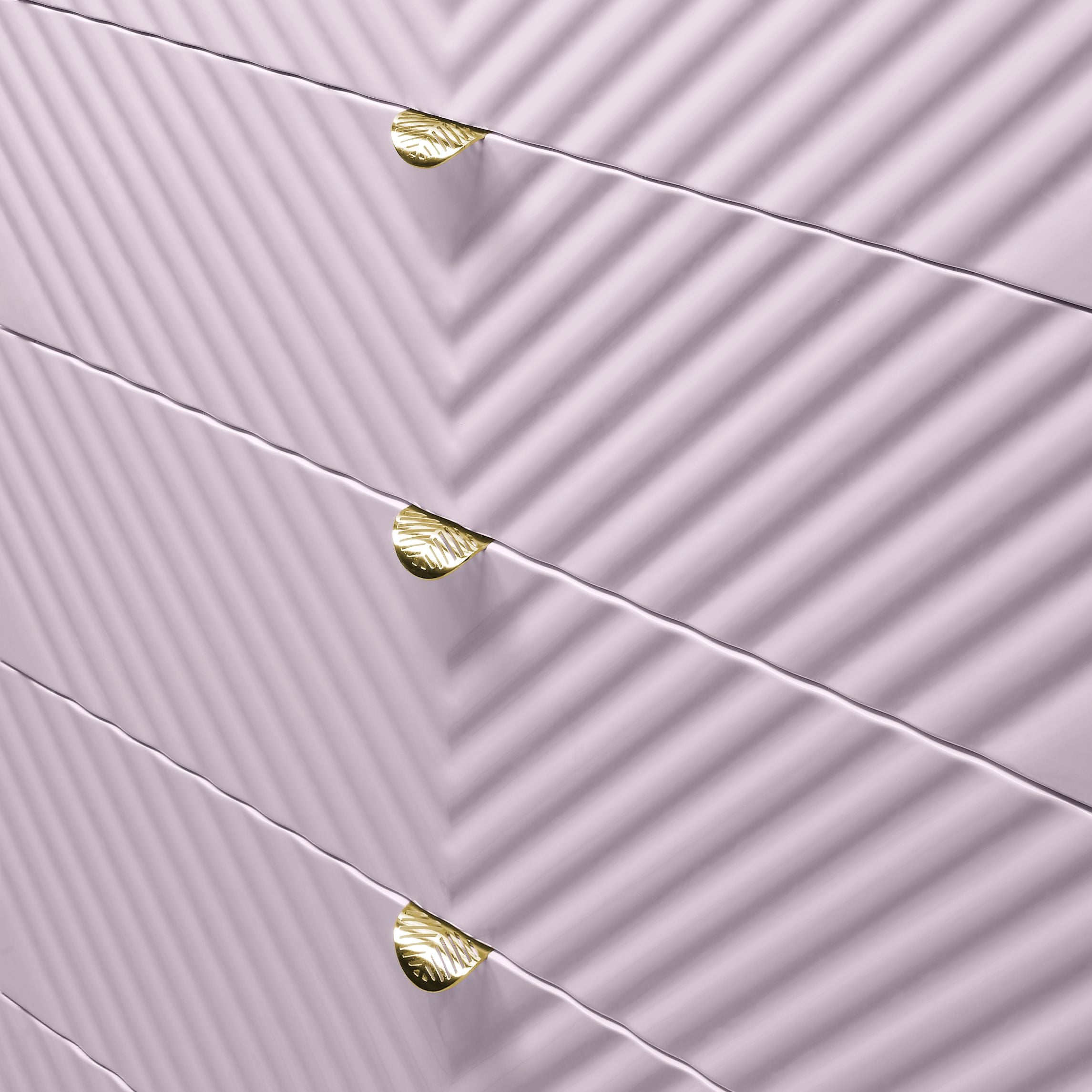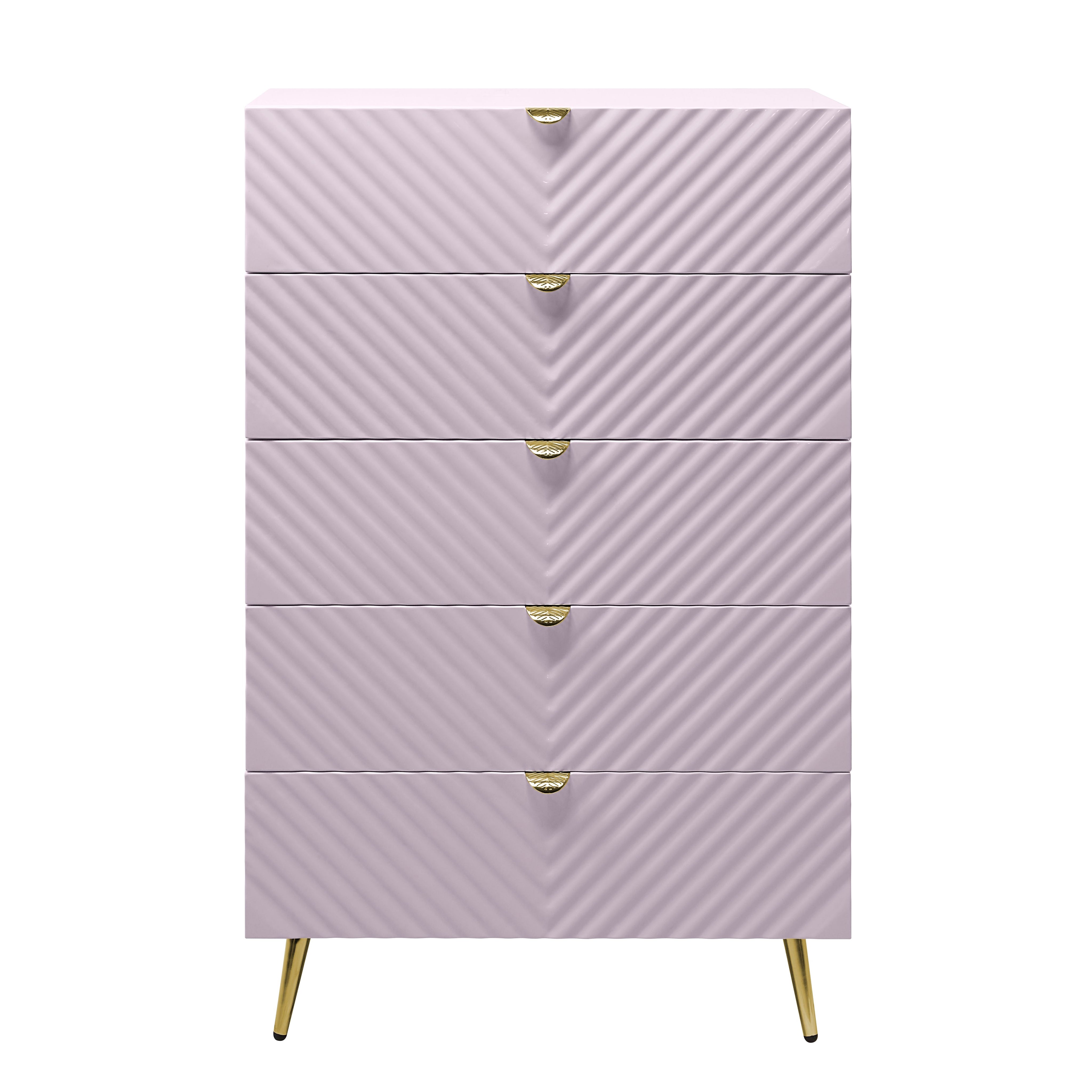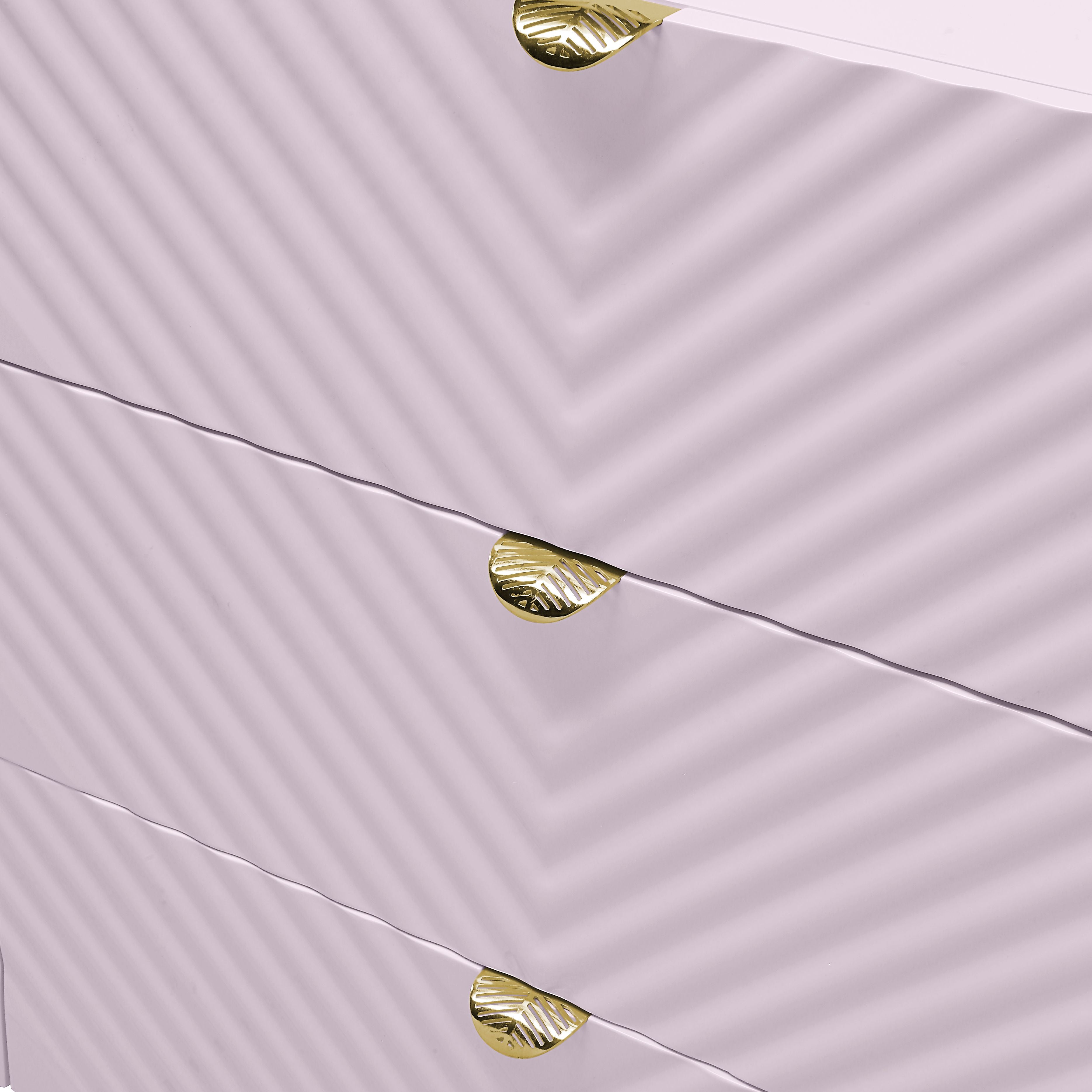 Give your bedroom a modern, feminine upgrade with the Gaines Pink High Gloss Finish Chest. Designed for everyday use and visual impact, this compact chest combines a reflective high-gloss surface, subtle wave-pattern drawer fronts, and durable metal accents to deliver both style and storage. Its thoughtfully sized drawers and sturdy construction make it ideal for organizing clothing, linens, and personal items while complementing contemporary or transitional decor.