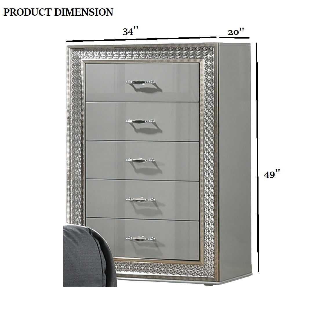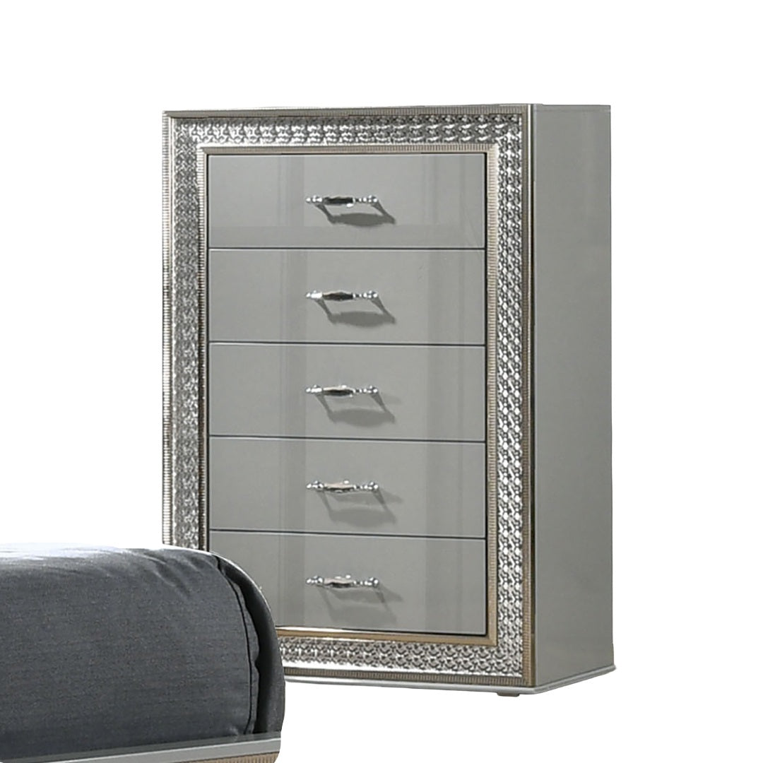 Elevate your bedroom with a glamorous, contemporary chest that combines luxe detailing with practical storage. This metallic gray 5-drawer chest features scale-pattern molding and polished metal handles for a refined look, while felt-lined tops protect jewelry and delicate items. Built with mixed solid and engineered woods, it offers lasting durability and everyday functionality.