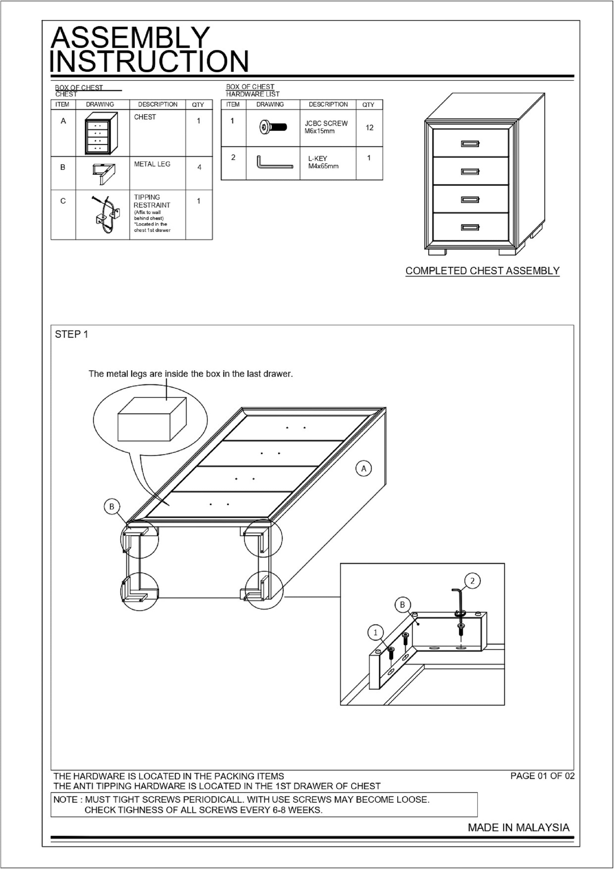 - Includes: 1pc chest (four-drawer unit). Hardware and drawer assembly included as required.