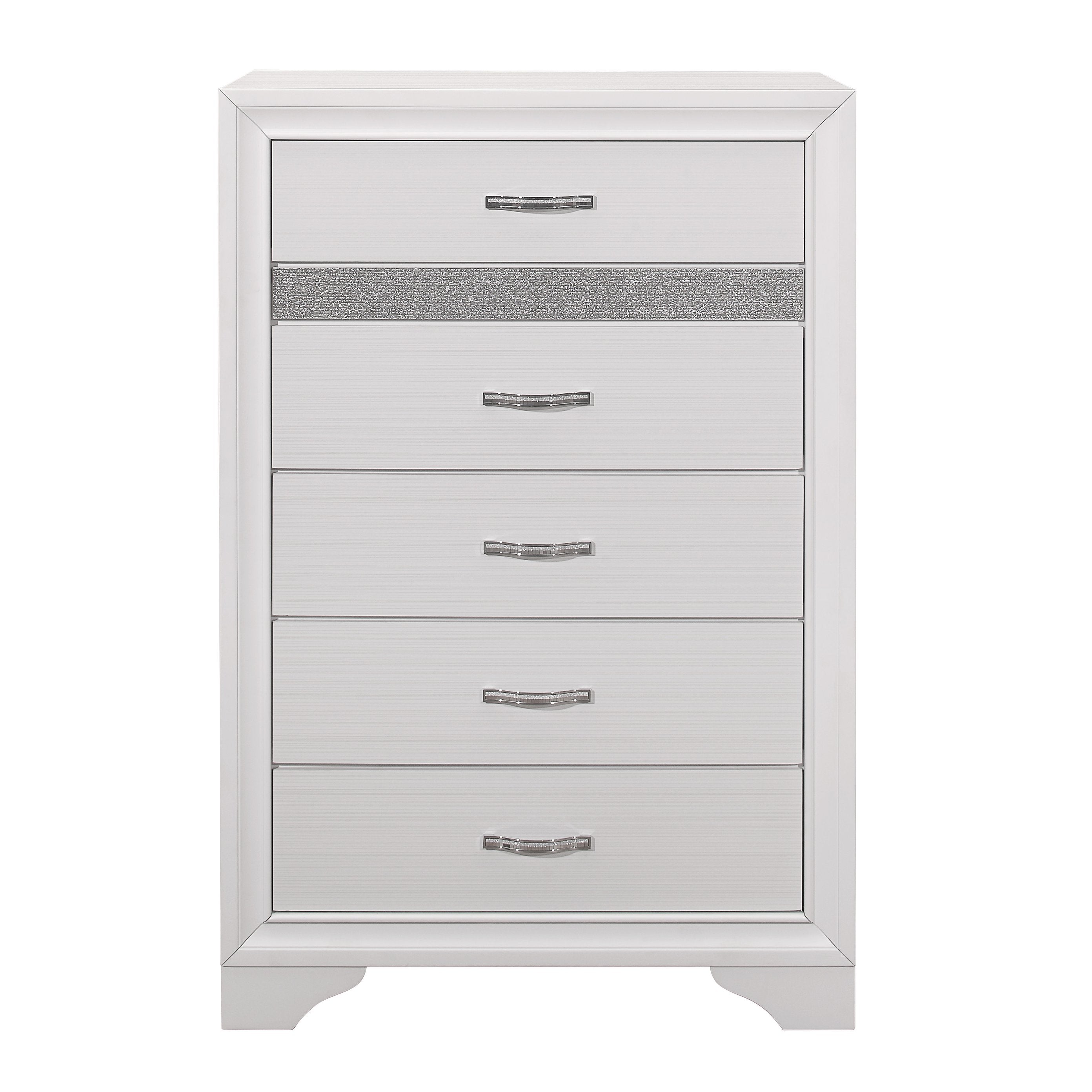 Bring a touch of Hollywood glam to your bedroom with this Luster Collection chest of drawers. Clean white faux-wood veneer is paired with acrylic silver-glitter accents and polished chrome bar pulls for an elegant, modern look. A concealed felt-lined jewelry drawer protects valuables while the spacious lower drawers keep clothing and linens neatly organized. Solid construction and a reflective, shimmering front make this chest a statement piece that balances sparkle with everyday functionality.