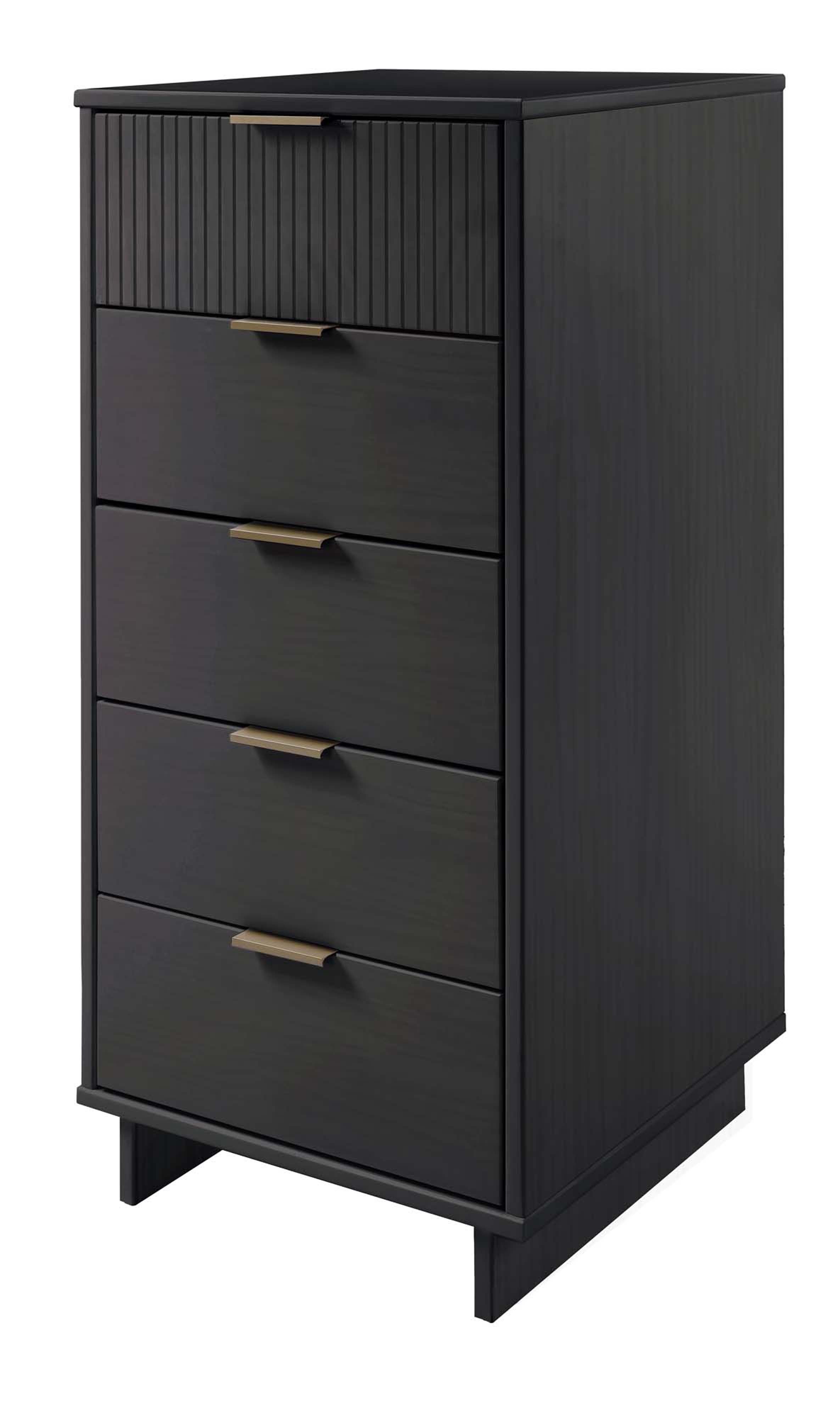 An elegant and functional storage solution, this Granville 5-drawer chest in charcoal gray blends contemporary design with solid construction to elevate any bedroom or living space. Its textured top drawer, gold-finish handles, and sturdy solid-wood build offer a refined look while providing practical organization for clothing, accessories, and media components.
