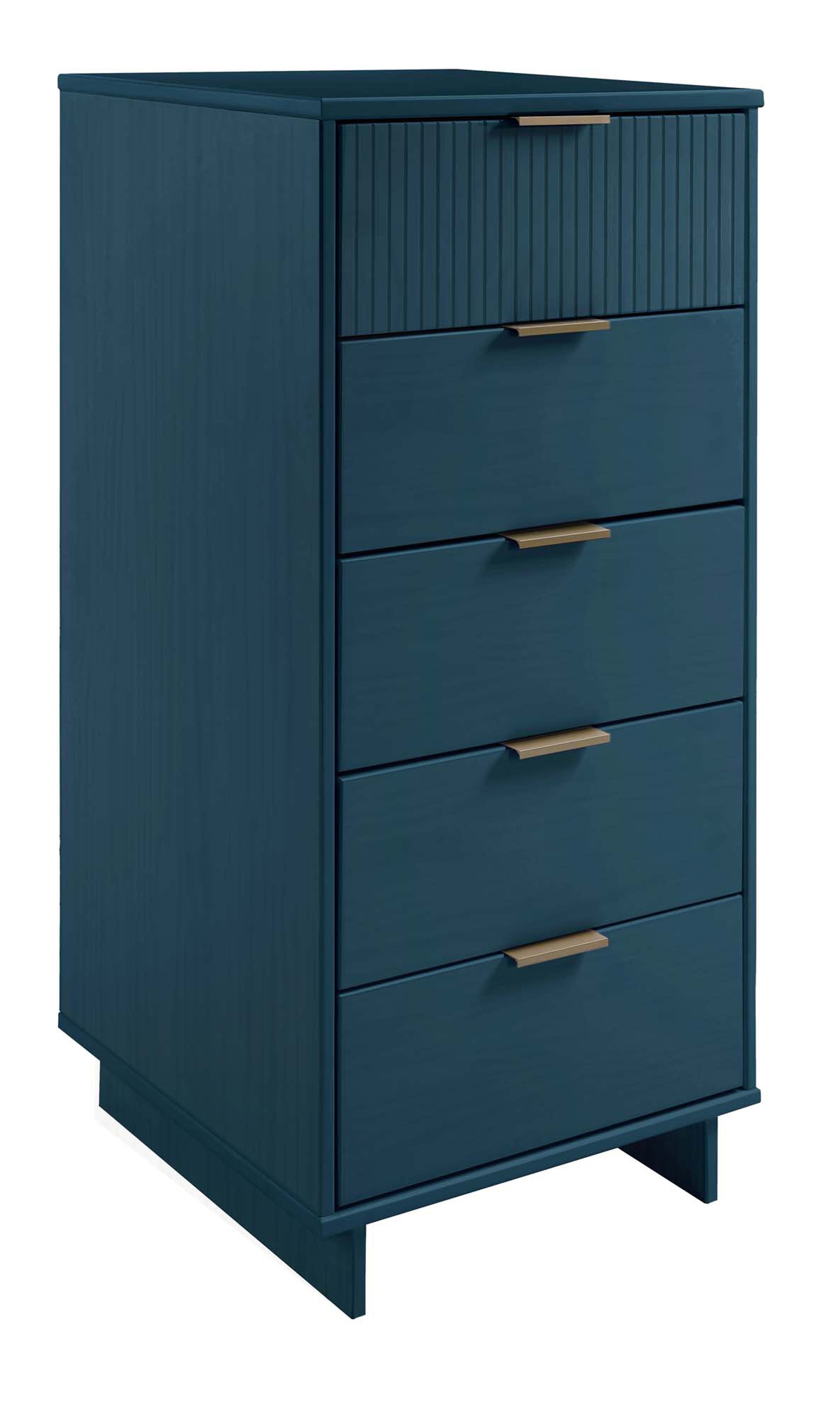 Bring classic craftsmanship and contemporary flair to your bedroom or living area with this elegant five-drawer chest finished in a rich midnight blue. Built from solid wood with thoughtful details—textured ribbed top drawer, gold-finished horizontal handles, and an open mop-base—this piece offers refined storage and a strong silhouette that complements modern and transitional interiors.