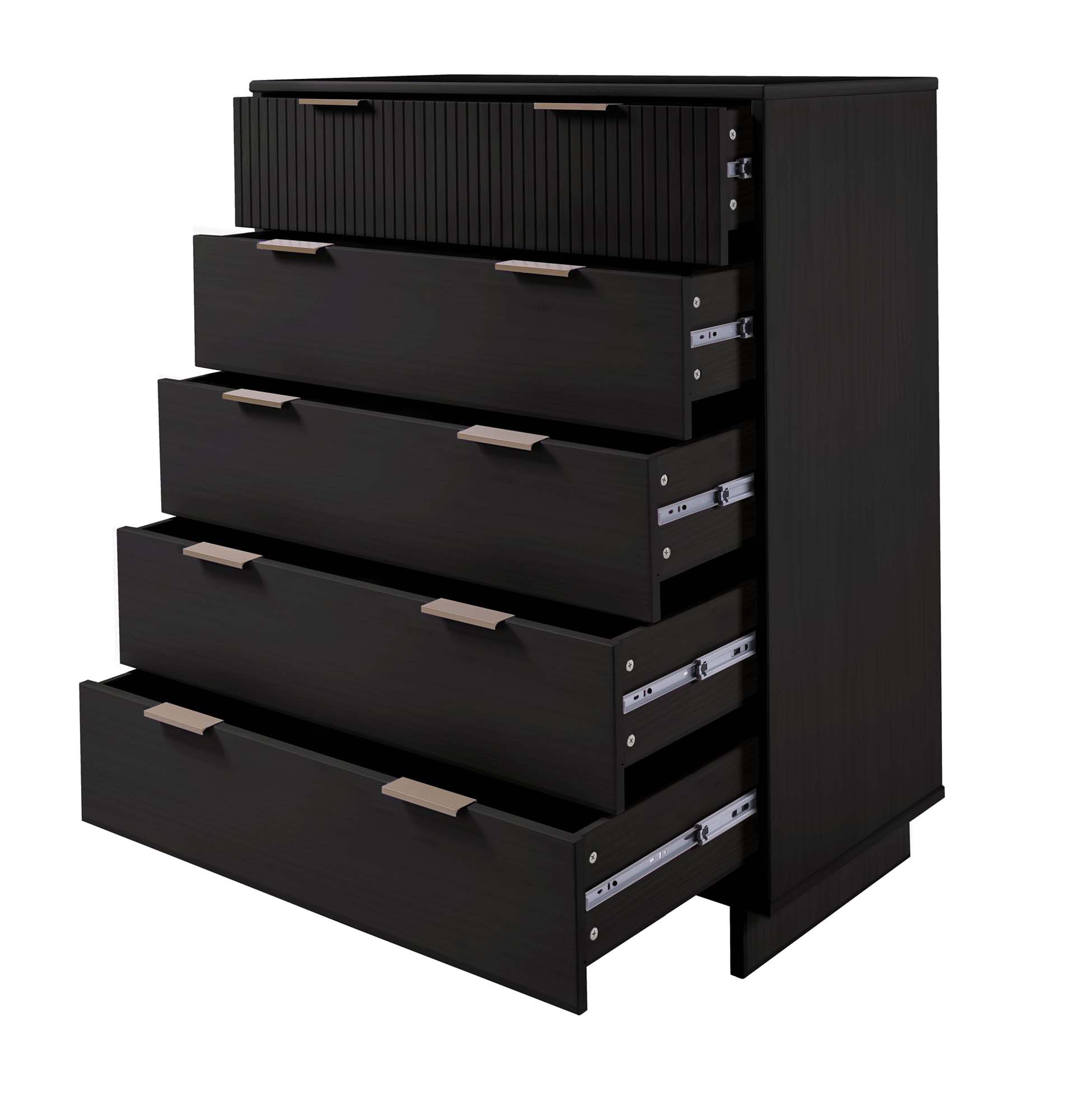 - Storage: Five full-extension drawers for easy access and maximum storage capacity; top drawer features vertical textured ribbed front for added visual interest.
