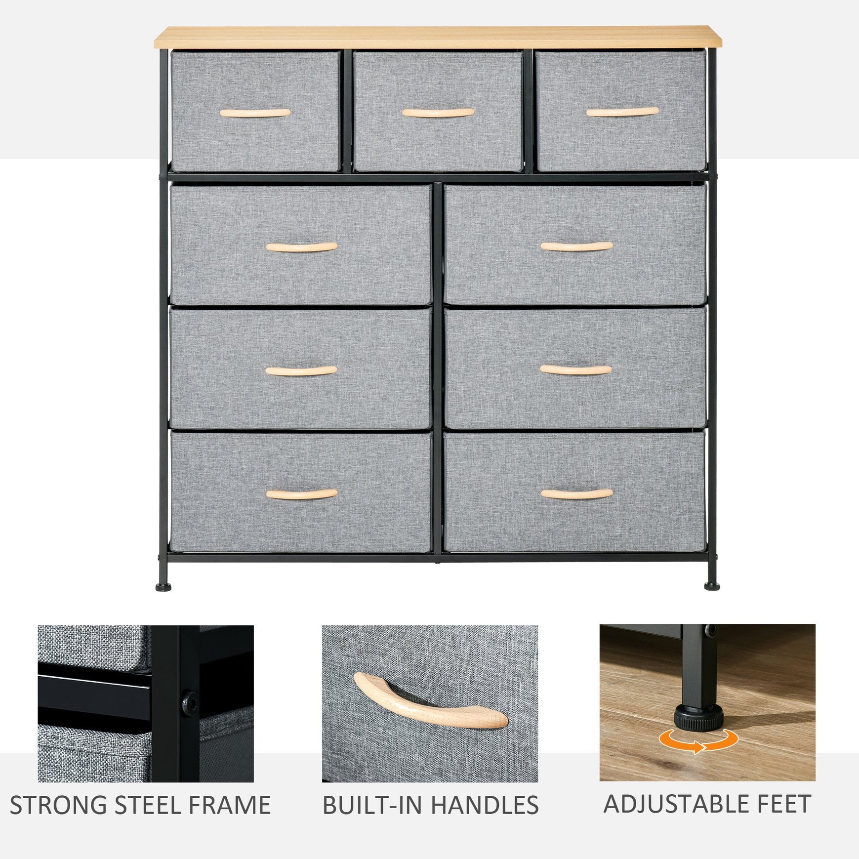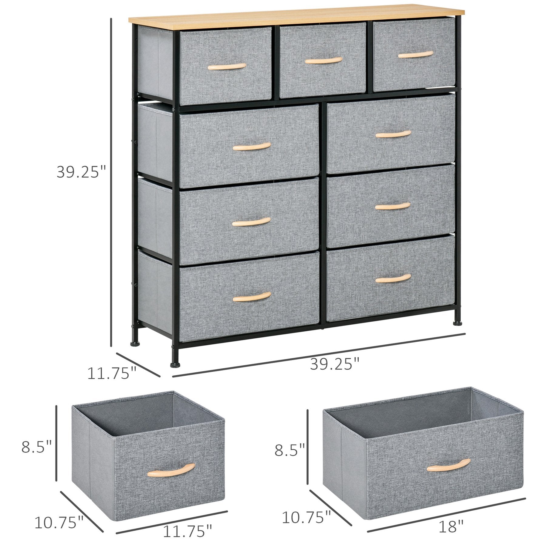 Keep your home tidy and stylish with this versatile 9-drawer storage chest. Combining a sturdy steel frame with a wood top and easy-pull fabric bins, this organizer provides practical, attractive storage for bedrooms, entryways, hallways, closets, nurseries, and more. Lightweight yet stable, it offers a hard surface for display and foldable drawers for convenient transport or seasonal storage.